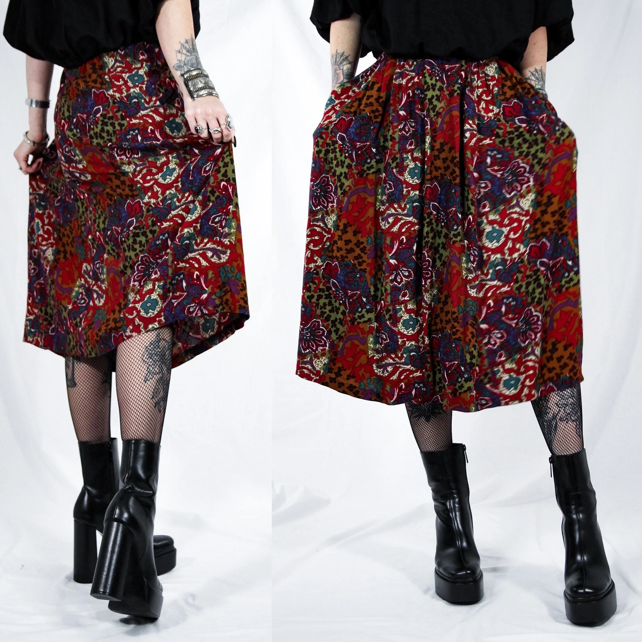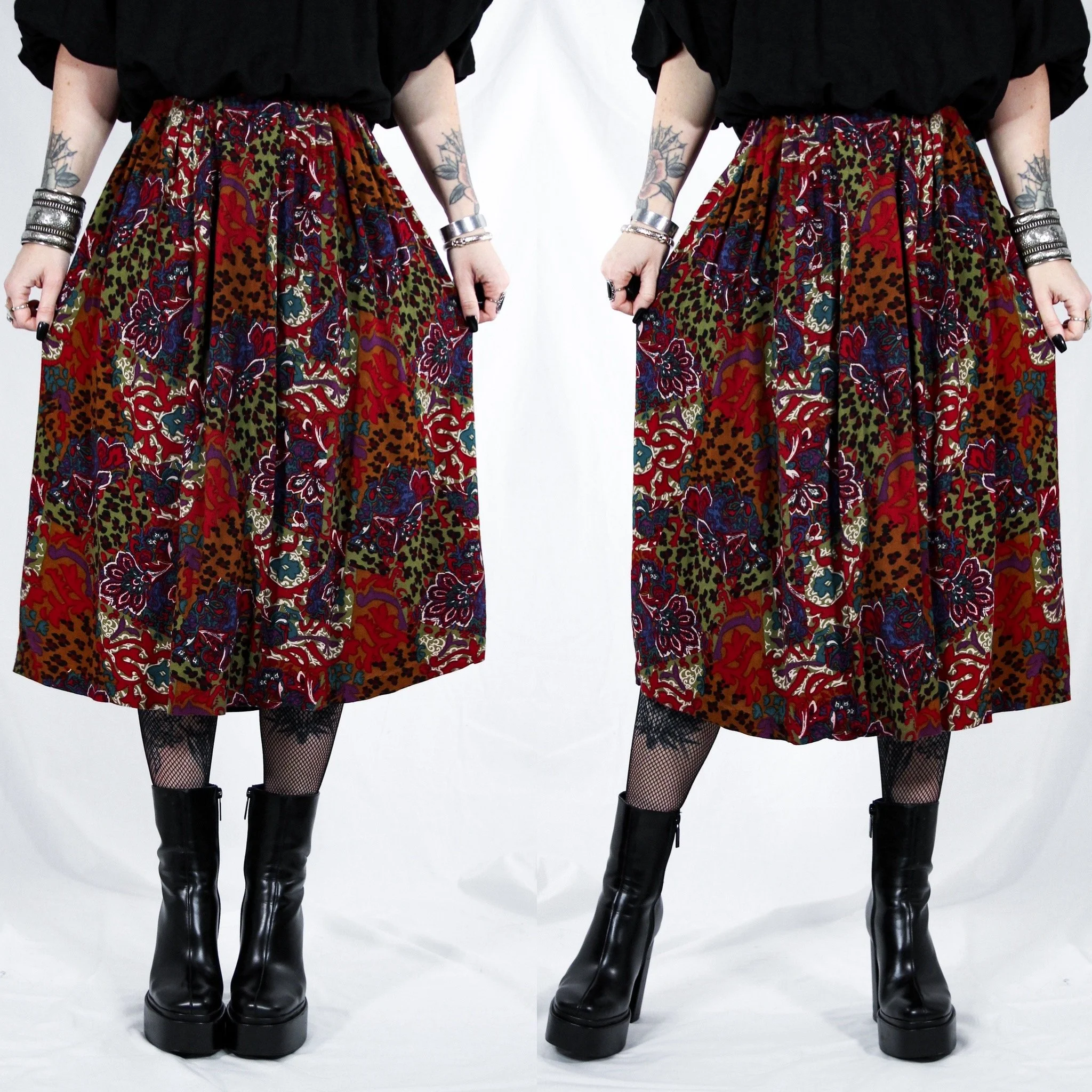 Vintage 90s Christine David (made in USA) midi skirt. Fun, crazy print with a mix of cheetah, paisley and floral in jewel tones with black. And SHE HAS POCKETS! Flowy A-line cut Fabric is a light, ultra-soft 100% rayon - feels like your softest t-shirt but with lots more movement and draping. Unlined, no stretch other than the elastic at the back of the waist. Side flap closure with a button at the top.