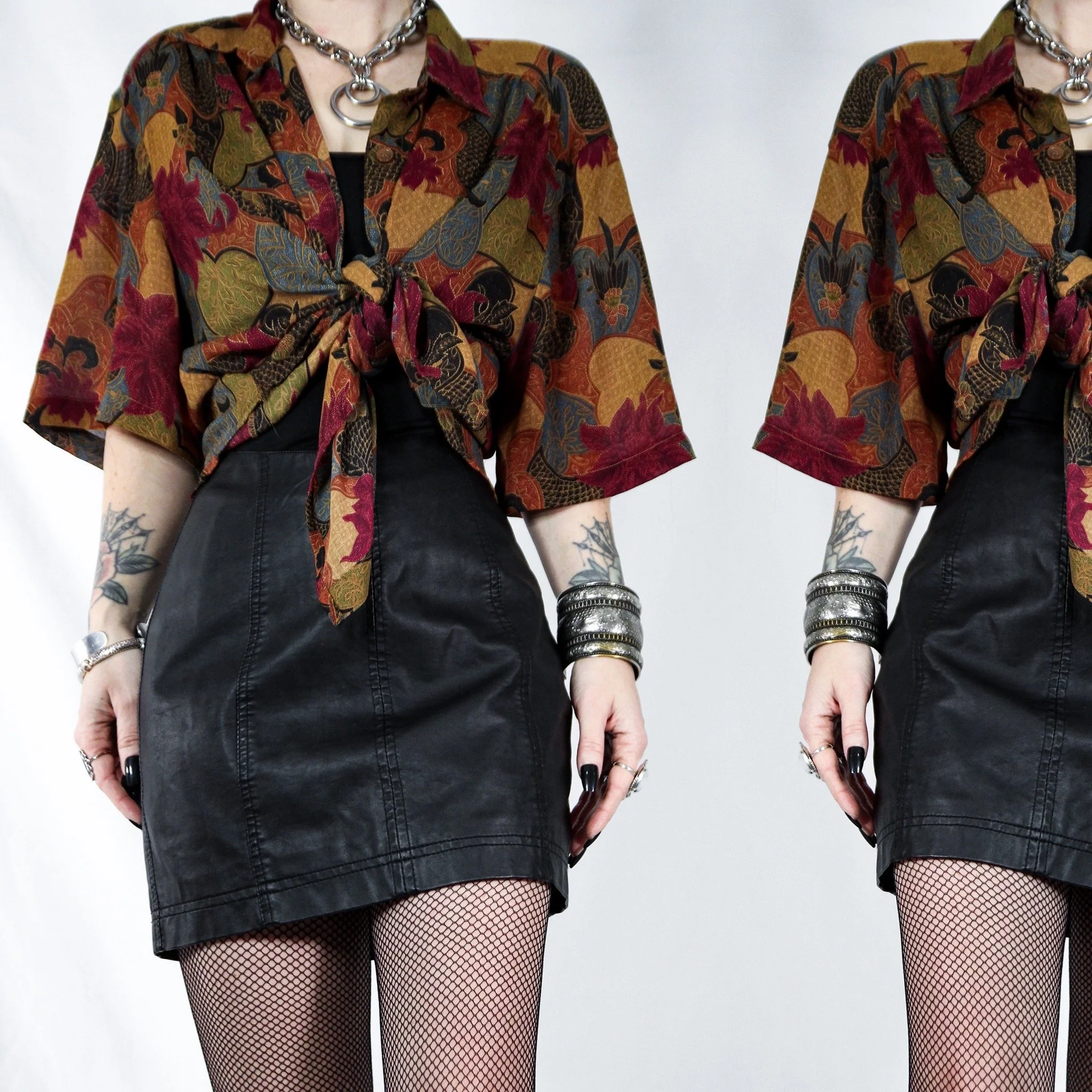 Wear it loose and flowy as a top layer, knotted up at the waist, or buttoned up and tucked in! Boxy cut. Original shoulder pads intact but they can be easily removed.