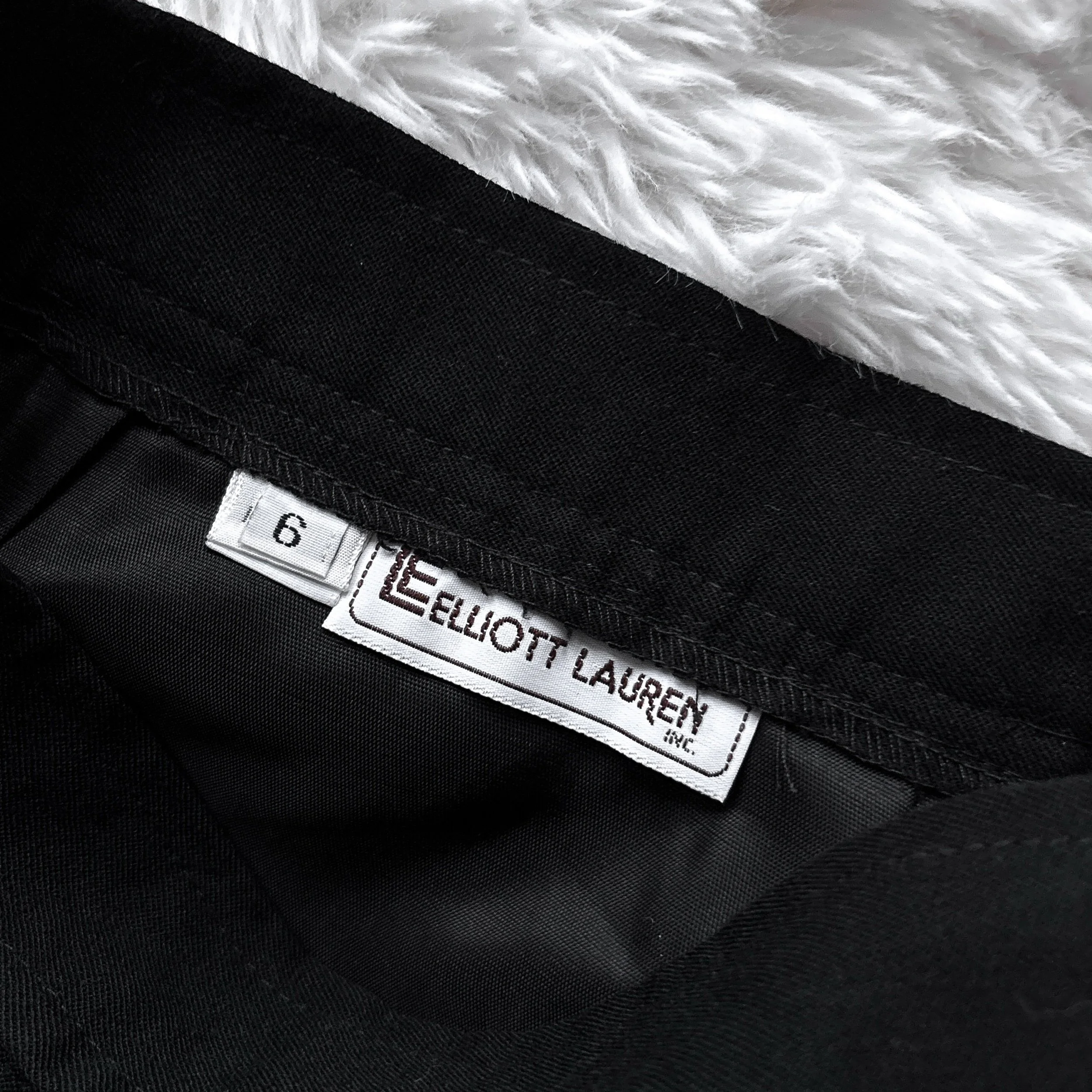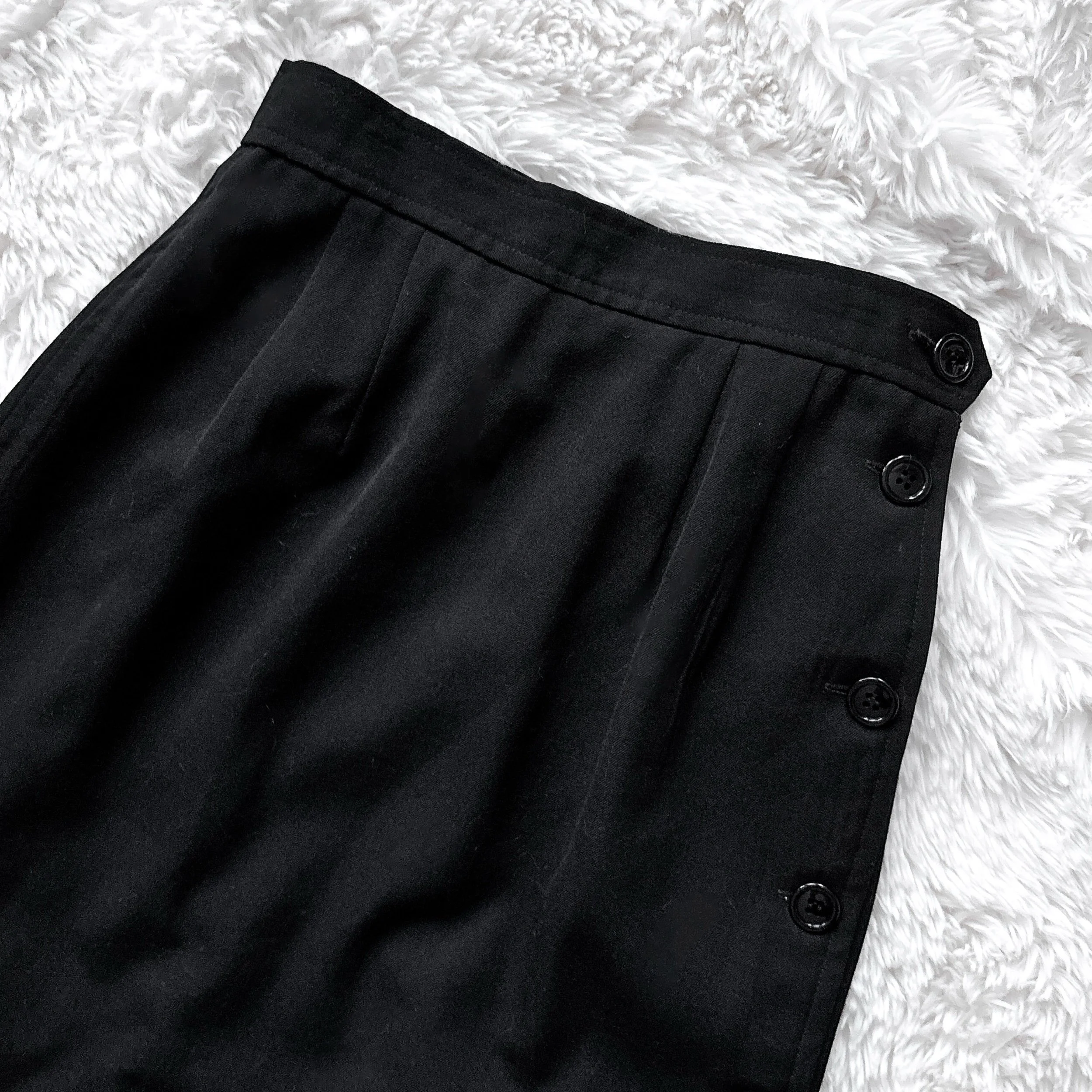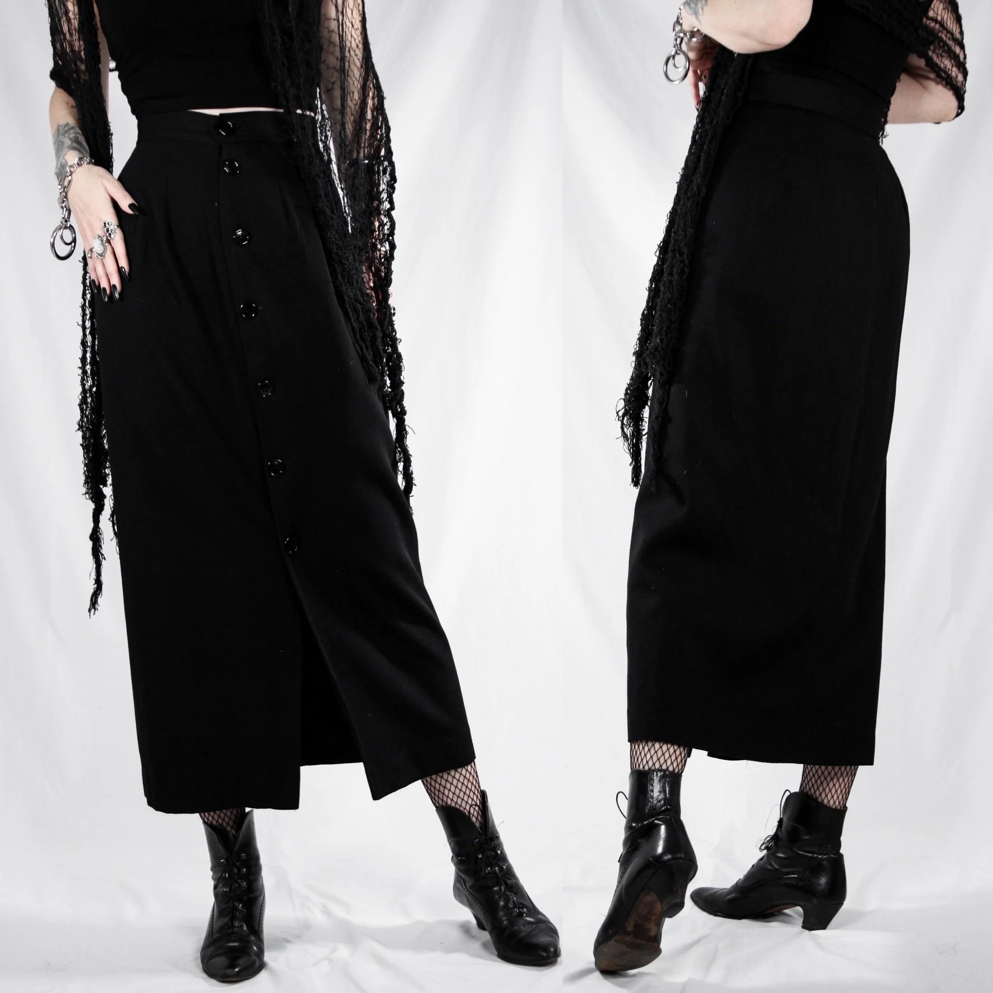 Vintage 80s Elliott Lauren wool suit skirt. Classic and comfortable, the ultimate dark staple piece, especially for the corporate goths! Functional buttons all the way up the front, buttons can also be worn to the side. Straight pencil cut, calf length. Soft, perfectly-broken-in wool blend AND fully lined in black poly satin so its soooo warm and cozy for winter, but no itch! No stretch. Surprisingly comfortable, not stiff like many vintage wool skirts.