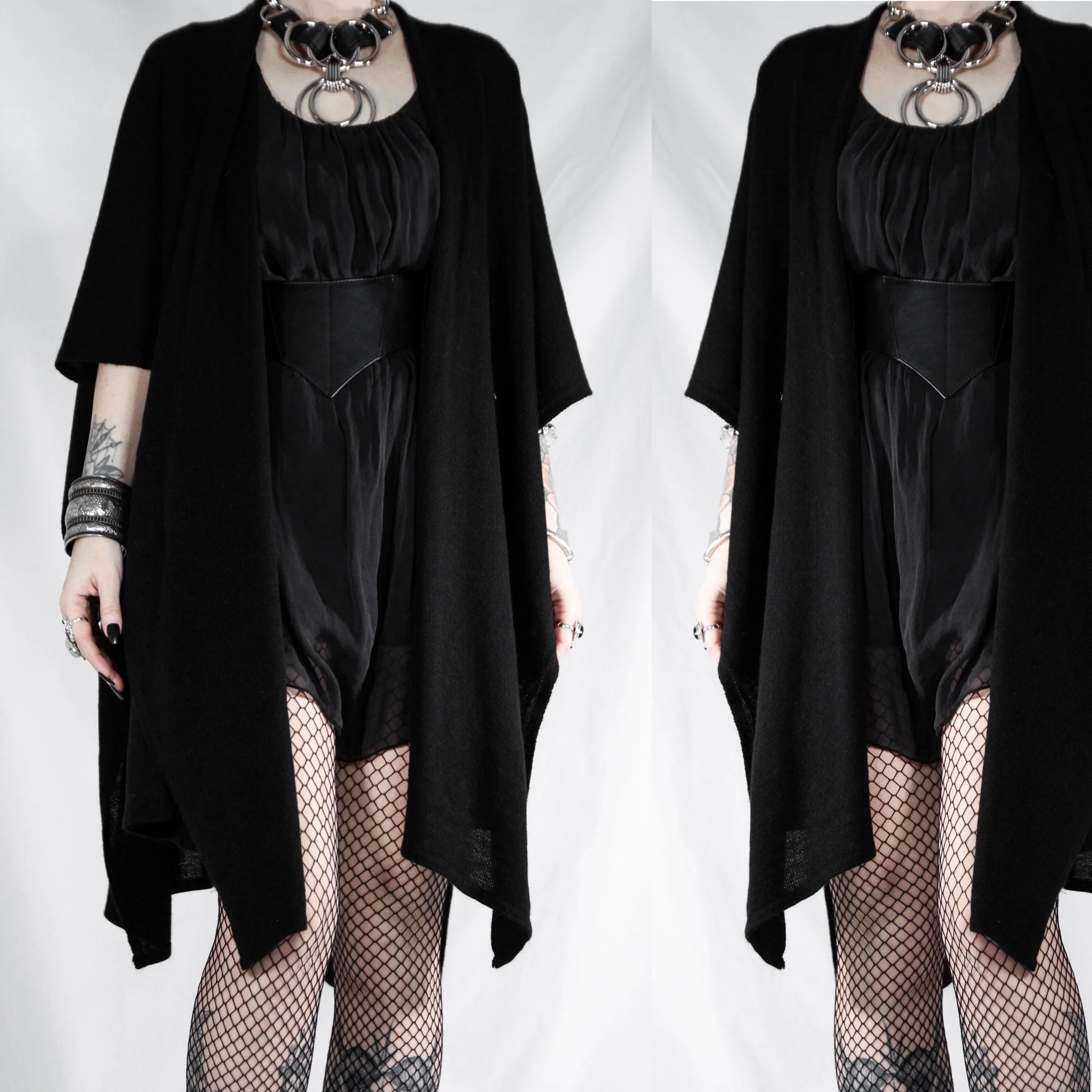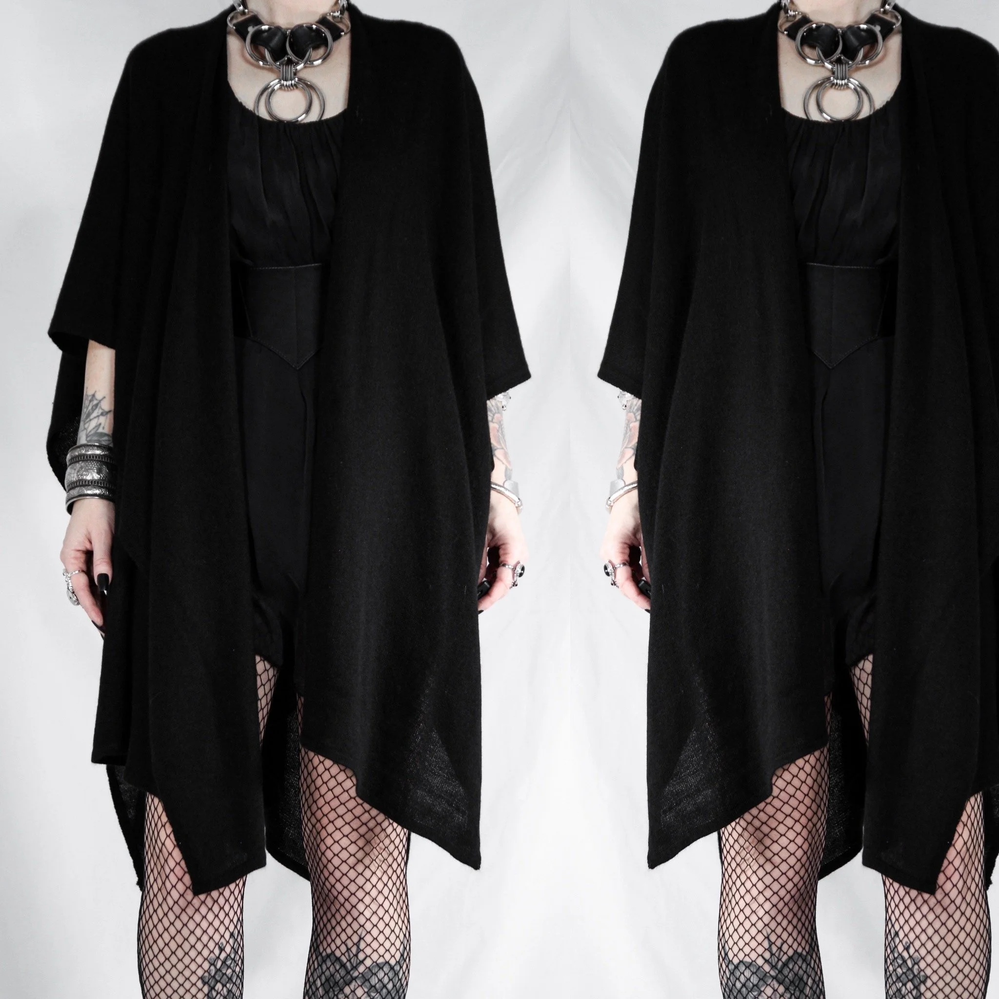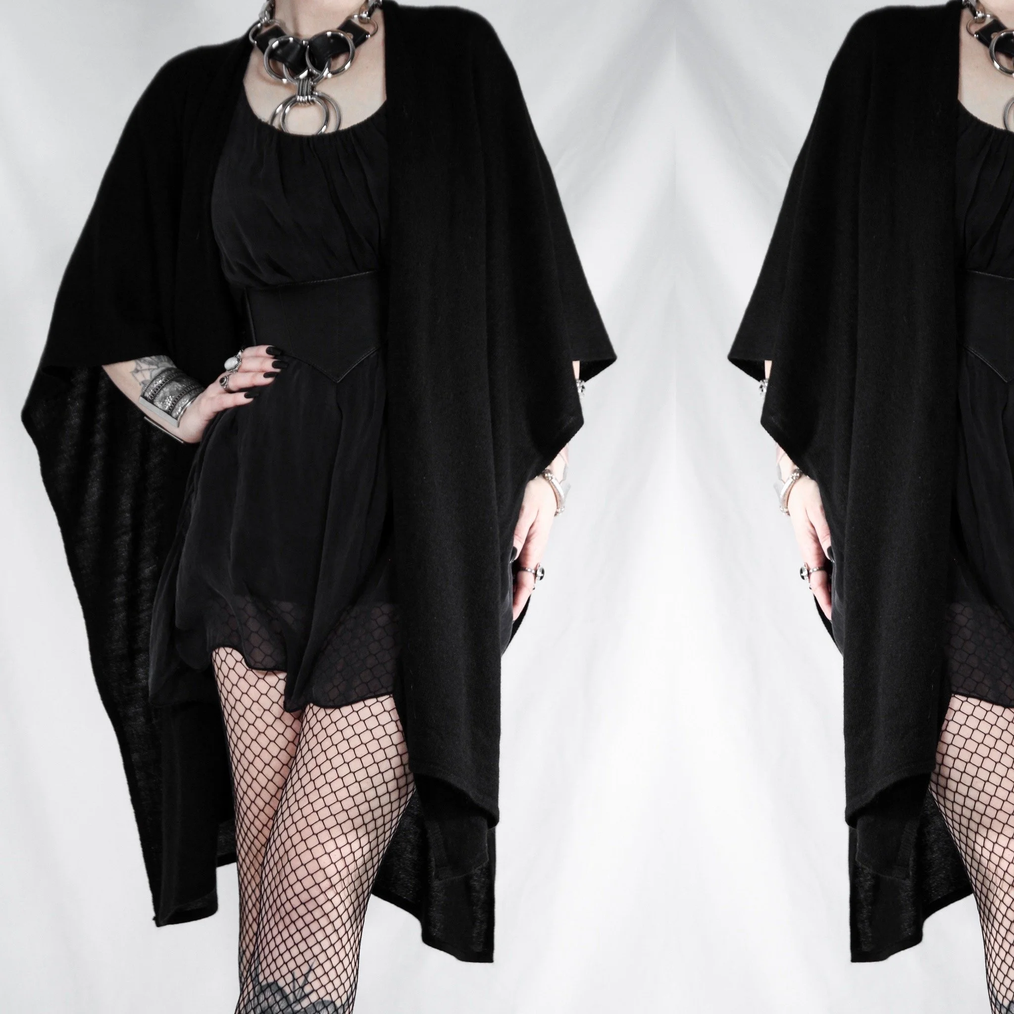 Vintage 90s open-front batwing cardigan. This is a Last Rites signature piece! Draped shawl style with no defined sleeves, oversize and dramatic. 100% acrylic rib knit, super soft with no itch factor unless you’re sensitive to synthetics. Much lighter, softer and more flowy than most of our other shawls.