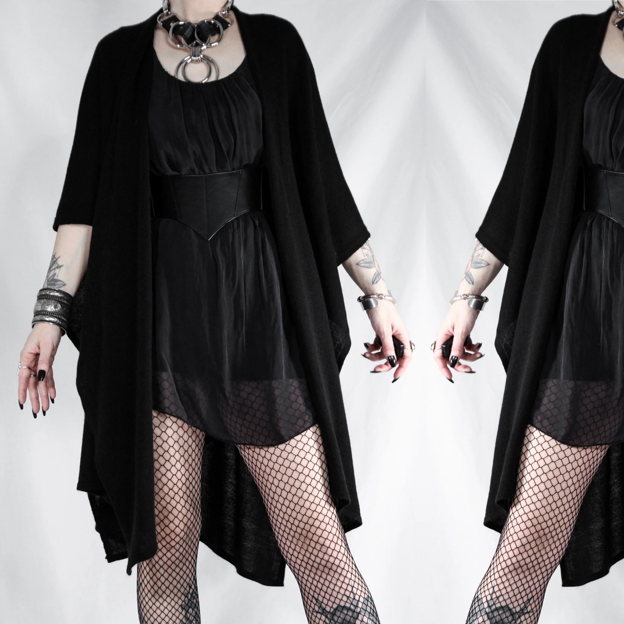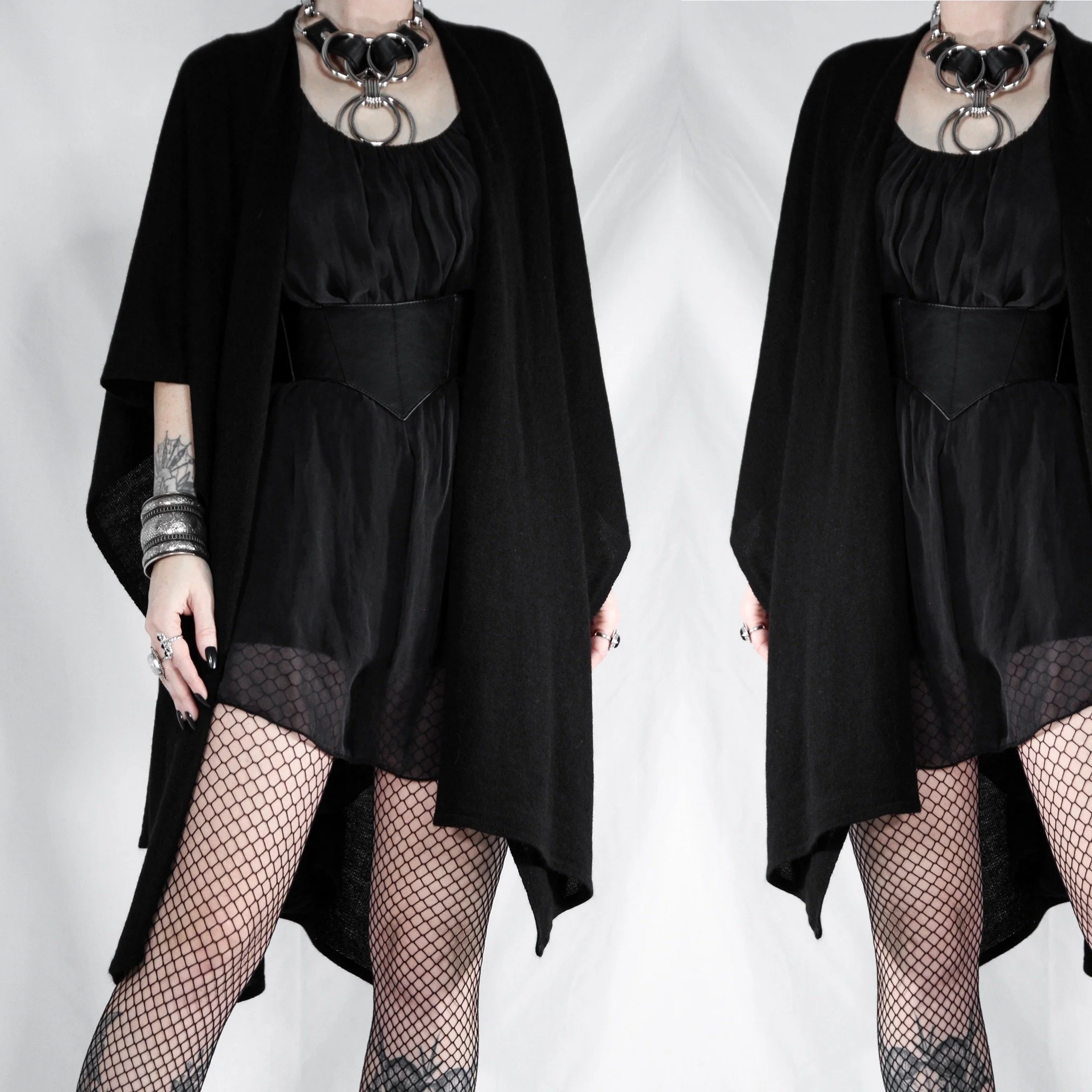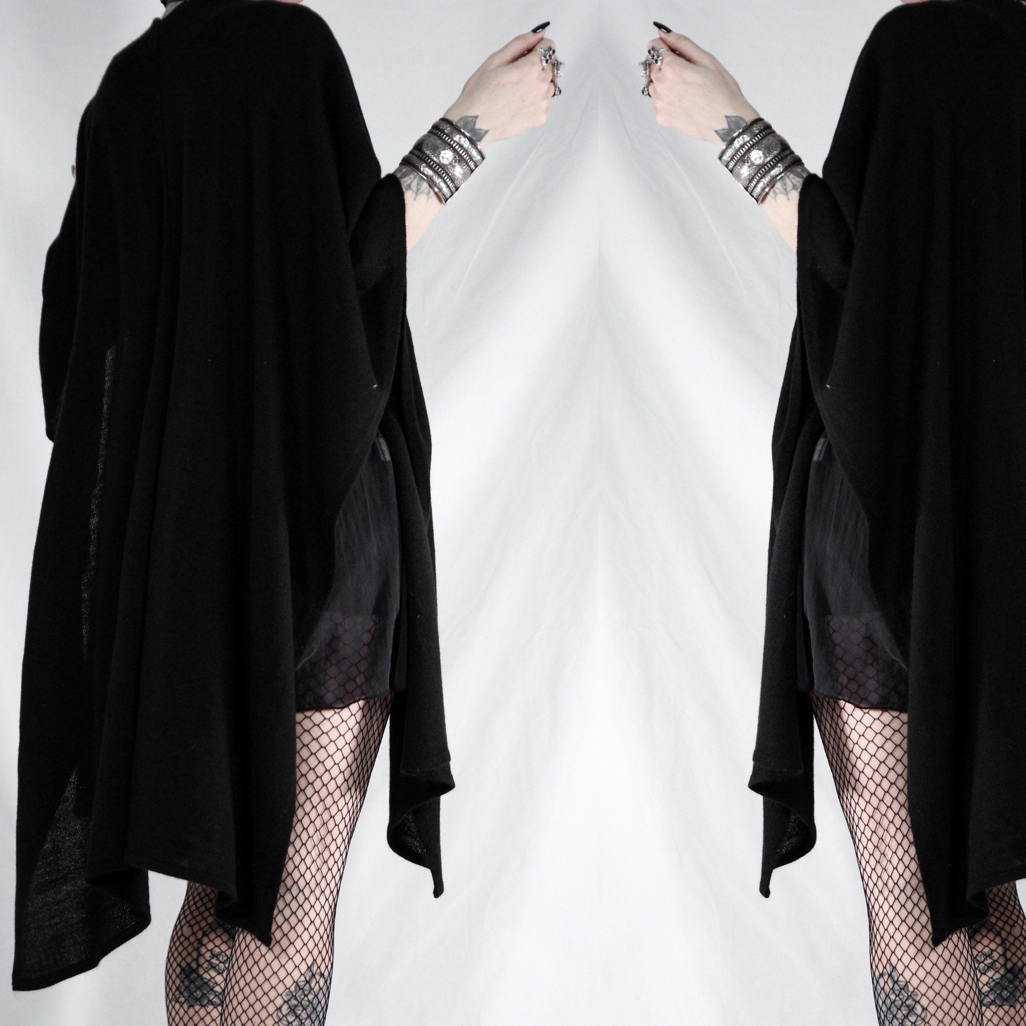 Vintage 90s open-front batwing cardigan. This is a Last Rites signature piece! Draped shawl style with no defined sleeves, oversize and dramatic. 100% acrylic rib knit, super soft with no itch factor unless you’re sensitive to synthetics. Much lighter, softer and more flowy than most of our other shawls.