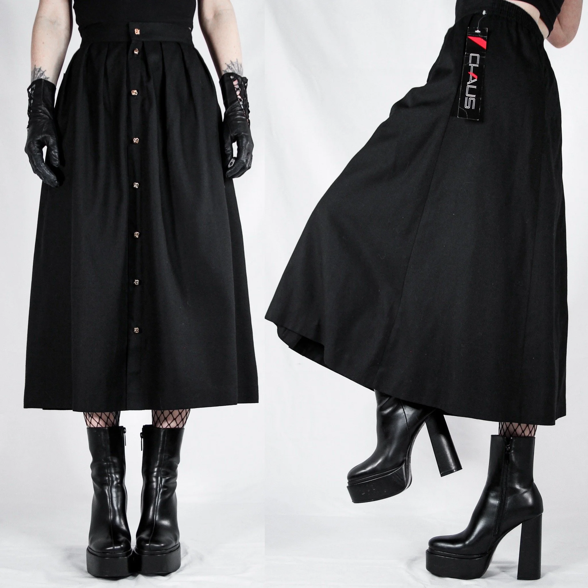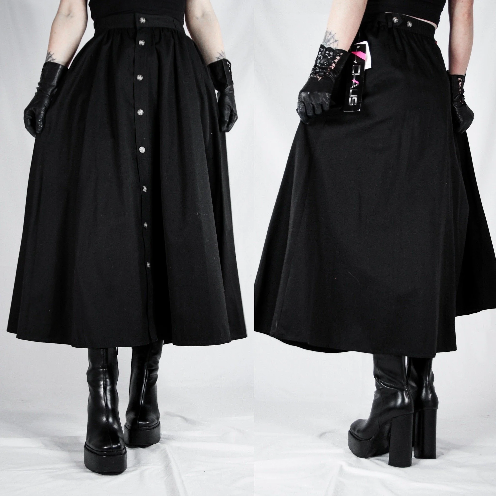Vintage 80s Chaus 100% cotton black button down skirt. Everyone needs a classic witchy button-front skirt in their wardrobe.