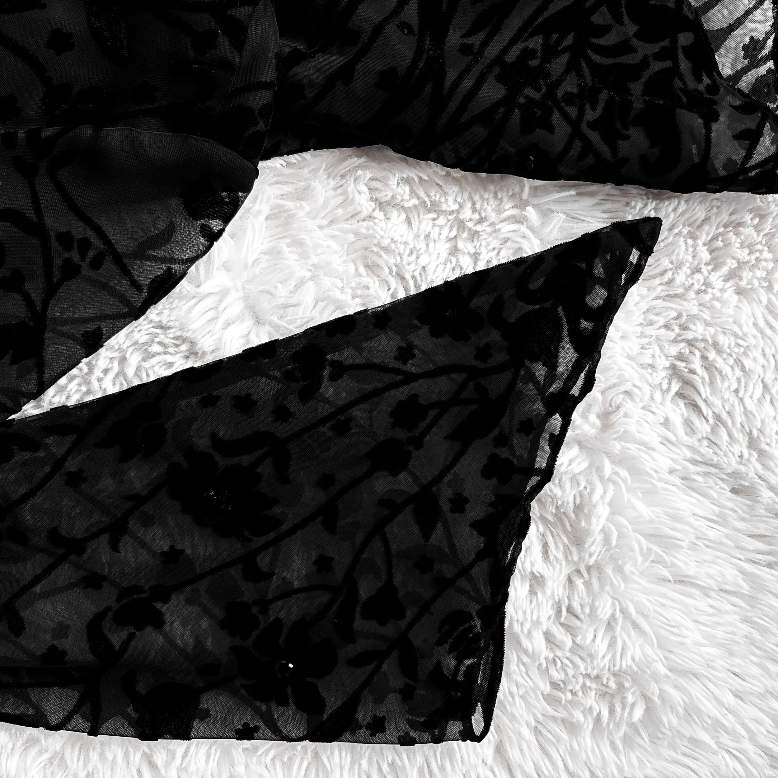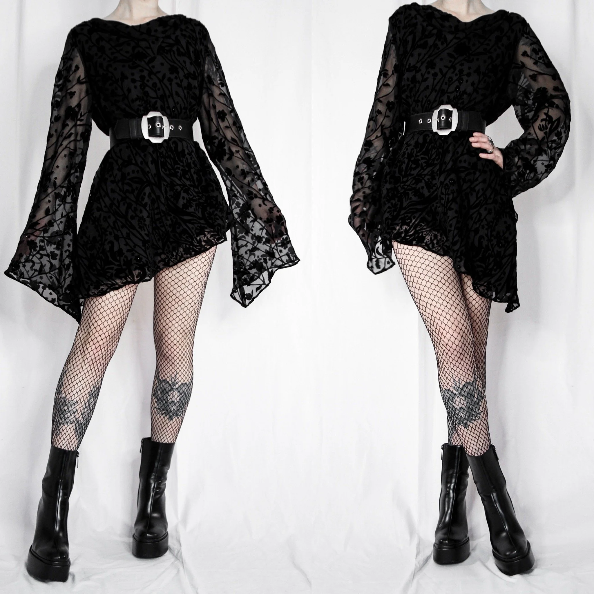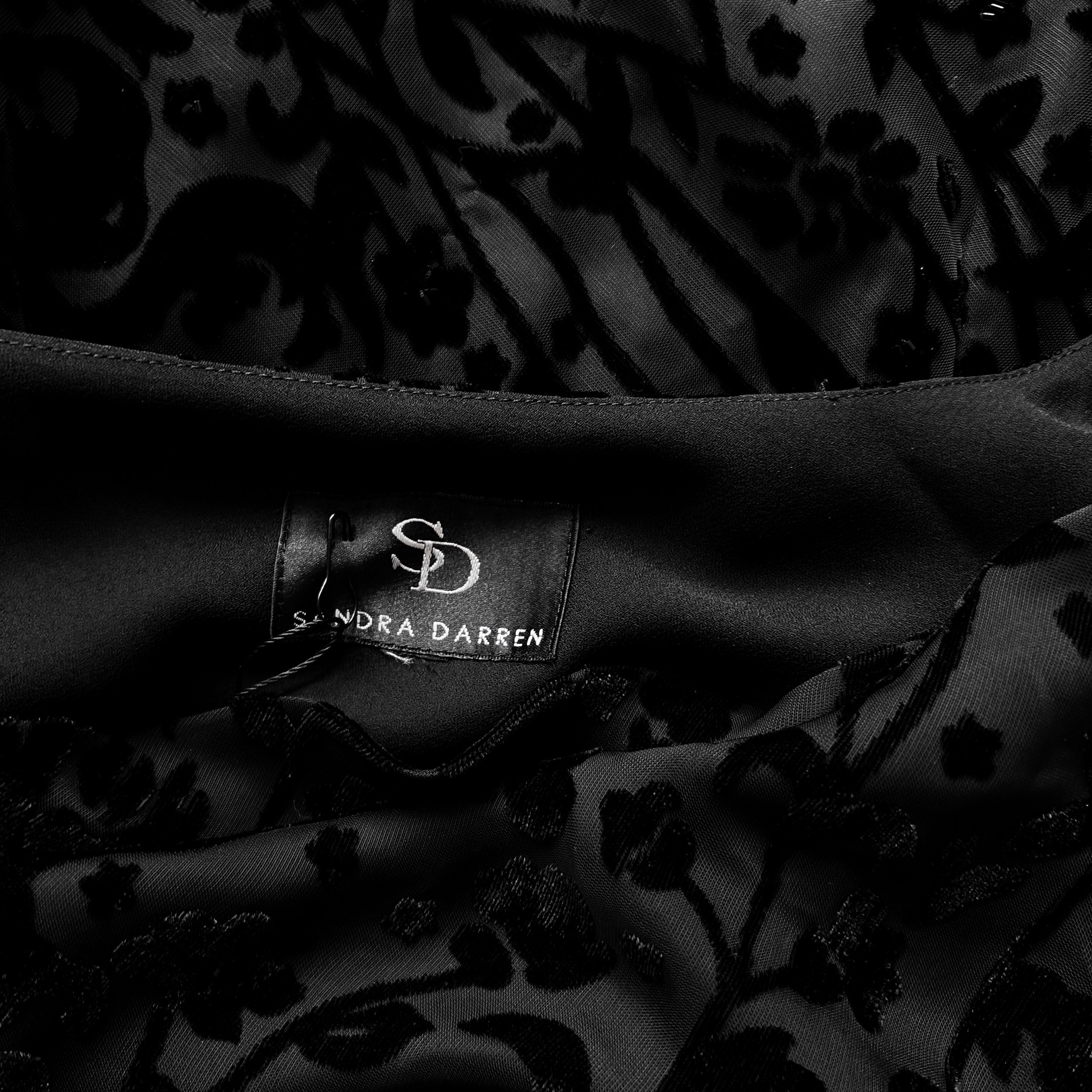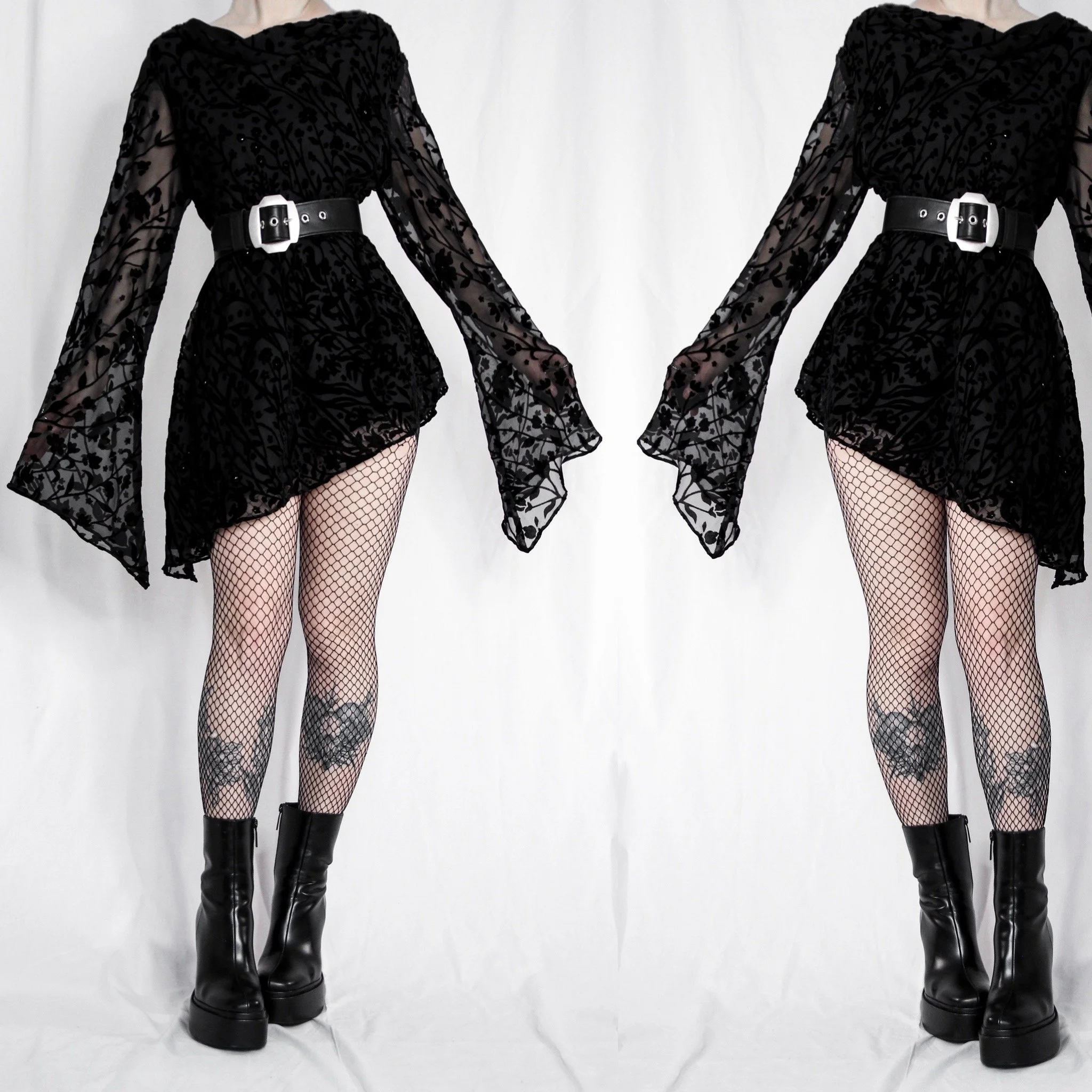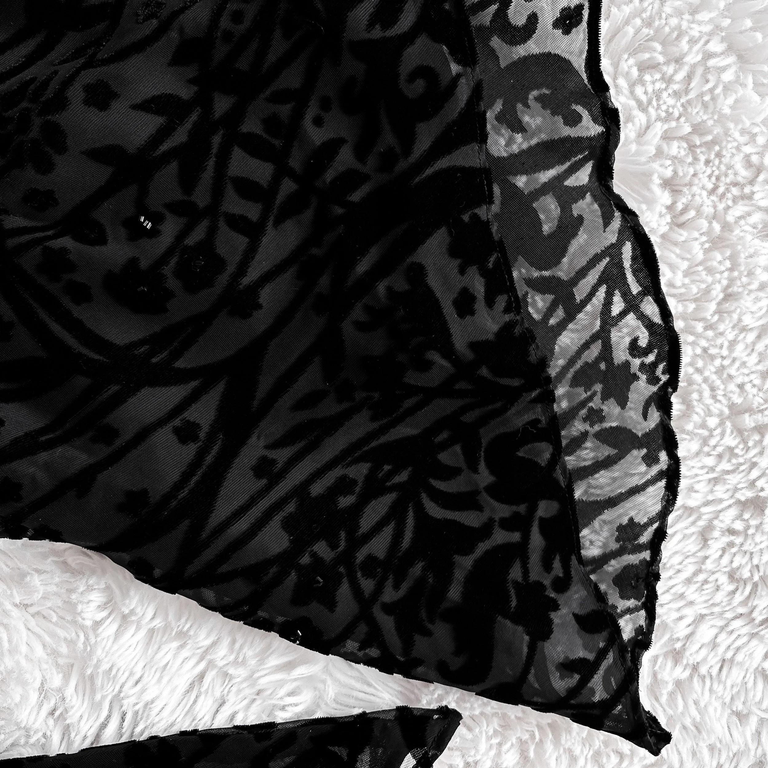 Vintage 90S Sandra Darren asymmetrical flowy tunic dress. This one is so unique, with tons of gorgeous witchy details. Fabric is a stunning black devoré velvet burnout in a whimsical floral pattern, with subtle seed bead accents. Draped cowl neck and looong extra-witchy bell sleeves. Flowy asymmetrical batwing hemline is longer on the sides.