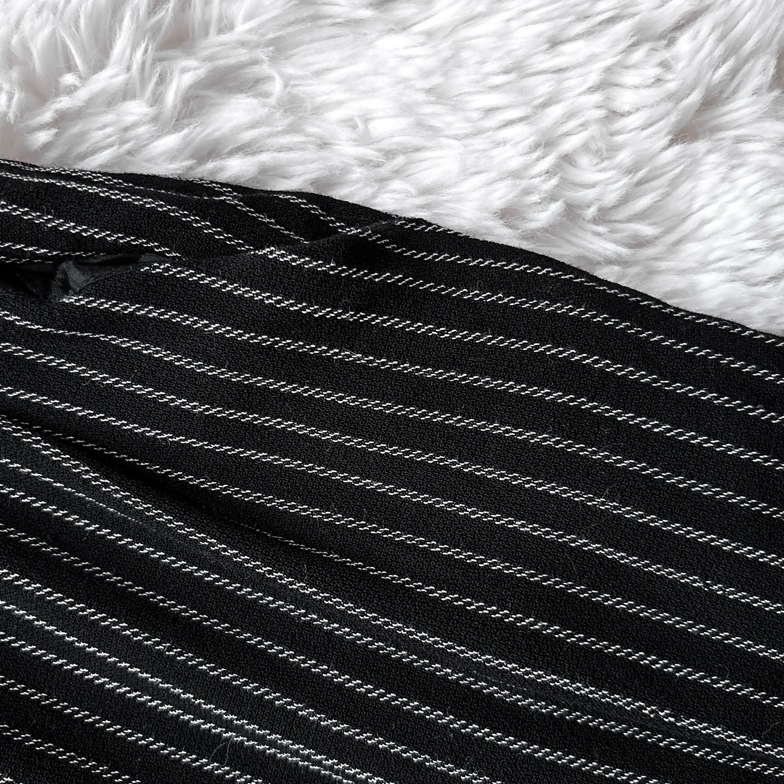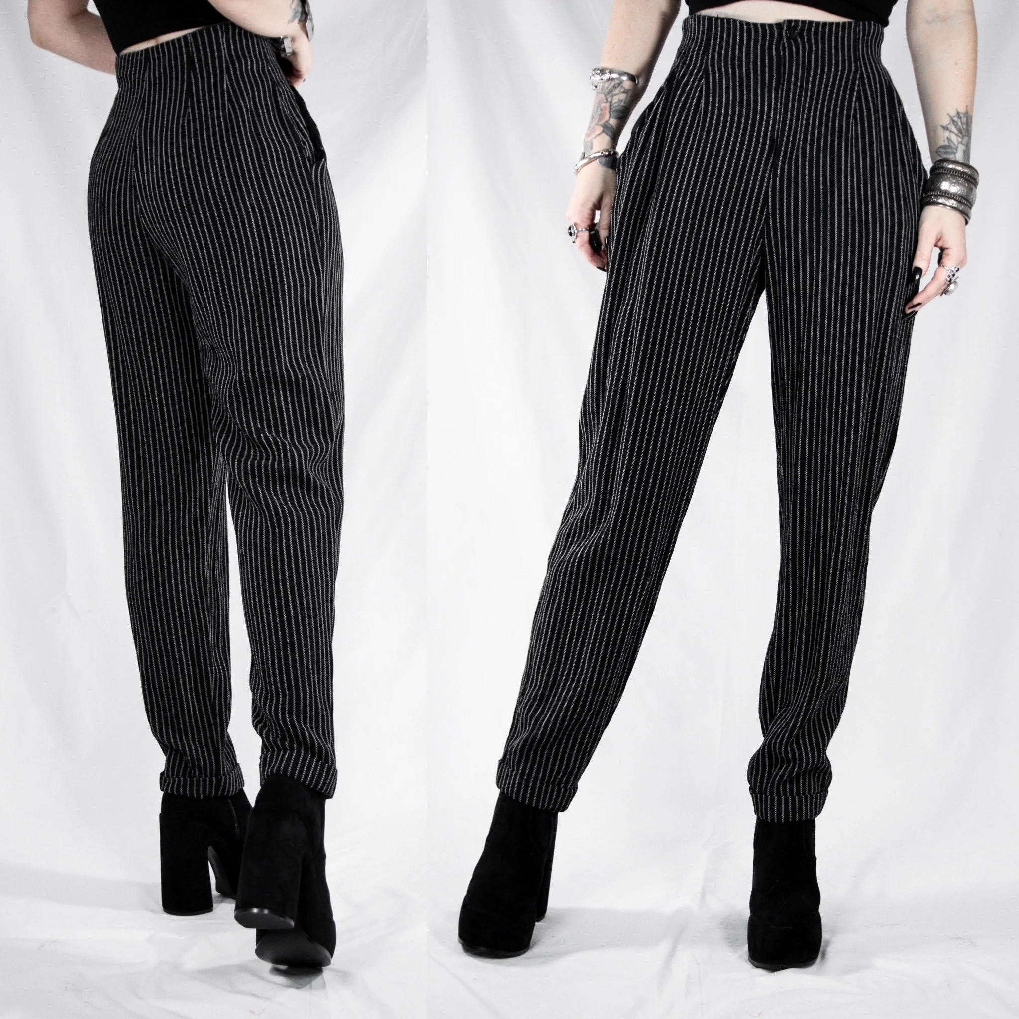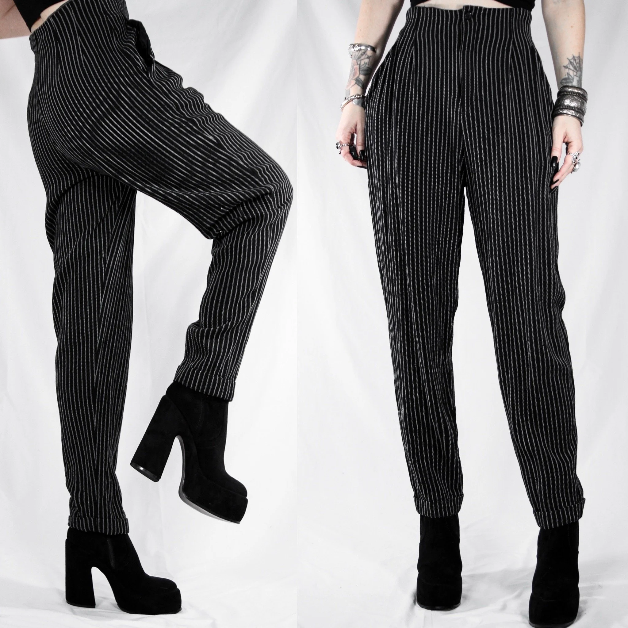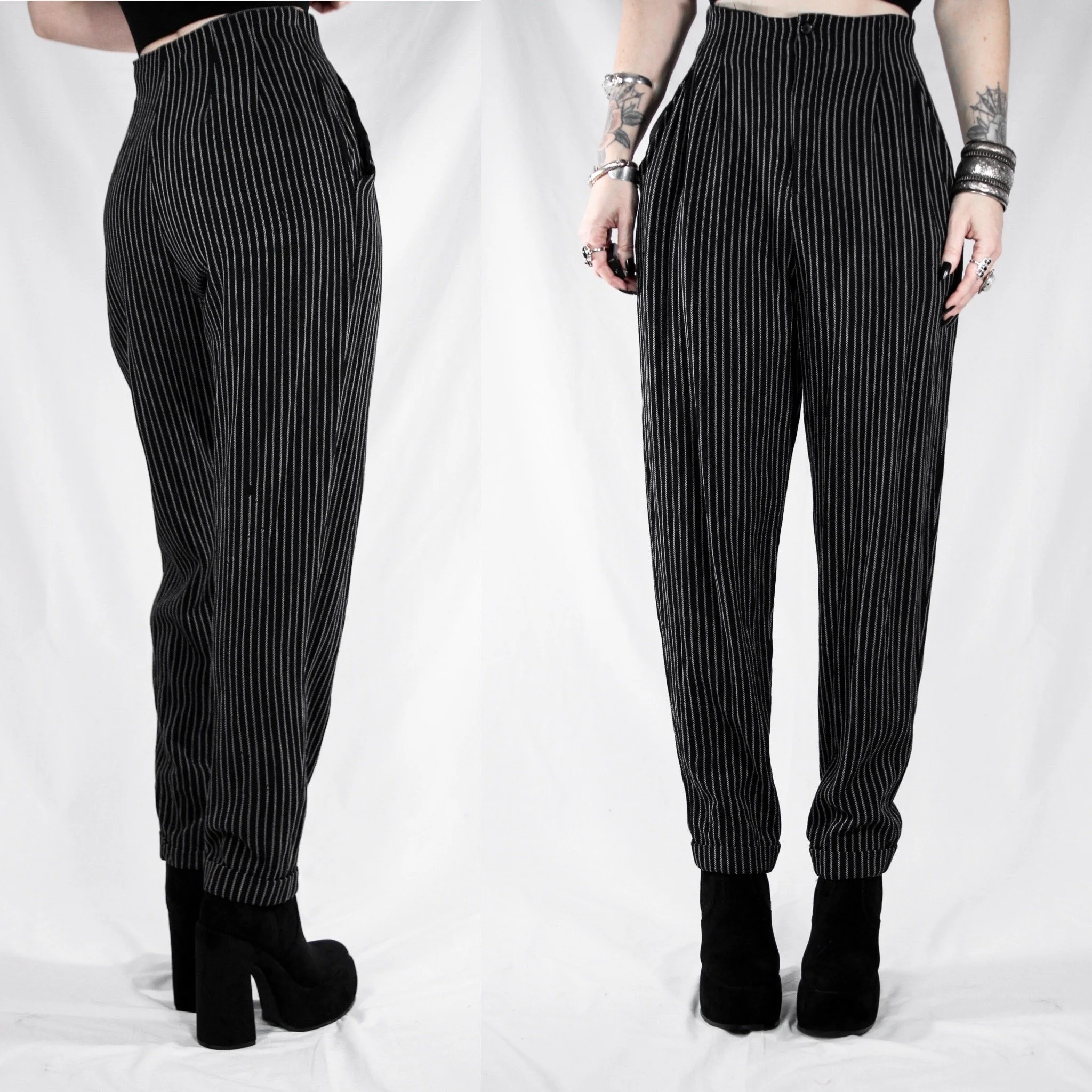 Vintage 90s John Meyer of Norwich pinstripe cropped pants. They have pockets! These are so fun and classic, a perfect twist on all-black for the office goths, and the wool blend fabric makes them cozy and warm for winter weather! Black and white pinstripe print. Deep side pockets. Midweight knit suit fabric (60% viscose rayon, 40% wool - extra warm but not too thick and not stiff!) Cropped ankle-length, high rise. Unlined, zip fly, button closure. Super comfy, flattering and versatile. No stretch, unlined. May have a bit of itch due to the wool if you’re sensitive, but layer up with tights or leggings underneath and you’re good to go!