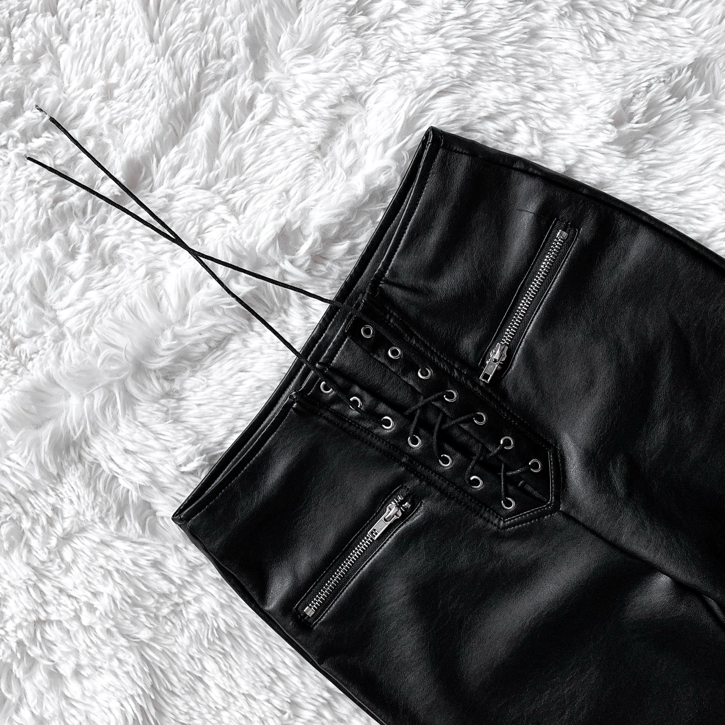 Y2K faux leather leggings. Badass and polished, these are your new favorite edgy staple leggings! Adjustable lace-up detail in the front with a modesty panel behind the laces that buttons closed. Soft, real-looking vegan faux leather. Soft lining on the inside so they don’t stick to you! Sturdy and thick with a bit of stretch. Poly-spandex blend. Pull-on style.
