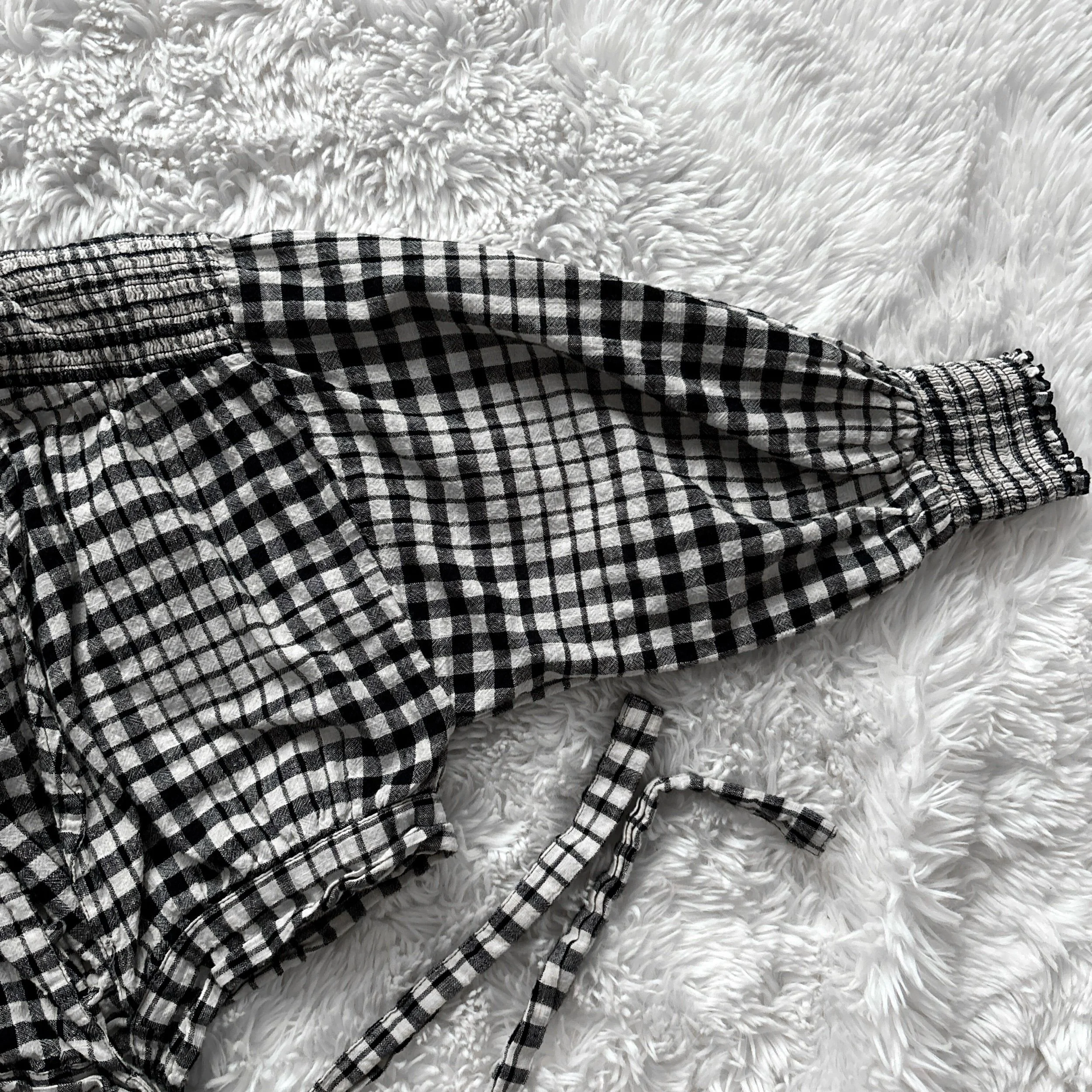 Cream-and-black plaid wrap blouse. Your new favorite cottagecore staple piece! This is an older item from Zara in brand-new condition. Soft, 100% cotton flannel. Huge, oversized 3/4 length bishop sleeves with gathered ruched cuffs. Wrap front with fully adjustable ties at the waist. Unlined, no stretch other than the elastic ruching at the cuffs and shoulder detailing.