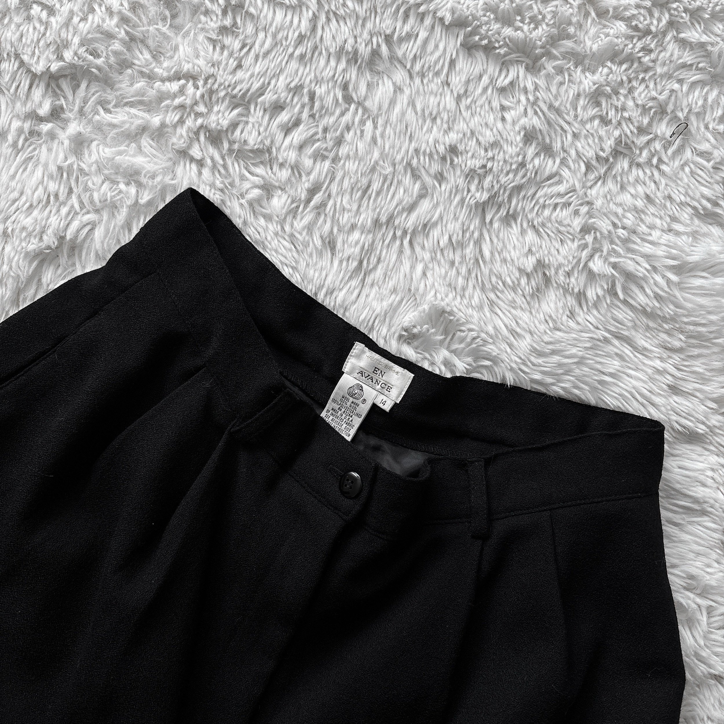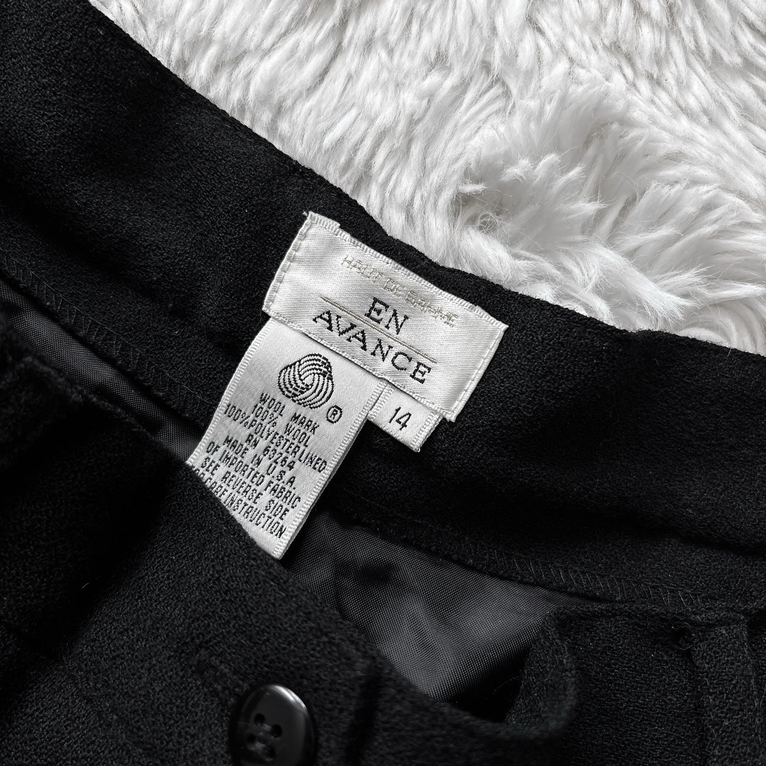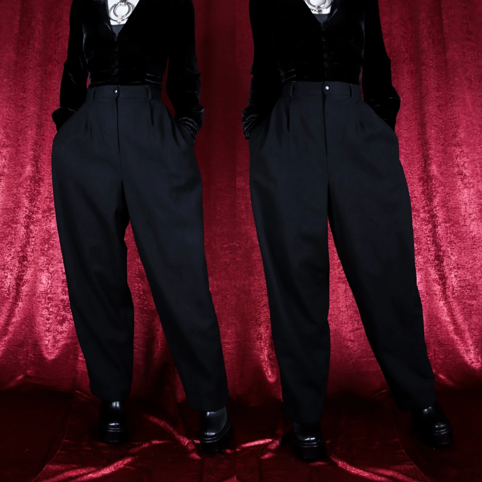 True black wool. Deeeep side pockets and front pleating. Belt loops, zip fly, button closure. Super high rise. No stretch. So classic and versatile!