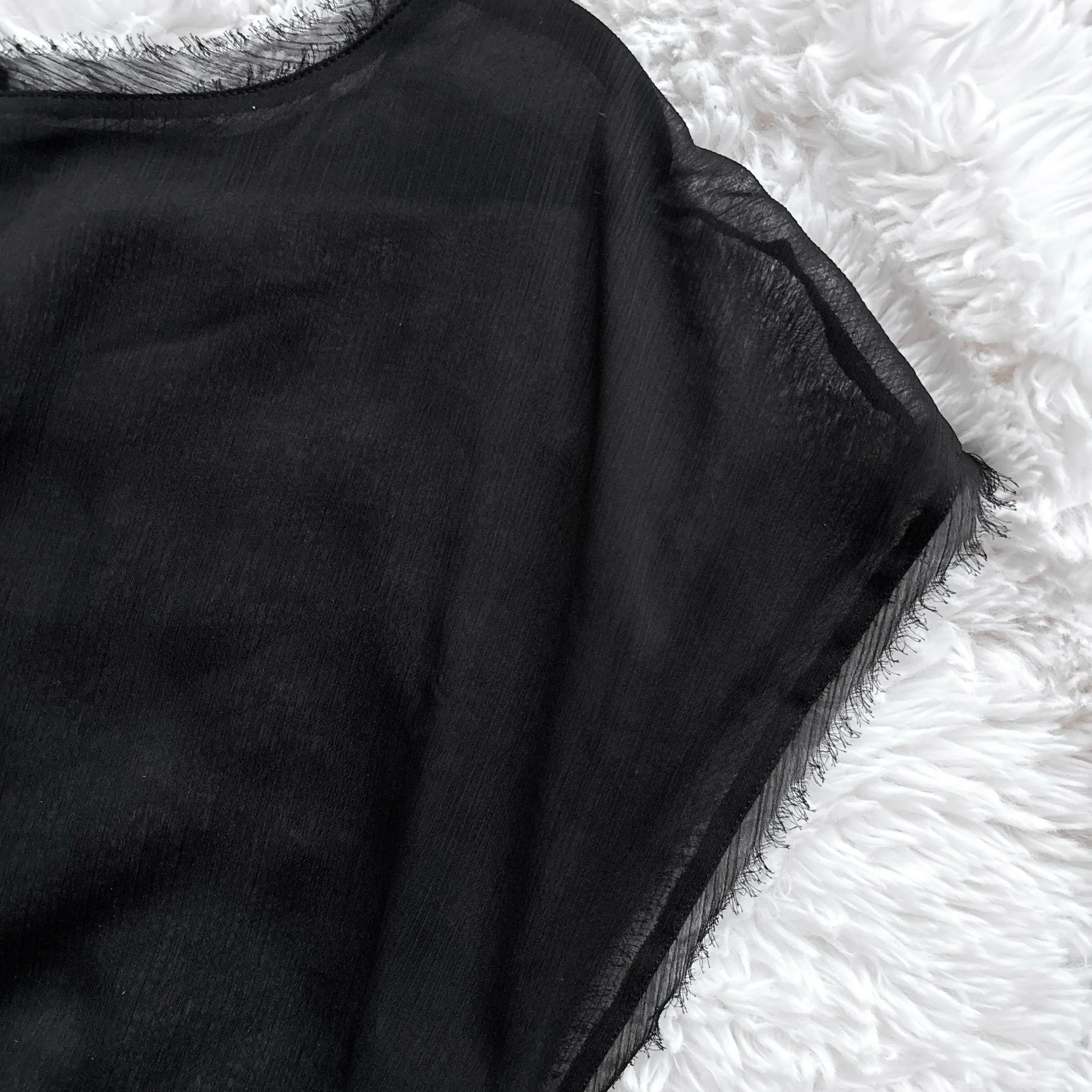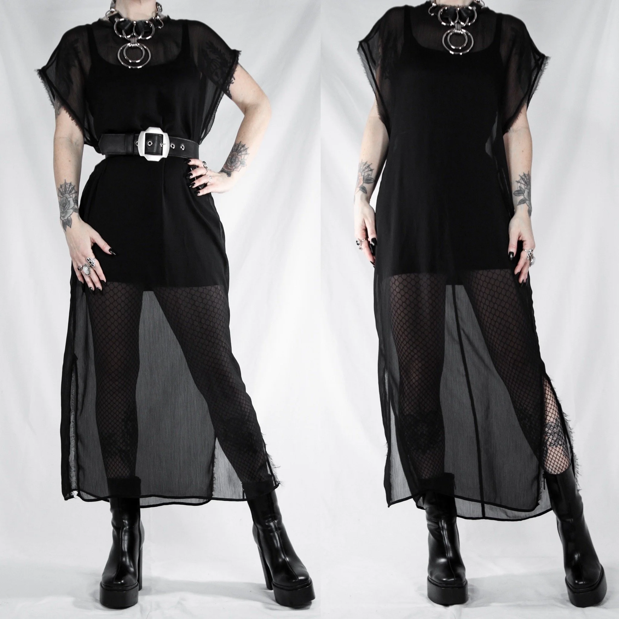 Modern sheer maxi dress. So badass and fun to layer! Sheer, gauzy, textured poly chiffon. Frayed raw edges. Button closure at the back of the neck and high side slits on both sides at the hem. Pull-on style. Straight column cut. Almost-sleeveless / cap sleeves with 12” arm holes. Lighter than air, unlined, no stretch. Feels like wearing a spiderweb. Liner pieces and belt not included. This one can be layered over or under just about anything!