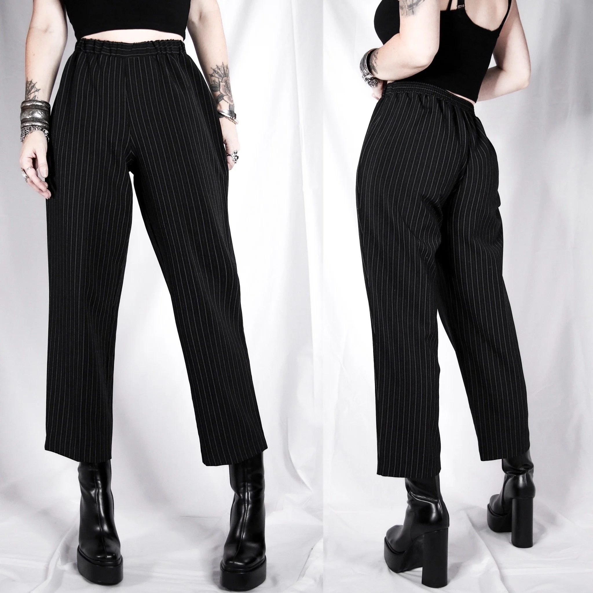 Vintage 90s Donnkenny Petites pinstripe cropped pants. These are so fun and classic, a perfect twist on all-black for the office goths. Thin black and white pinstripe print. Midweight poly-rayon-viscose blend suit fabric. Ankle-length, high rise. Fully lined in a separate layer of black poly satin. Side zip with button closure at the top. Waist is slightly elasticized in back. Super comfy, flattering and versatile!
