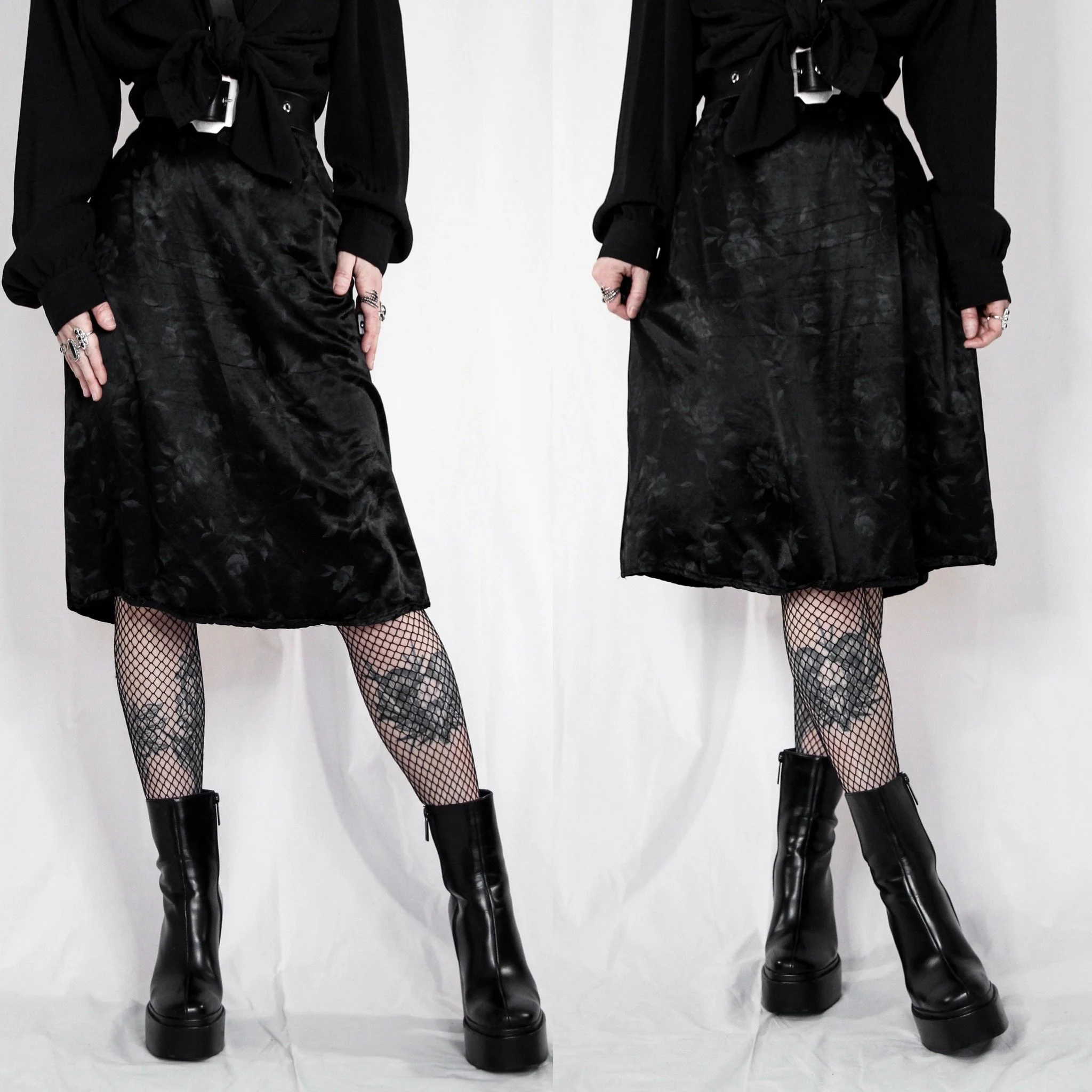 Vintage 90s Basic Editions midi skirt. This is one of our most highly-requested styles! A sweet little 90s throwback, looks like something straight out of Charmed or Sabrina the Teenage Witch. Black-on-black satin with an embossed floral print all over. Fitted through the waist and hips with a flowy A-line cut. Back zip. No stretch. Soft, shiny, versatile and flattering - the whimsigoth statement skirt of your dreams!
