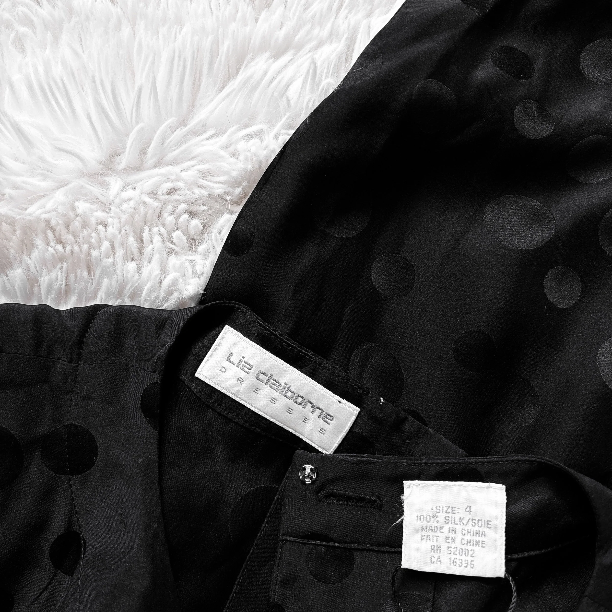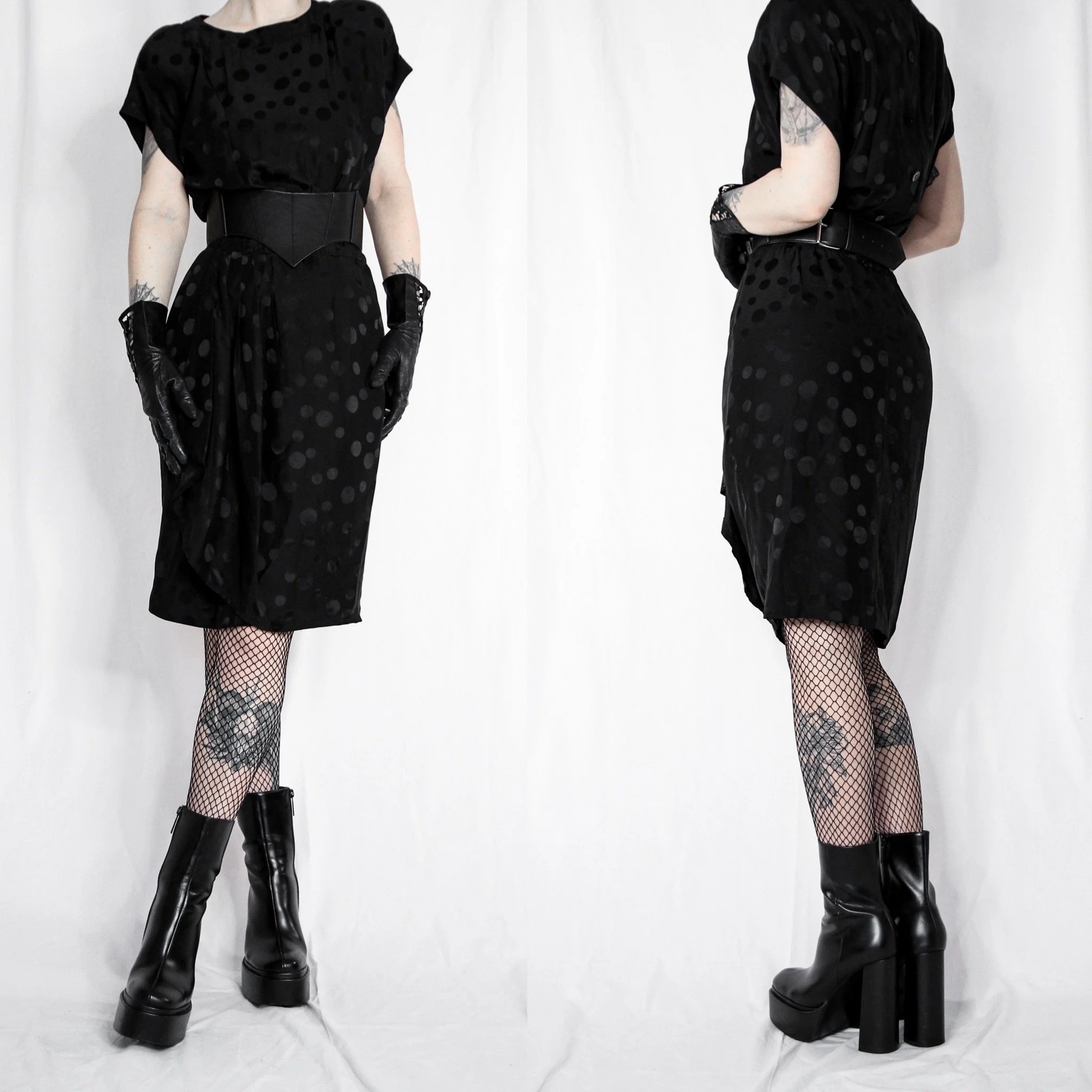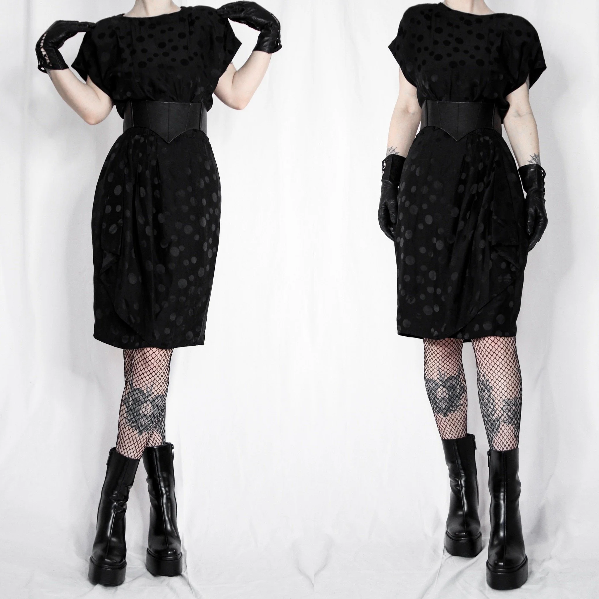 100% silk in black with a shiny oversized but subtle polka dot pattern. Back zip on the skirt to the waist, with buttons up to back of the neck. Drop waistline is slightly stretchy. Short sleeves, and a pleated, loose, midi-length pencil skirt with wrap-style waterfall draping. Original shoulder pads intact (and they are THIQQ!!) but they can be easily removed if you prefer a more modern silhouette. 100% silk. No stretch.