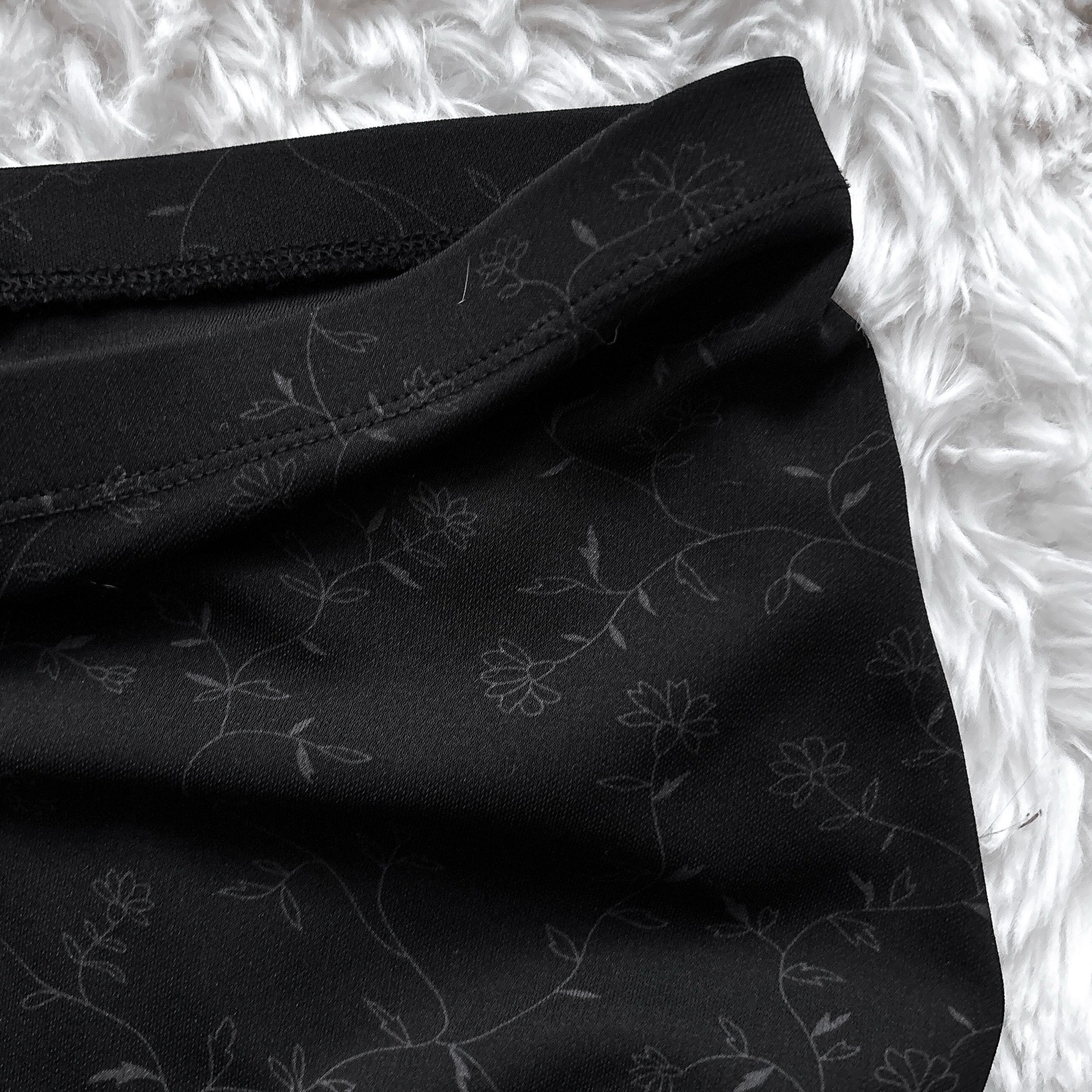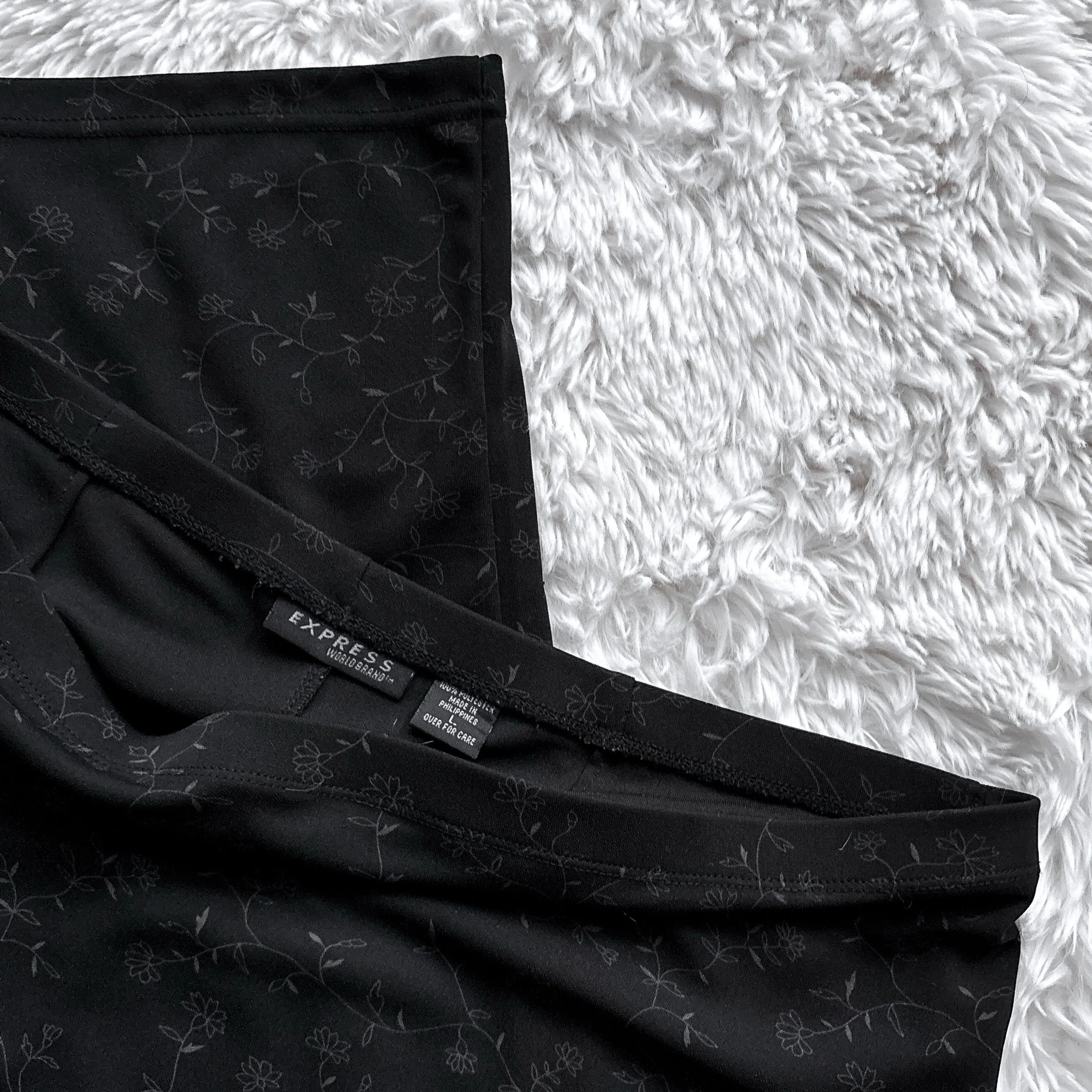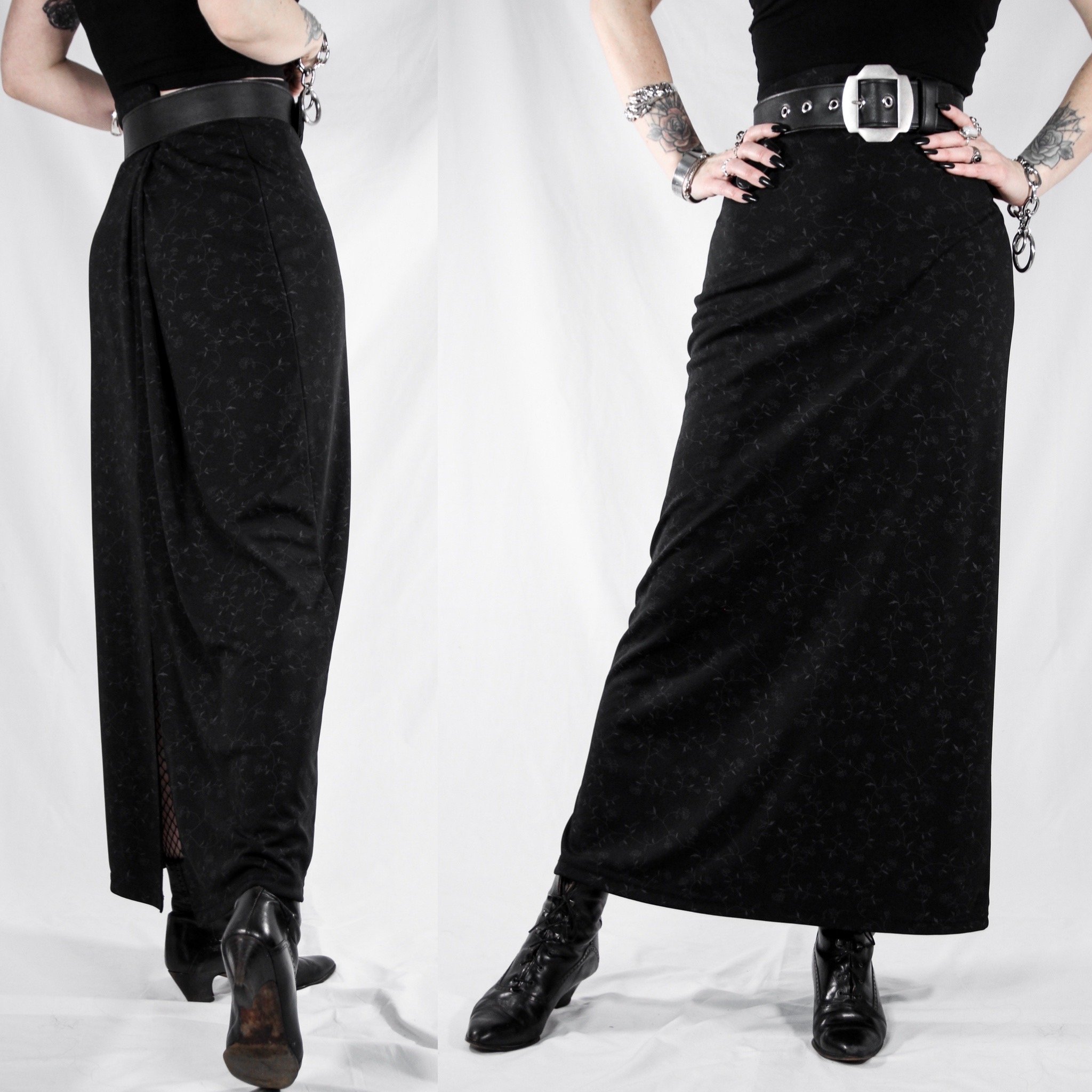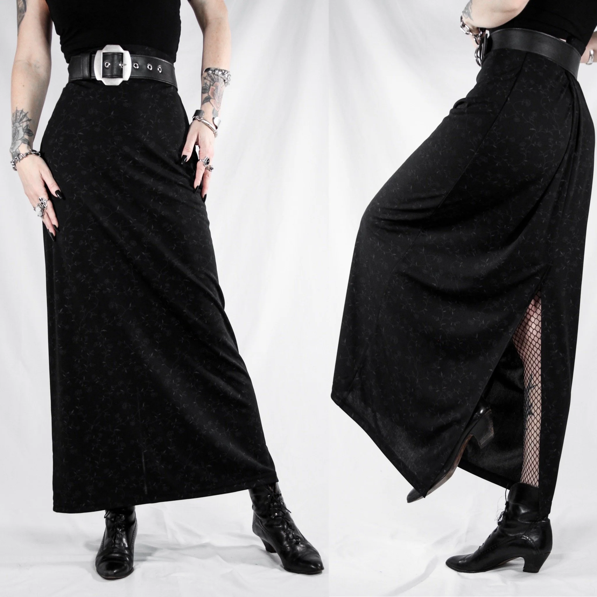 Vintage Y2K Express black floral maxi skirt. A versatile staple with major whimsigoth vibes! Straight cut, maxi length with a high, vampy off-center front slit. Subtle dark gray floral print on black. Smooth, lightweight, flowy 100% poly fabric - not super stretchy but does have a bit of “give”. Pull-on style, unlined,