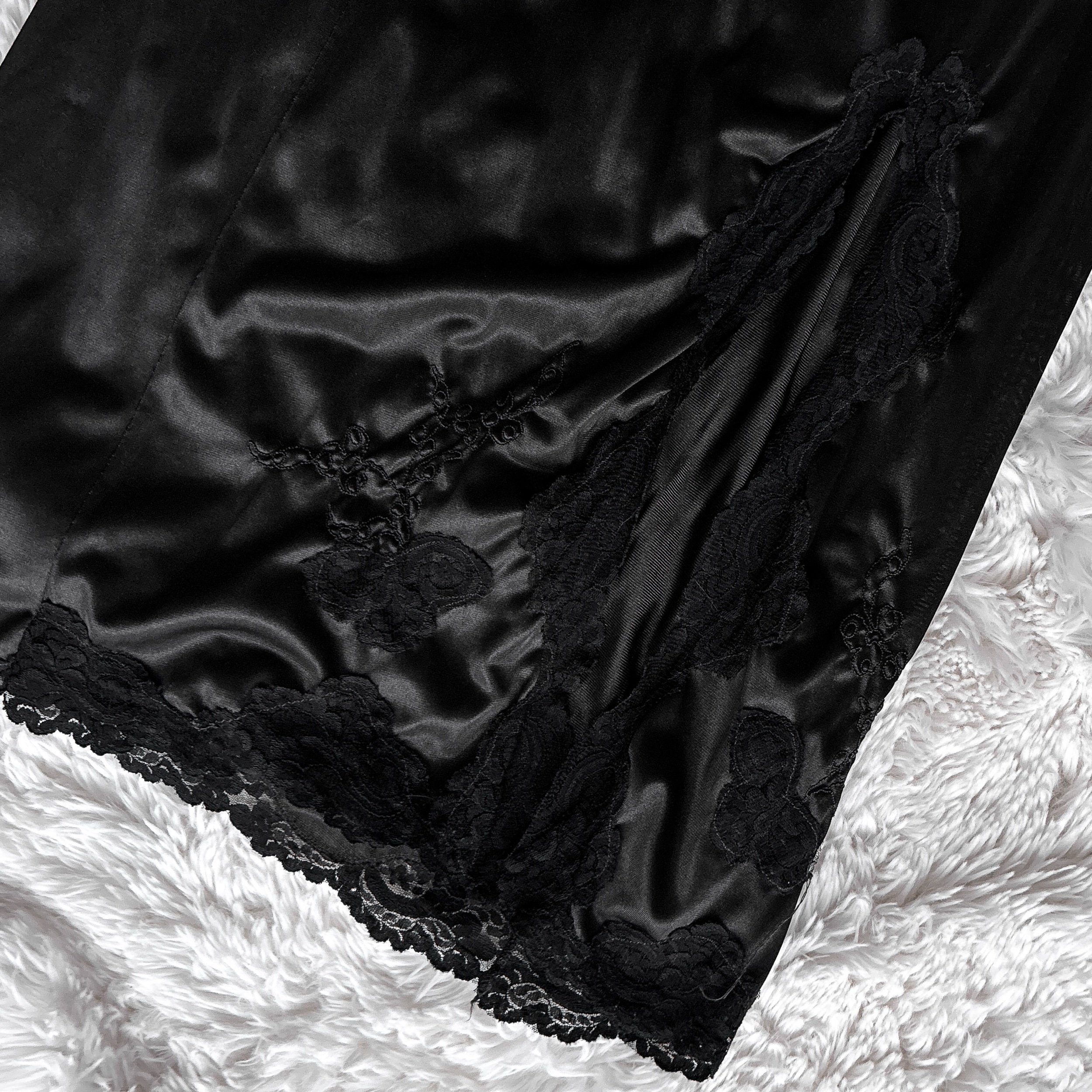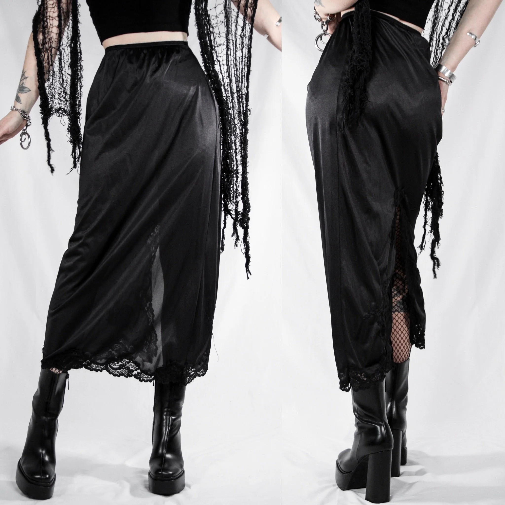 Vintage 1970s Antron III 100% nylon satin slip skirt. Perfect for wearing under your favorite wool/itchy dresses and skirts to minimize itch and cling, or style it alone! Elastic waistband, dainty lace trim at the hem, and a super high, sassy lace-trimmed back slit. Will hit around the ankle on most people. Very lightweight and delicate, surprisingly opaque for this style but may be slightly sheer in direct light.