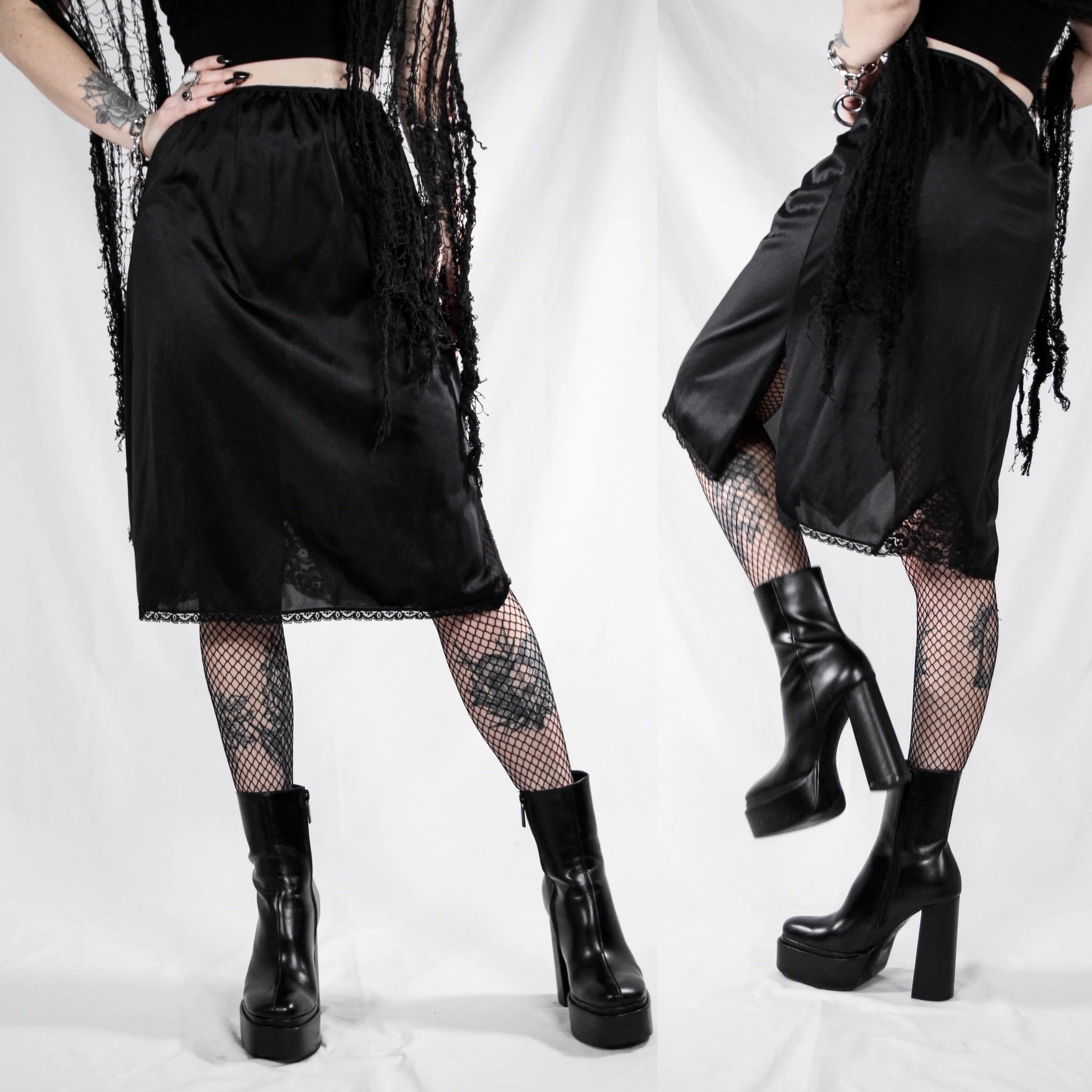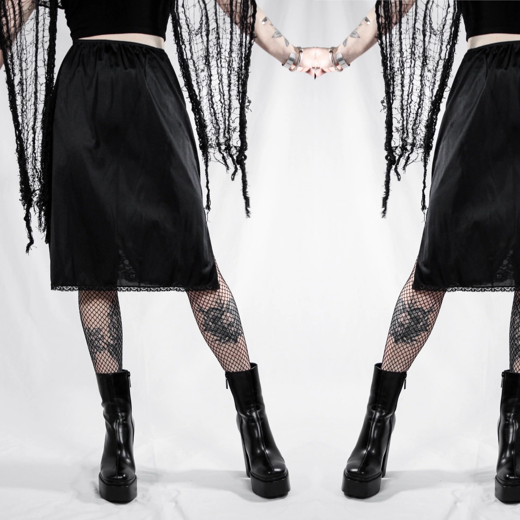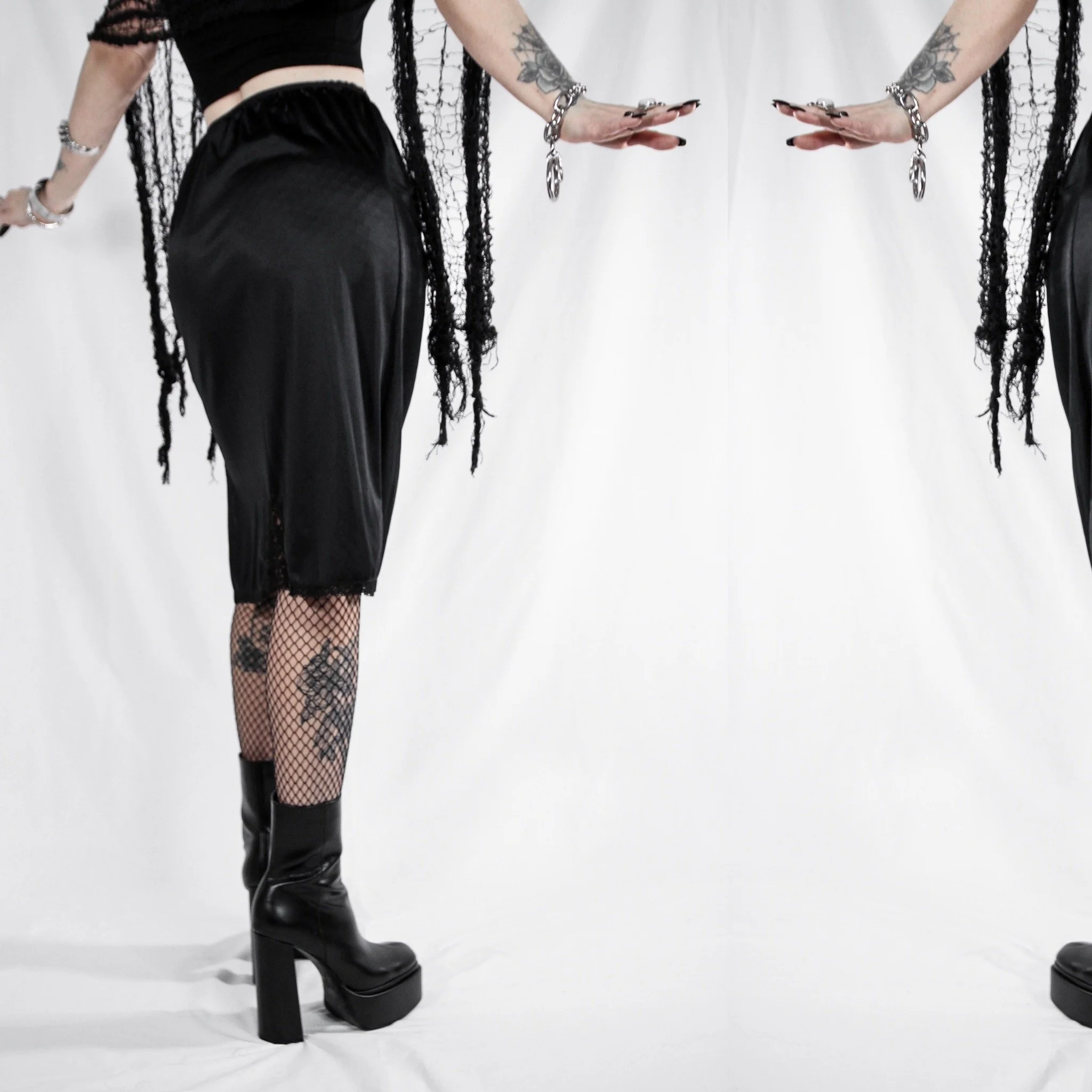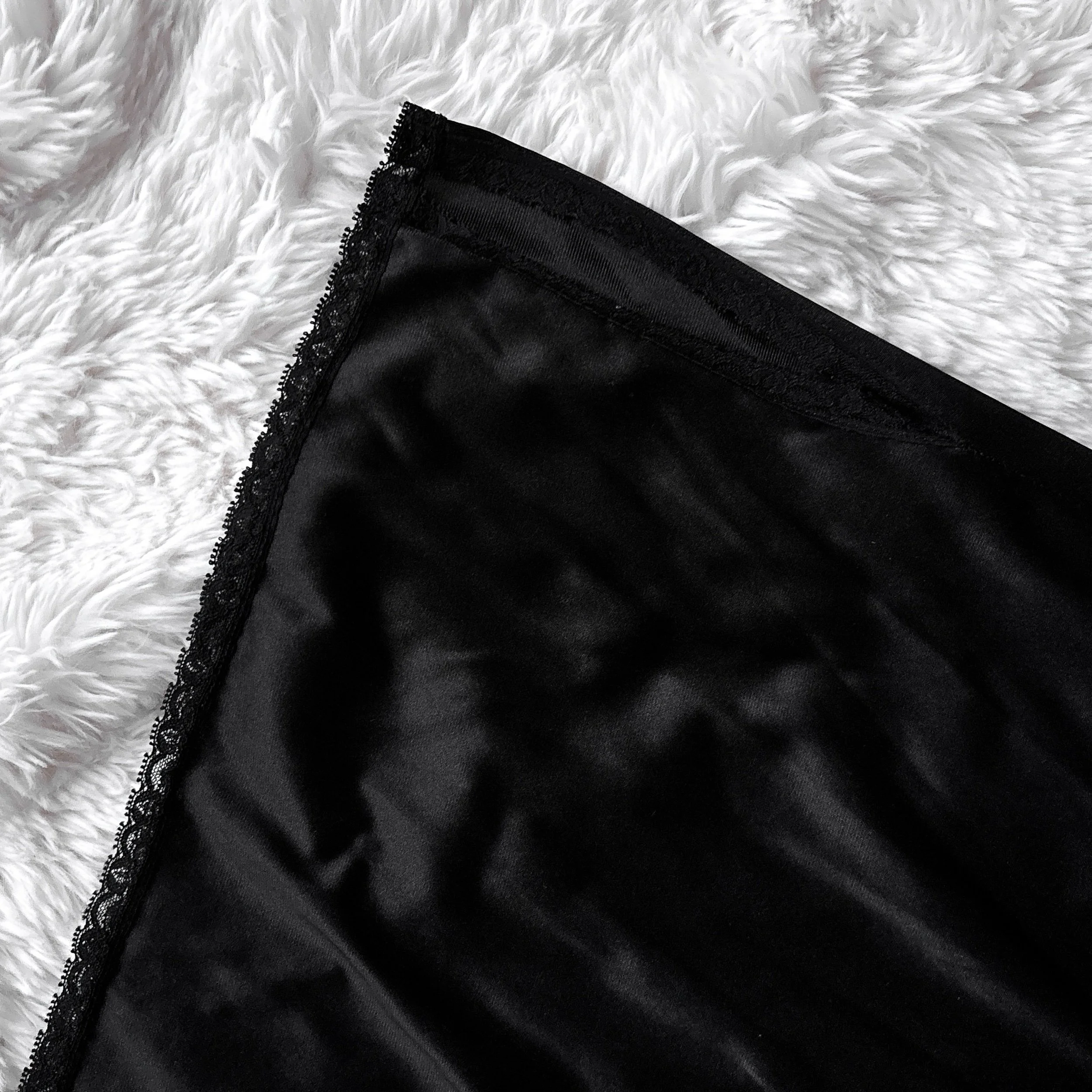 Vintage 1970s nylon satin slip skirt. Perfect for wearing under your favorite wool/itchy dresses and skirts to minimize itch and cling, or style it alone! Elastic waistband, dainty lace trim at the hem, and a small lace-trimmed side slit. Knee-length, Very lightweight and delicate, surprisingly opaque for this style but may be slightly sheer in direct light.