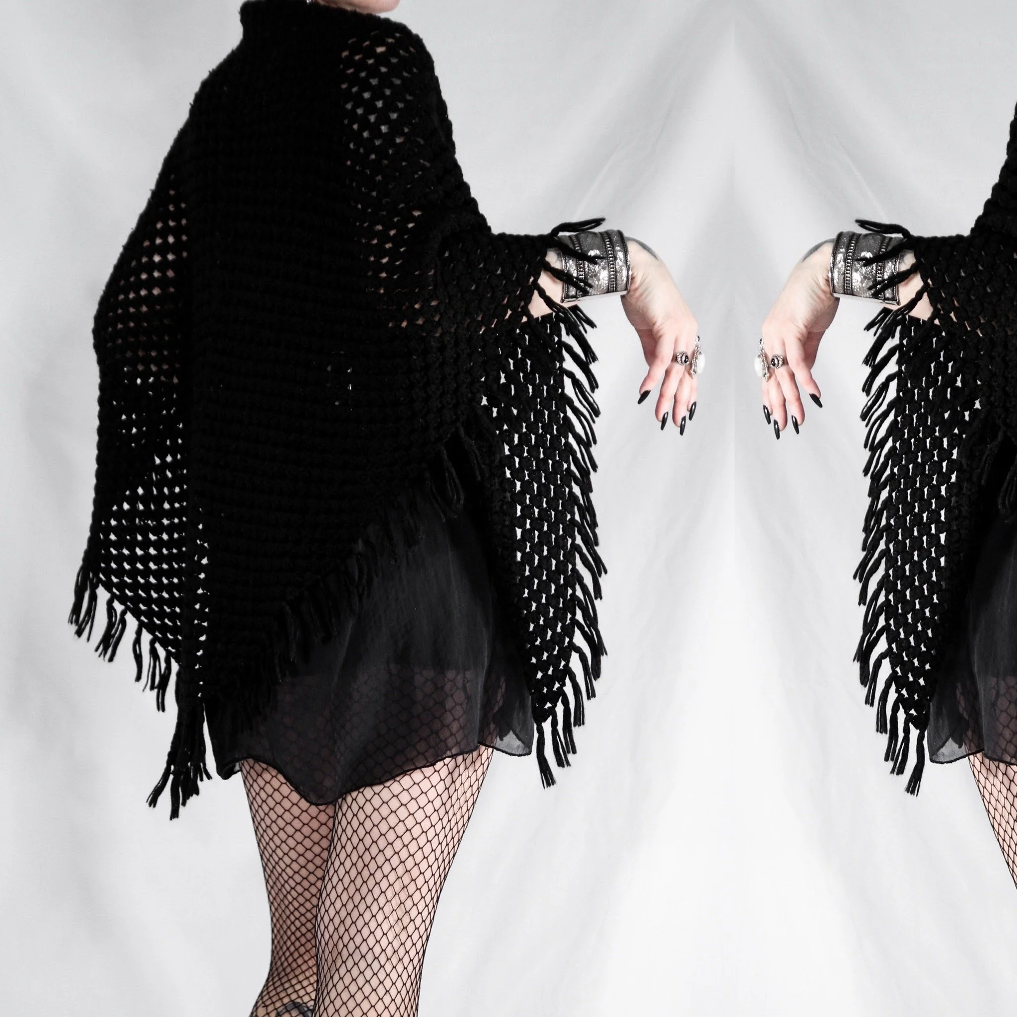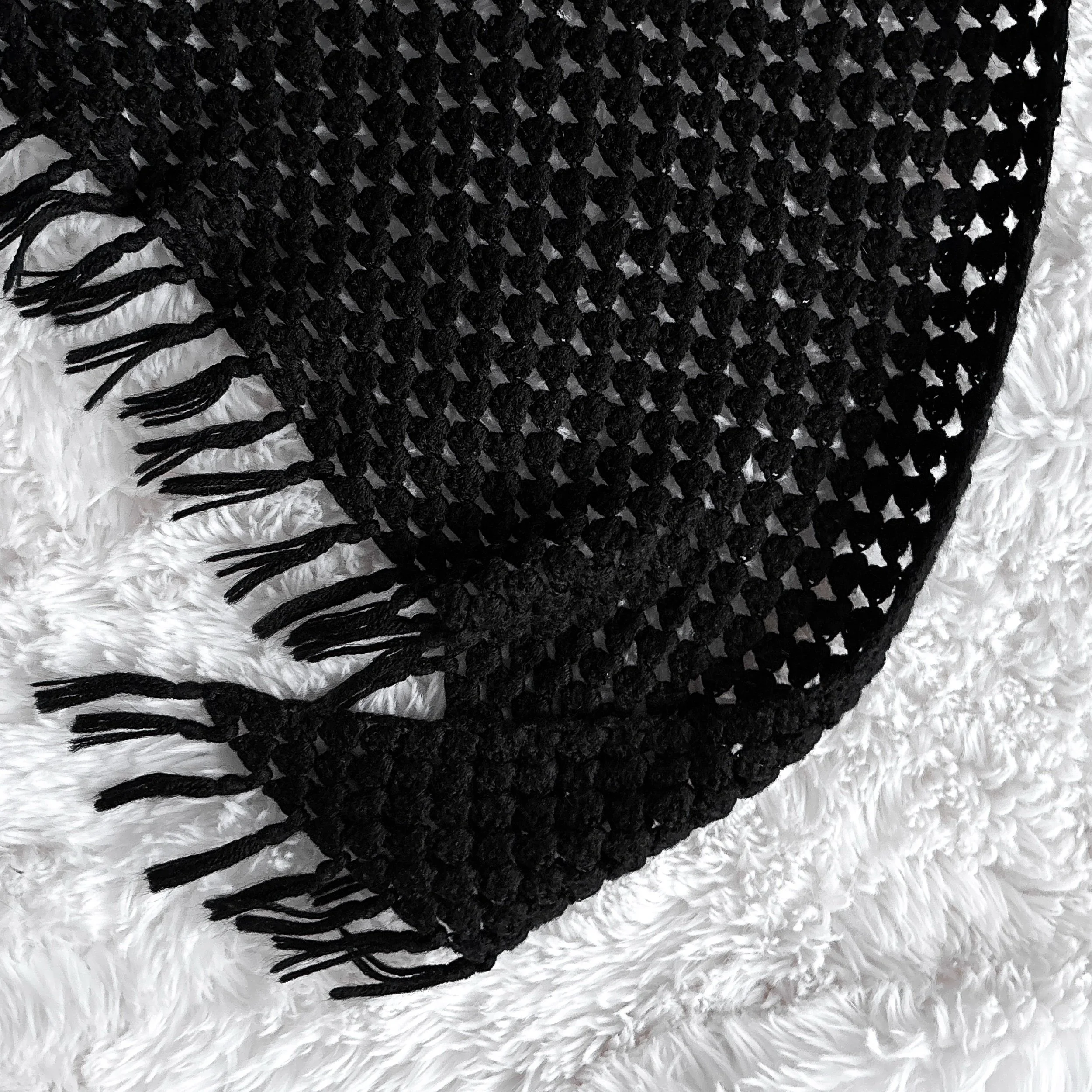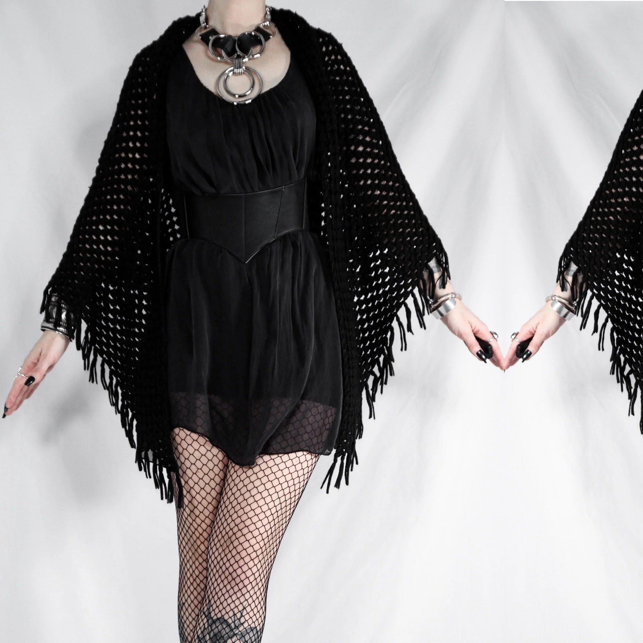 Vintage handmade chunky black knit shawl. Midweight acrylic crochet knit with thick fringe on two sides. So warm and cozy, great for layering in all kinds of weather. A perfect throwover piece for chilly nights out, or just snuggling up at home on your couch! Triangular, measures 70" by 32", not including fringe.