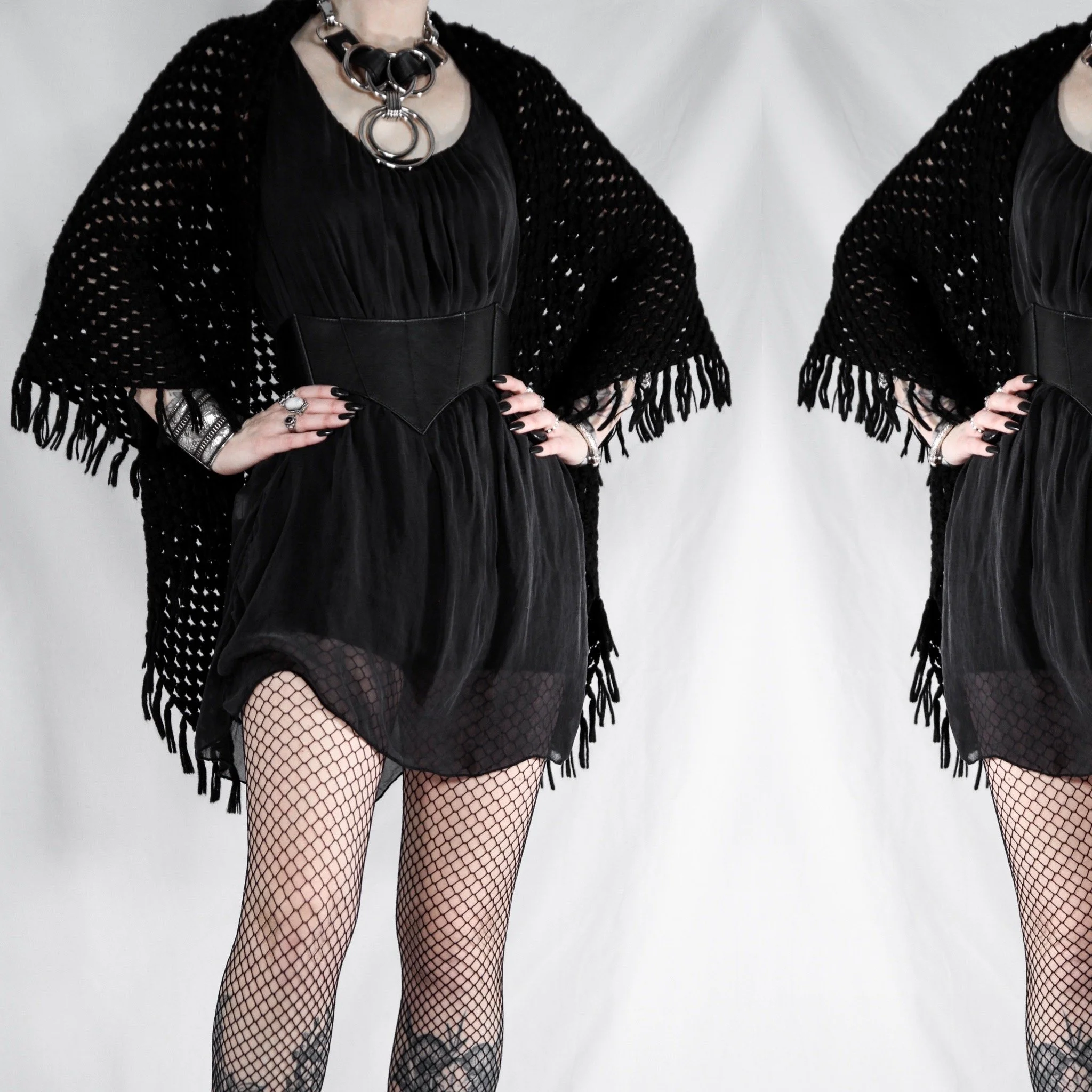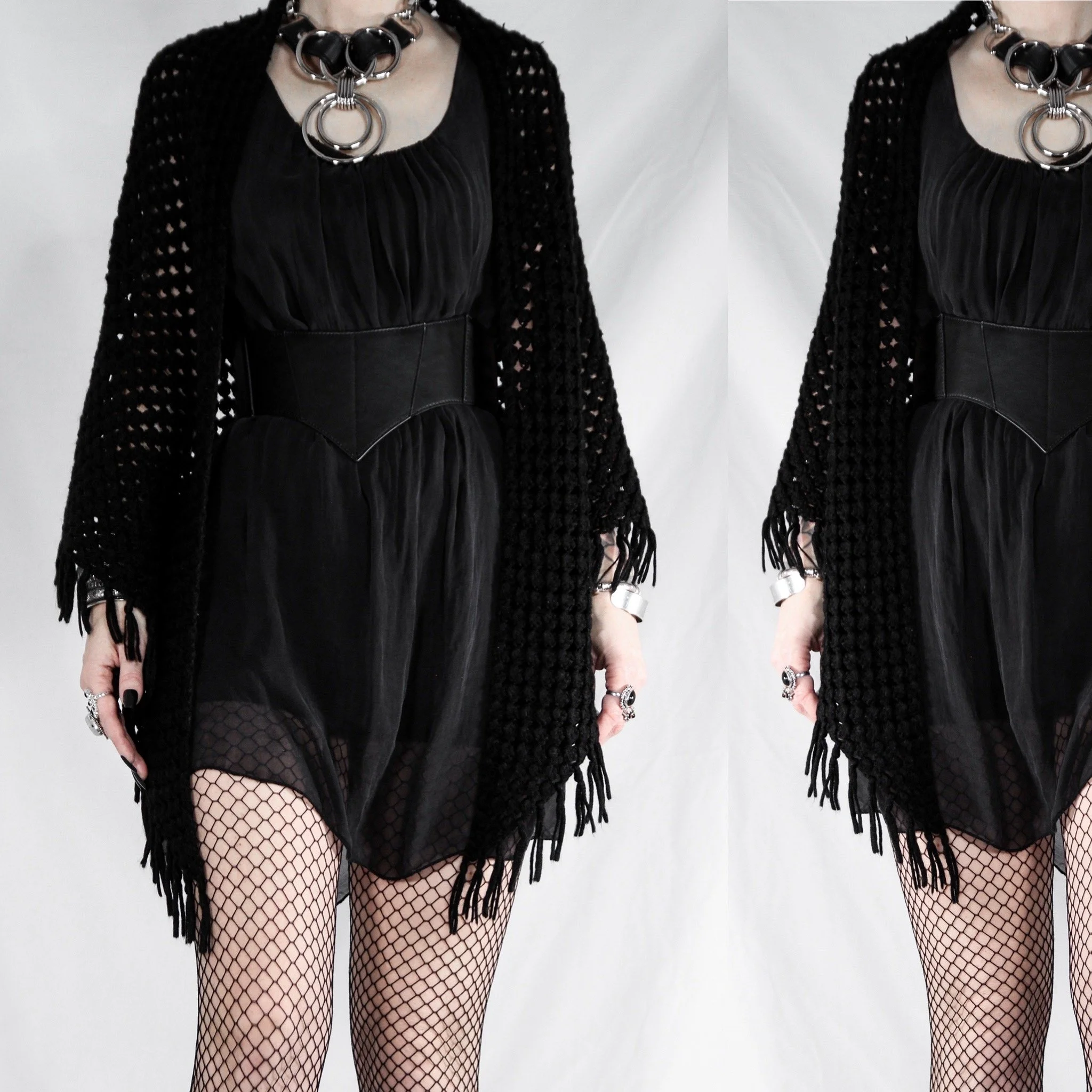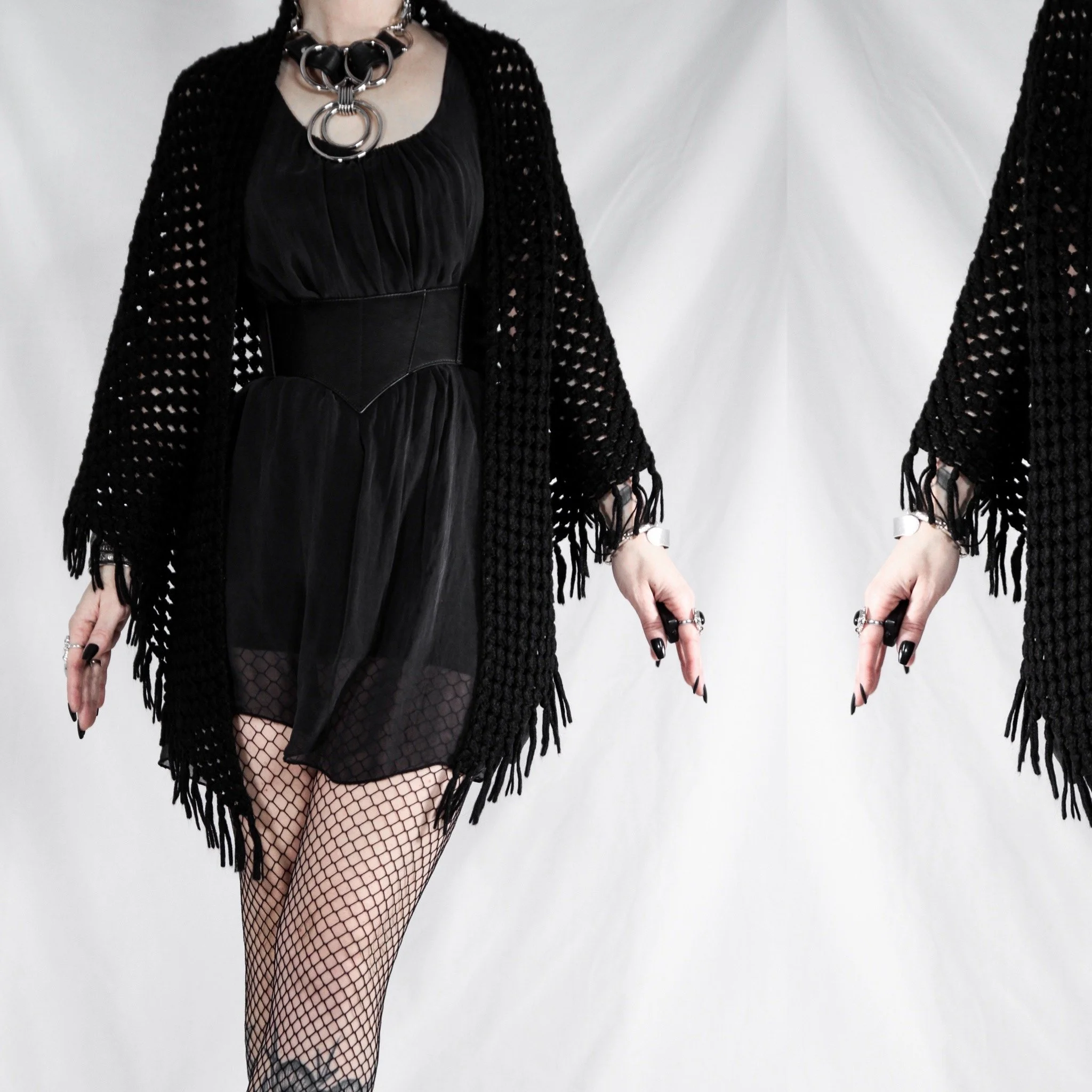 Vintage handmade chunky black knit shawl. Midweight acrylic crochet knit with thick fringe on two sides. So warm and cozy, great for layering in all kinds of weather. A perfect throwover piece for chilly nights out, or just snuggling up at home on your couch! Triangular, measures 70" by 32", not including fringe.