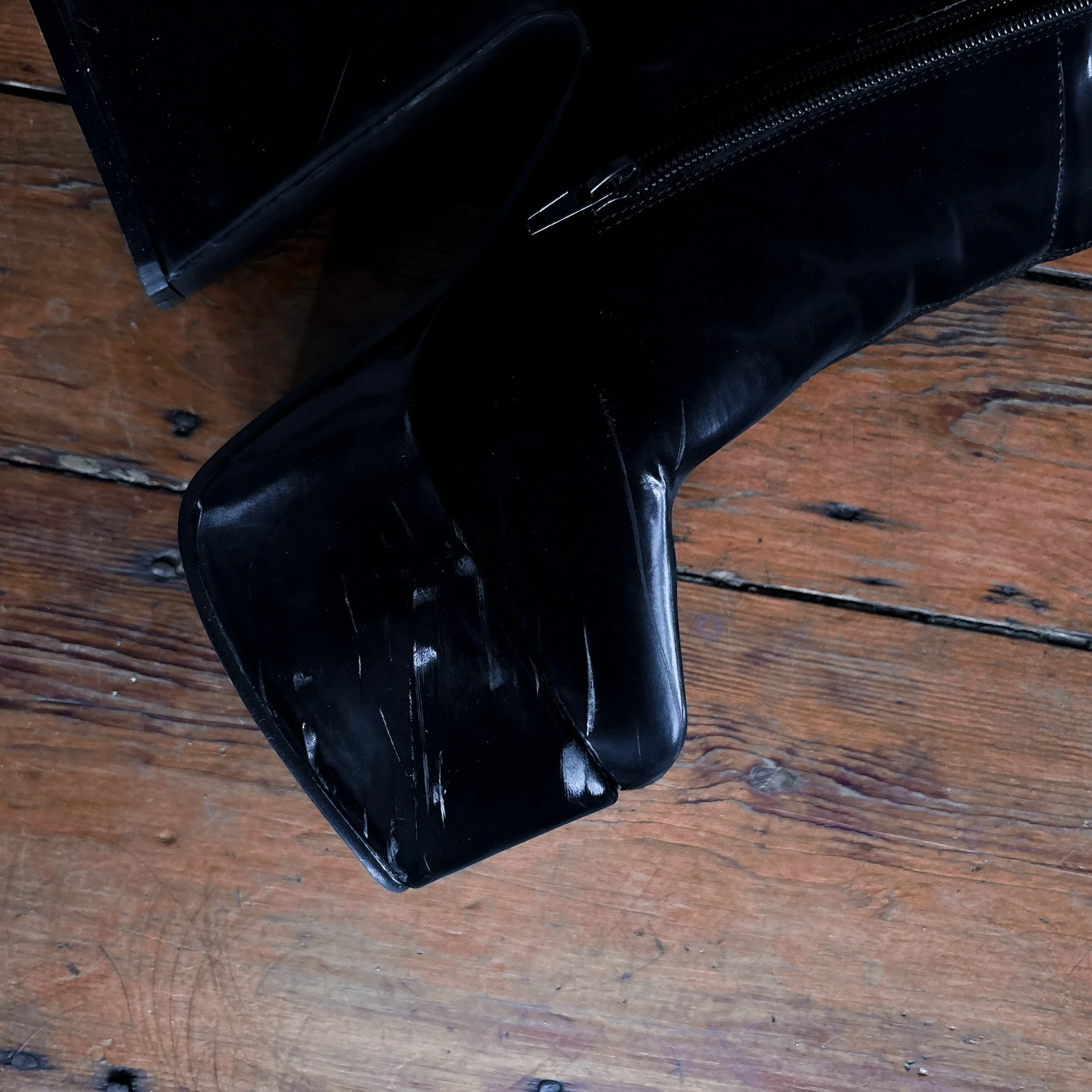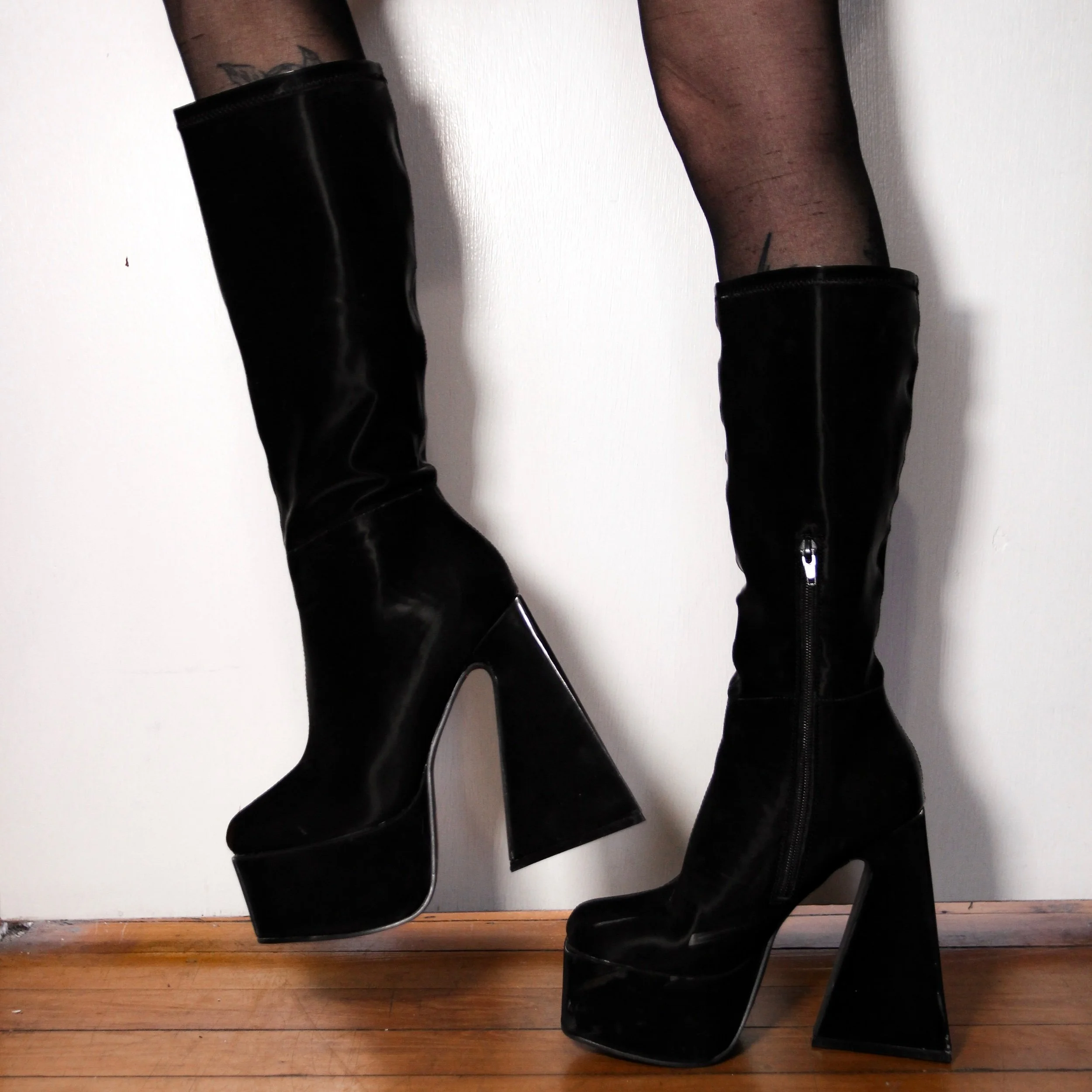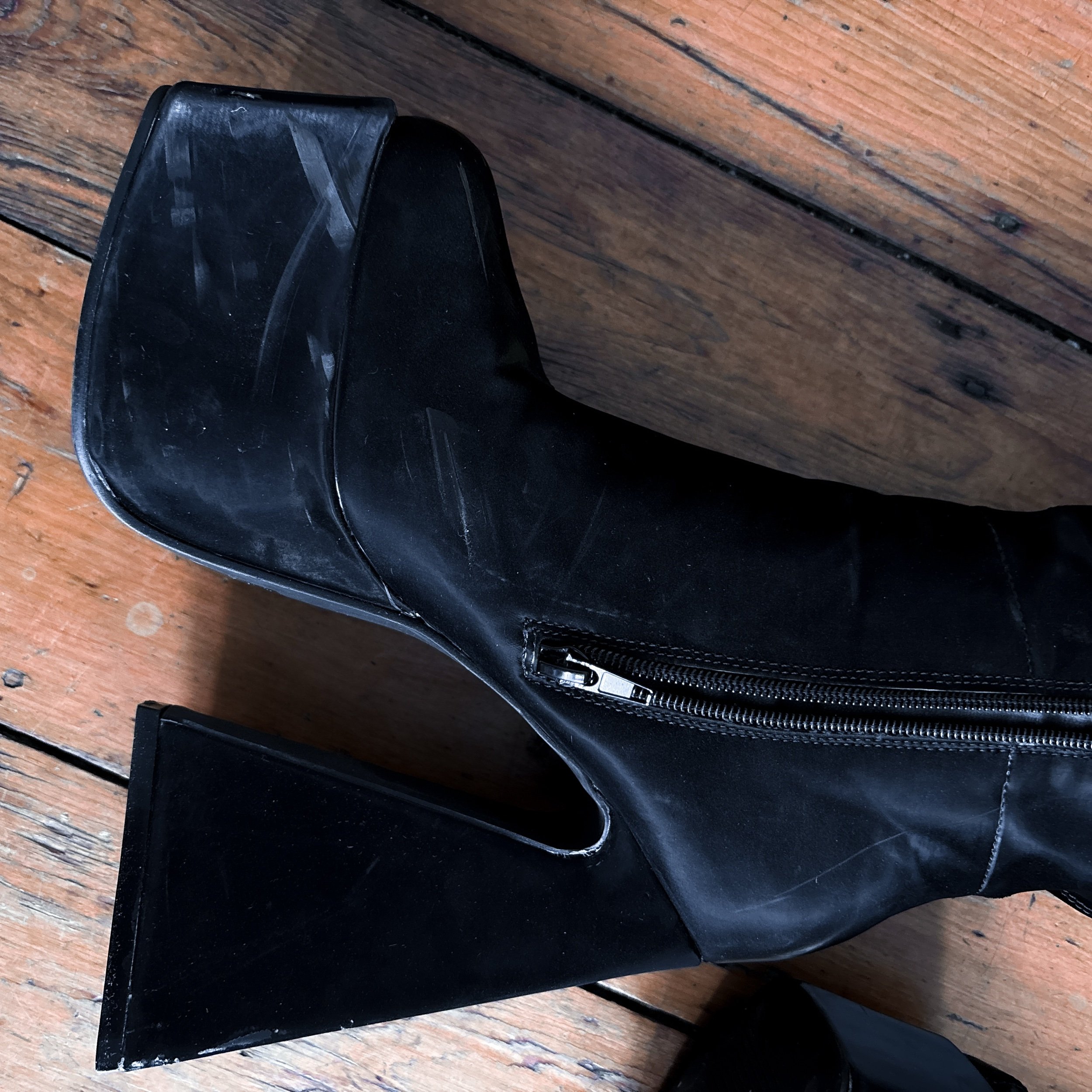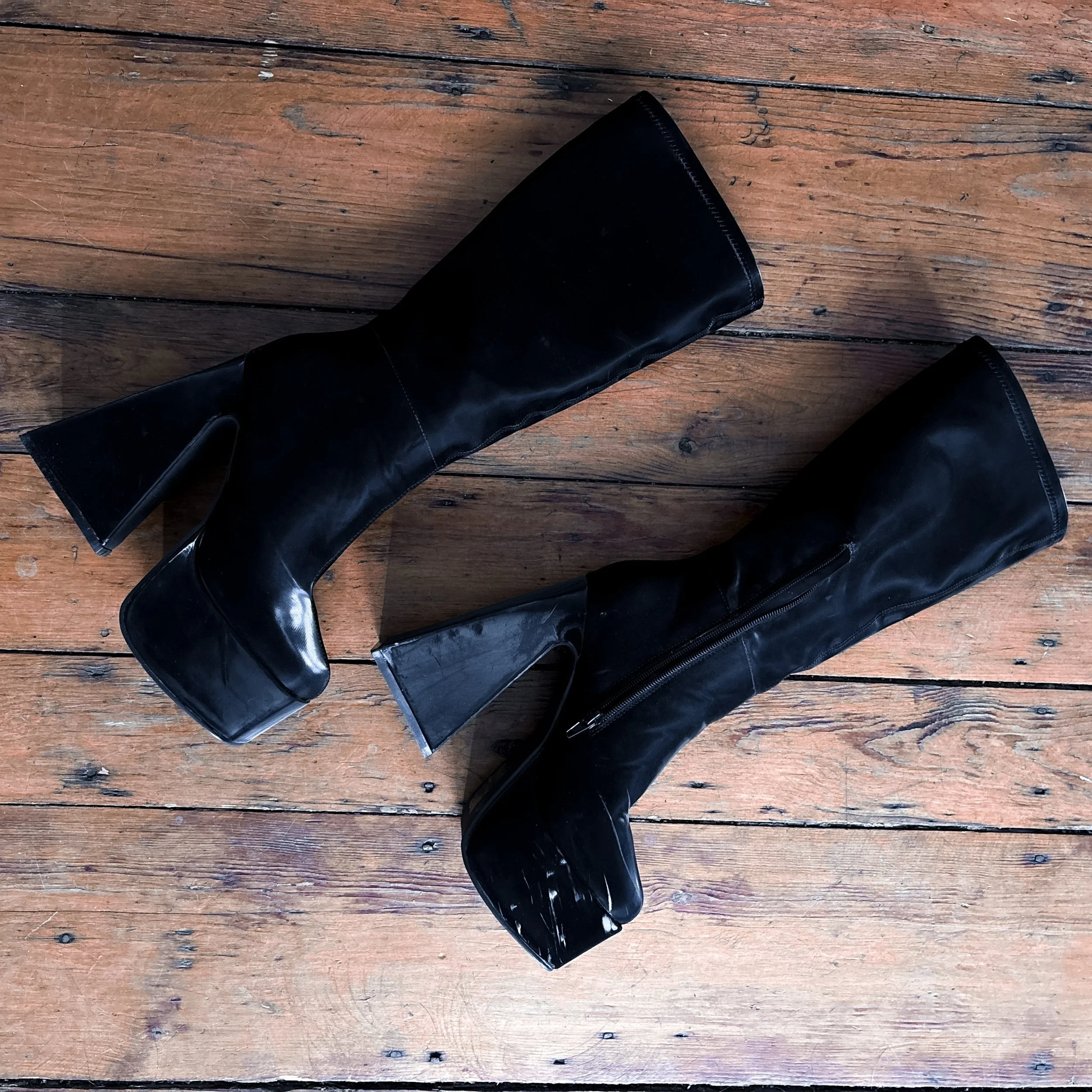 Black vinyl platform boots. Knee high with a square toe and retro triangular wedge platform heel. The fabric is so unique - it’s this neat, super shiny soft vinyl, like liquid velvet rather than plastic-y PVC. Surprisingly lightweight and very chunky.
