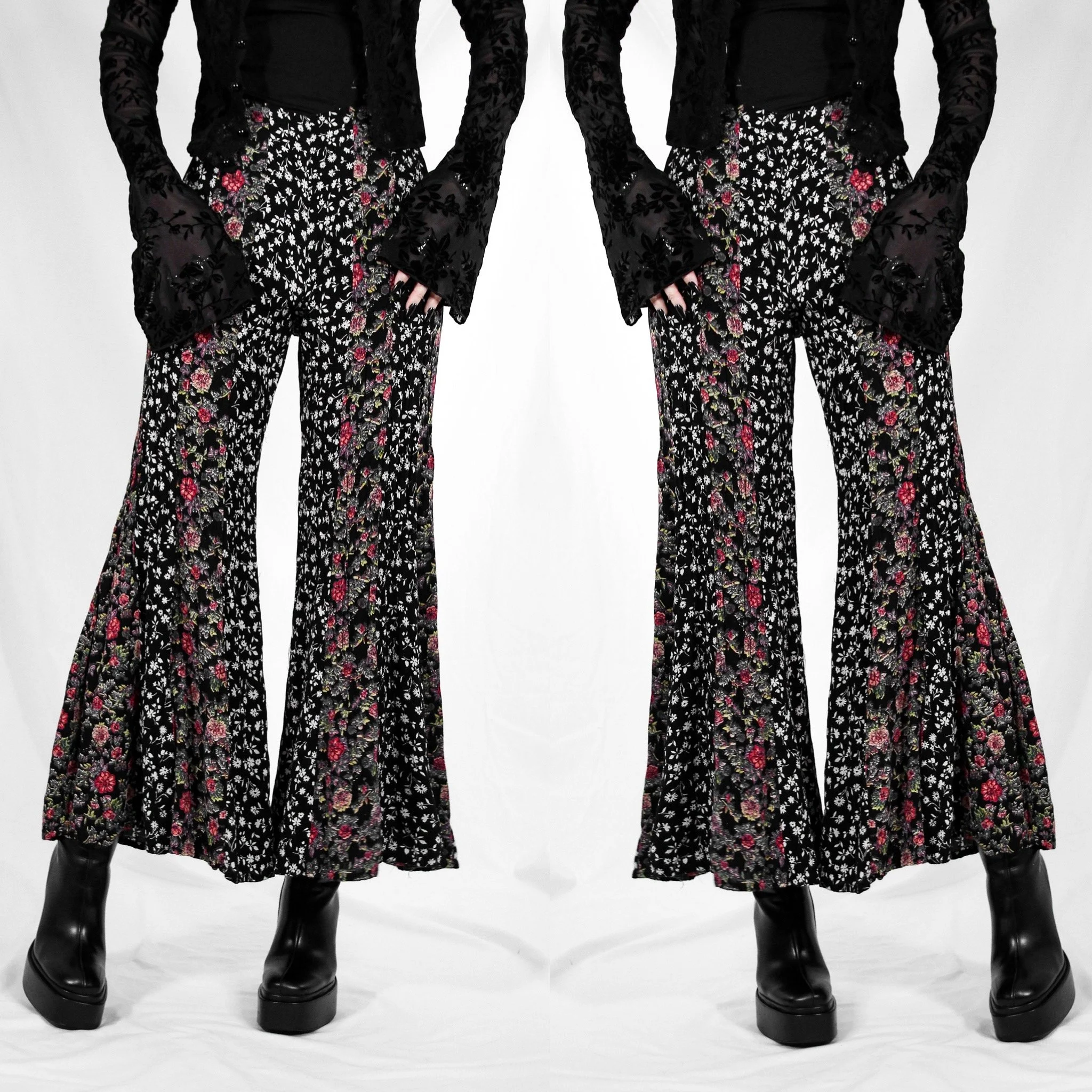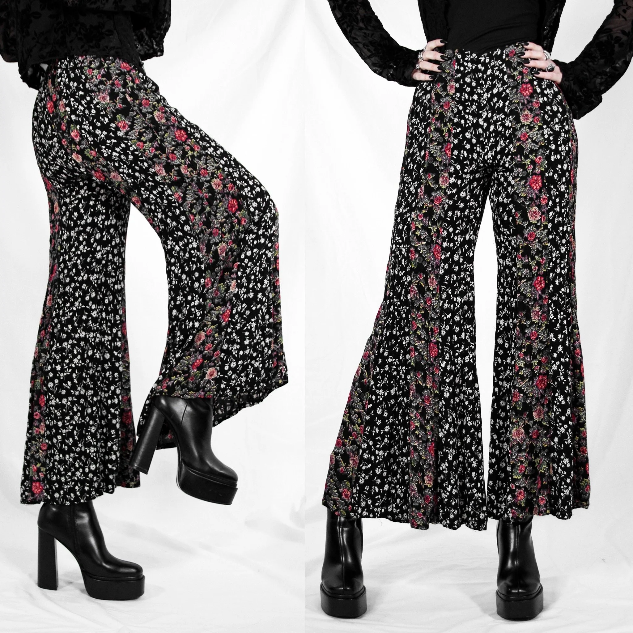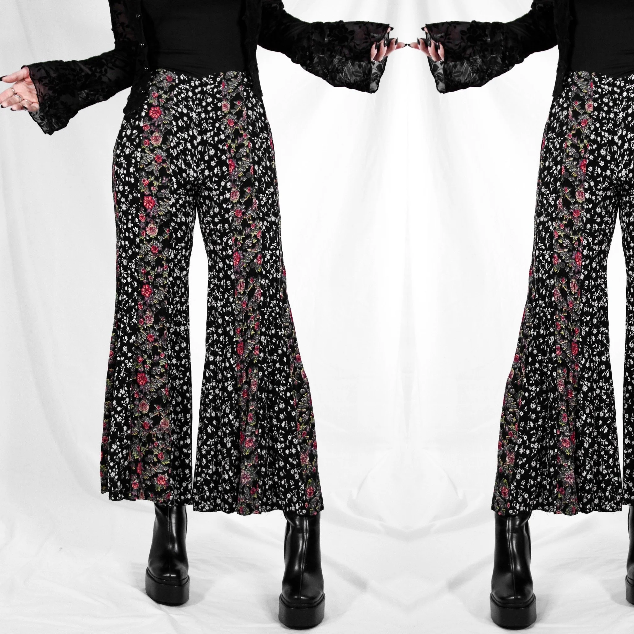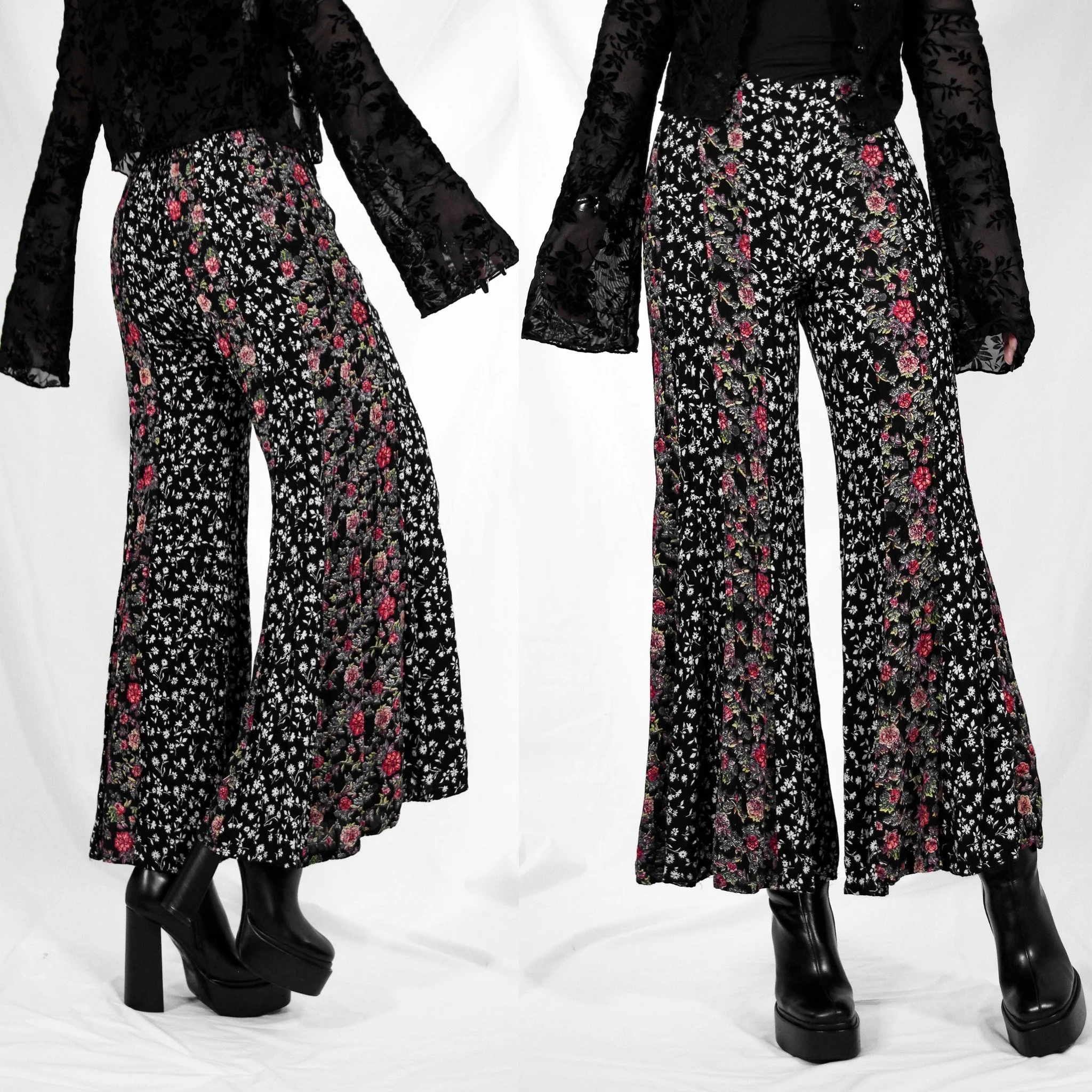 Vintage 90s Angie floral patchwork culottes. These are SO FUN and so unique, with a colorful calico print in mixed florals on black. Super flowy, cropped wide-leg with a huge bell-bottom flare. They look like a flowy midi skirt, but it’s actually pants! Can be worn mid or low waisted. Fabric is an ultra-light, perfectly broken-in, crinkle textured rayon blend. Pull-on style, unlined. Waist is ruched elastic in back and flat in front.