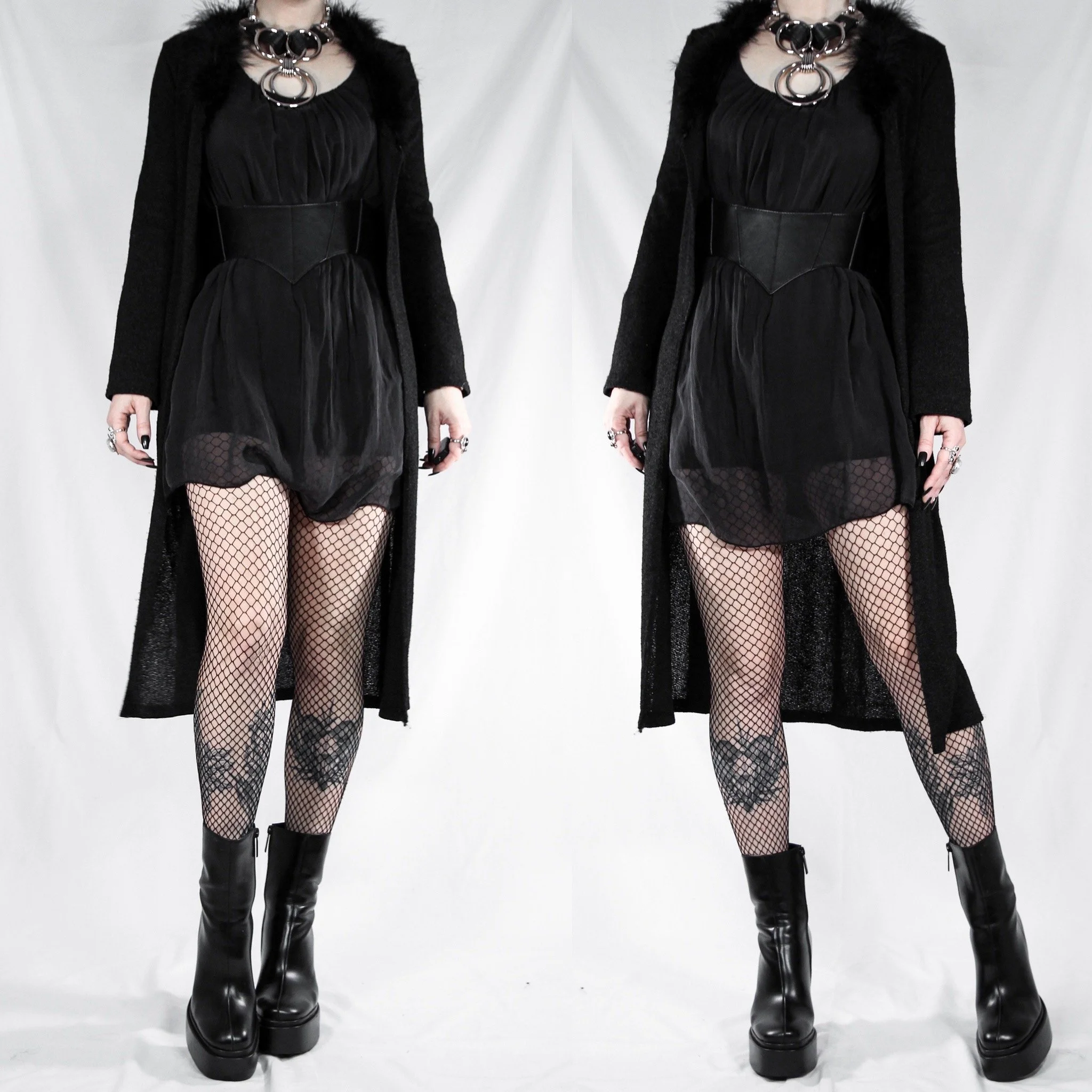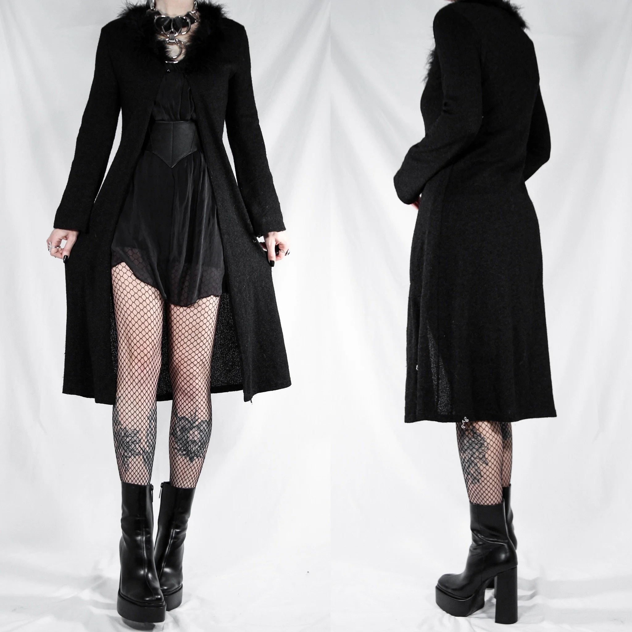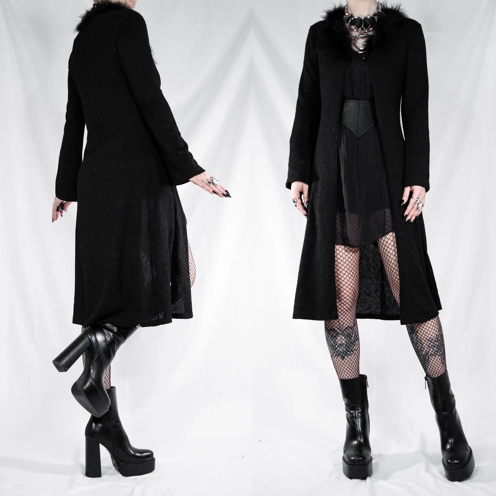 Vintage 90s Love & Kisses black knit duster cardigan. The ULTIMATE whimsigoth find, a true vintage relic and so on trend right now. Can also be styled as a cardigan or overdress, depending how you layer it! Textured, nubby lightweight knit fabric. Slim fitted cut, loose sleeves. Black maribou feather trim at the lapels. One button closure at the bust with a deep v-neck. Comfortable and so glamorous, perfect for a cozy night in watching vampire movies, or throw it on over all your everyday goth ‘fits.