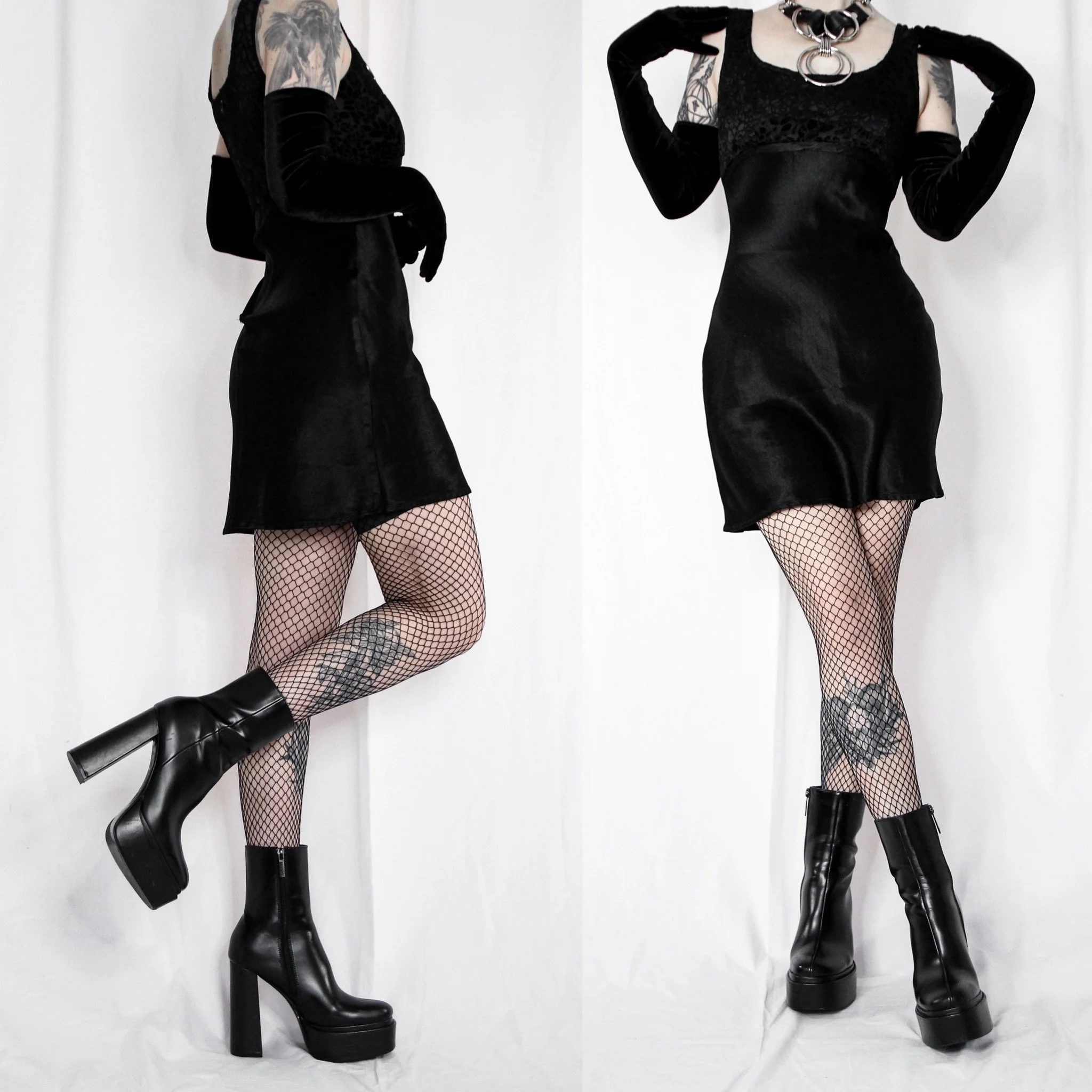 Vintage 90s Moll Step satin and velvet babydoll mini dress. So adorable and straight out of the 90s, looks like something seen in Sabrina the Teenage Witch! Fitted bodice in a black-on-black floral velvet burnout. Satin trim empire waist with a short, flowy satin skirt. Back zip, top has a bit of stretch. Unlined.
