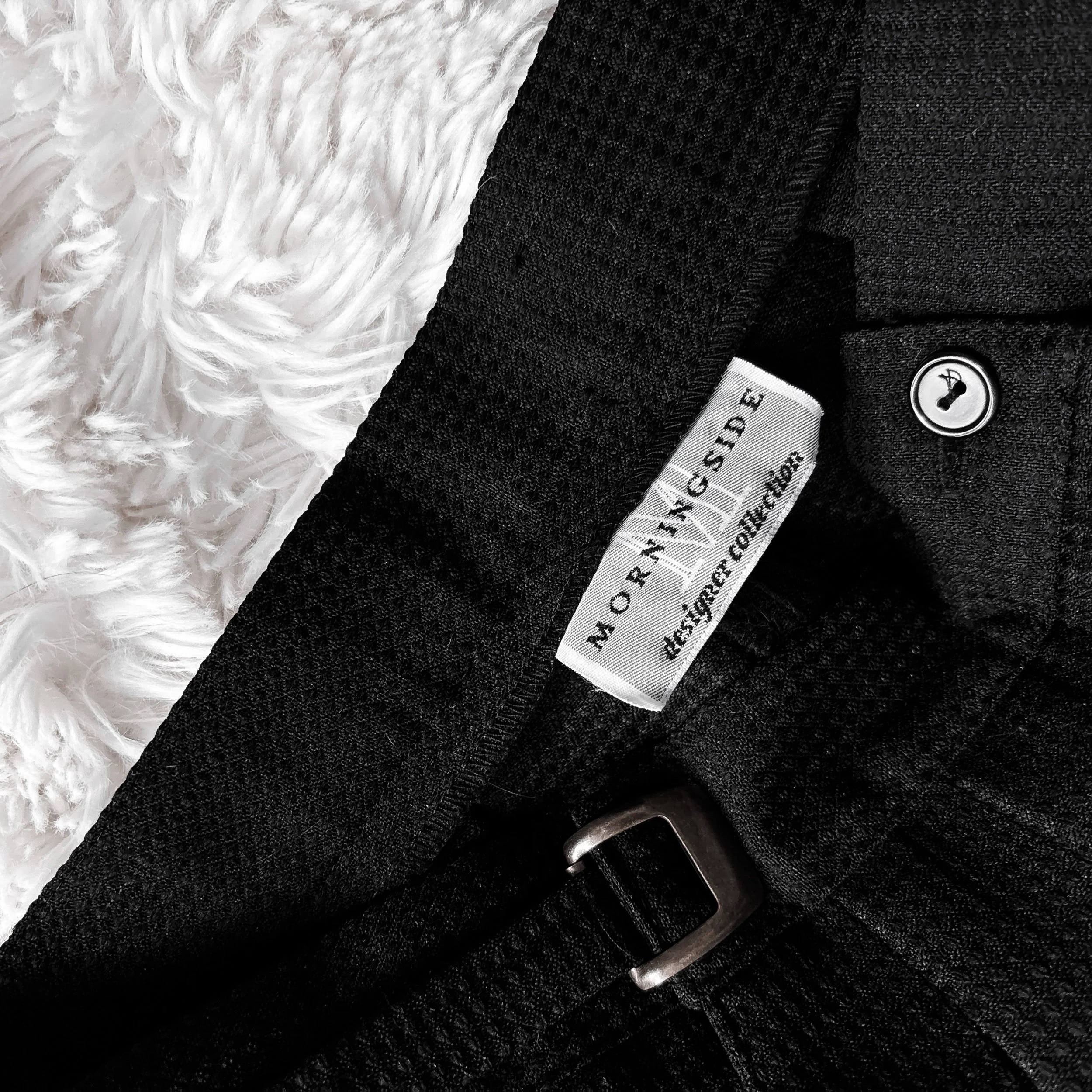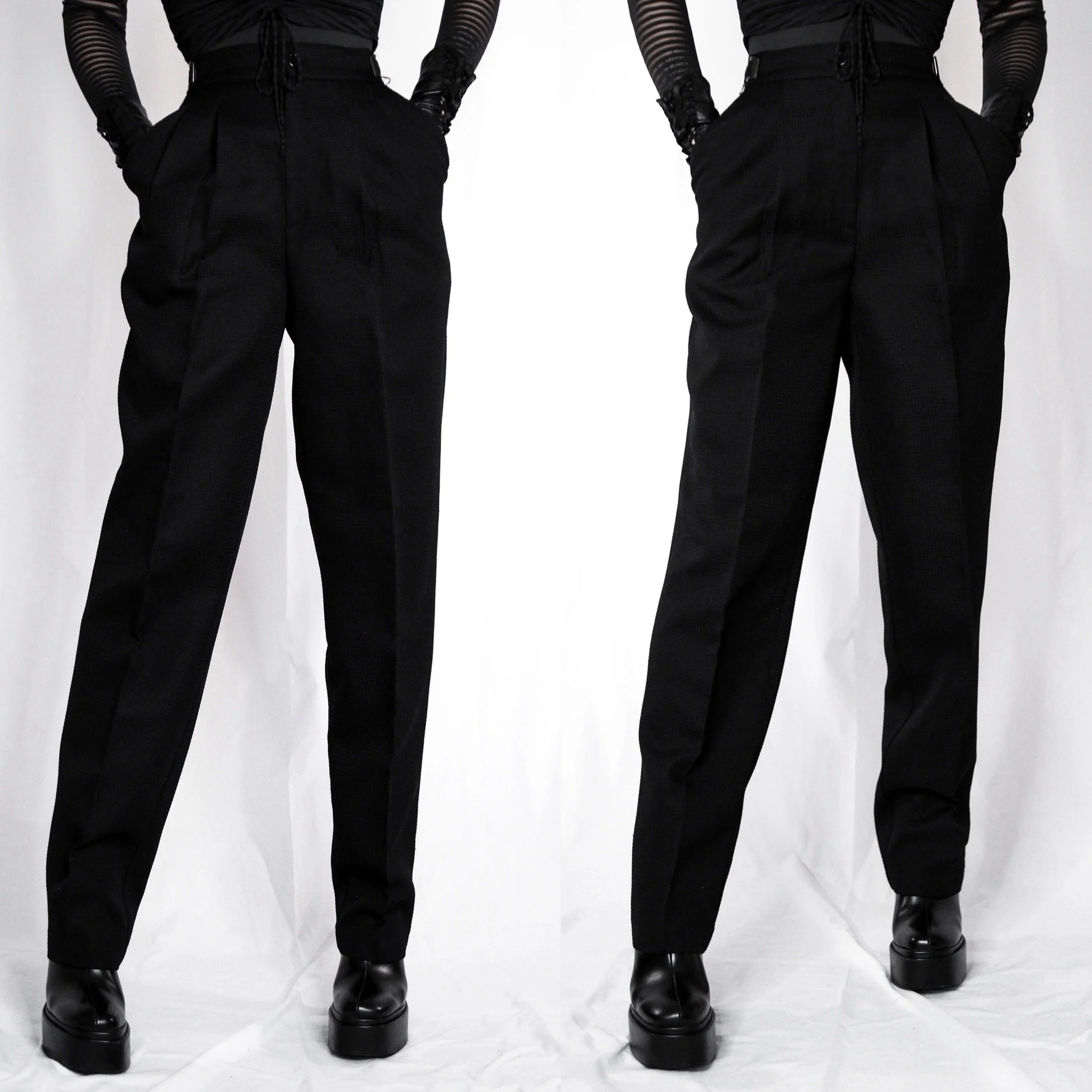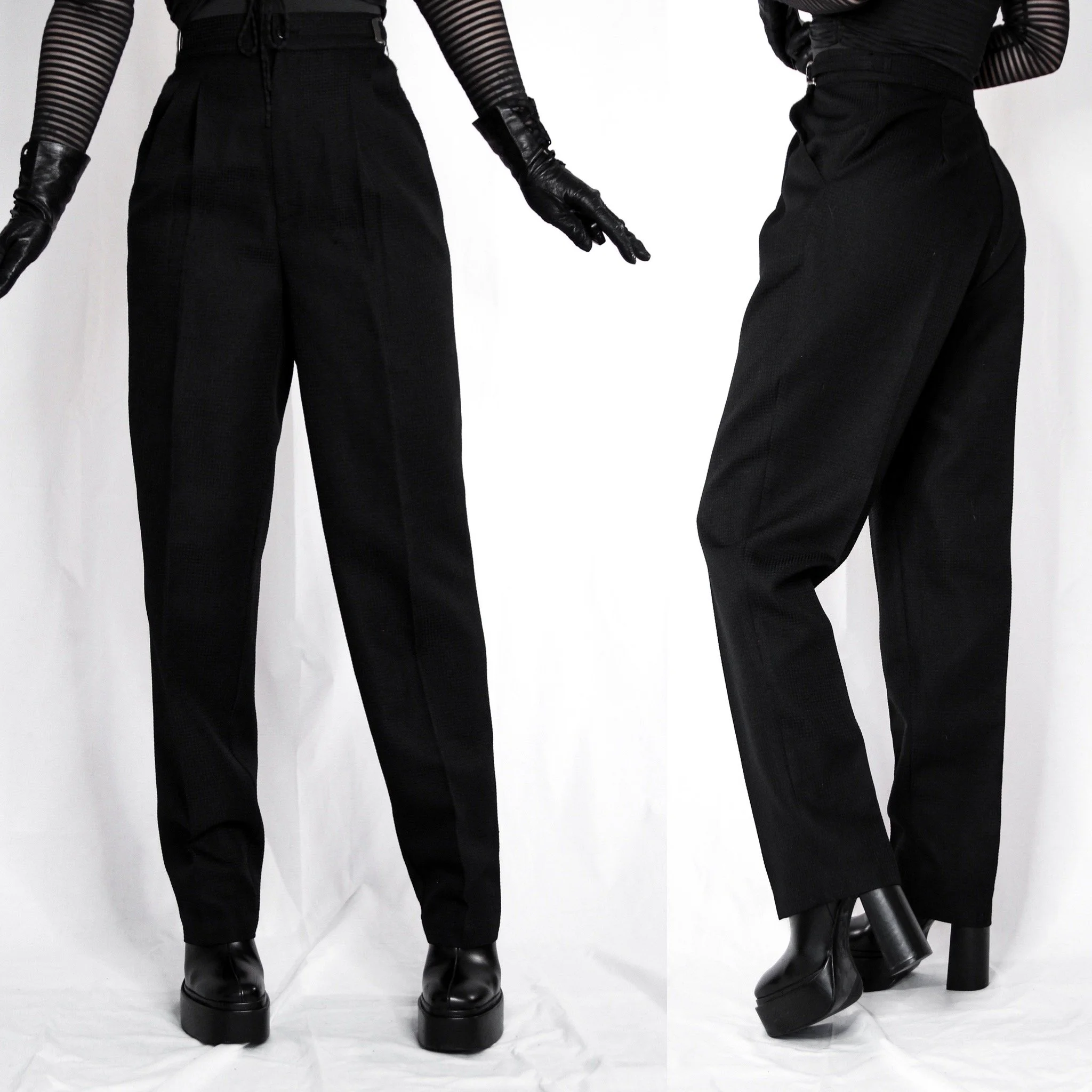 Vintage 90s Morningside tapered trousers. These have so many unique details! Perfect for the office goths but easy to dress up, or wear them as comfy everyday pants. Super high rise and a tapered wide leg. Textured knit suit fabric is polished, super soft and luxe. Burnished nickel buckle details on either side of the waist. No stretch, unlined. Front pleating and deep side faux pockets (they are not sewn shut on the inside). Zip fly with button closure at the top. Fitted waist and roomy in the hips.