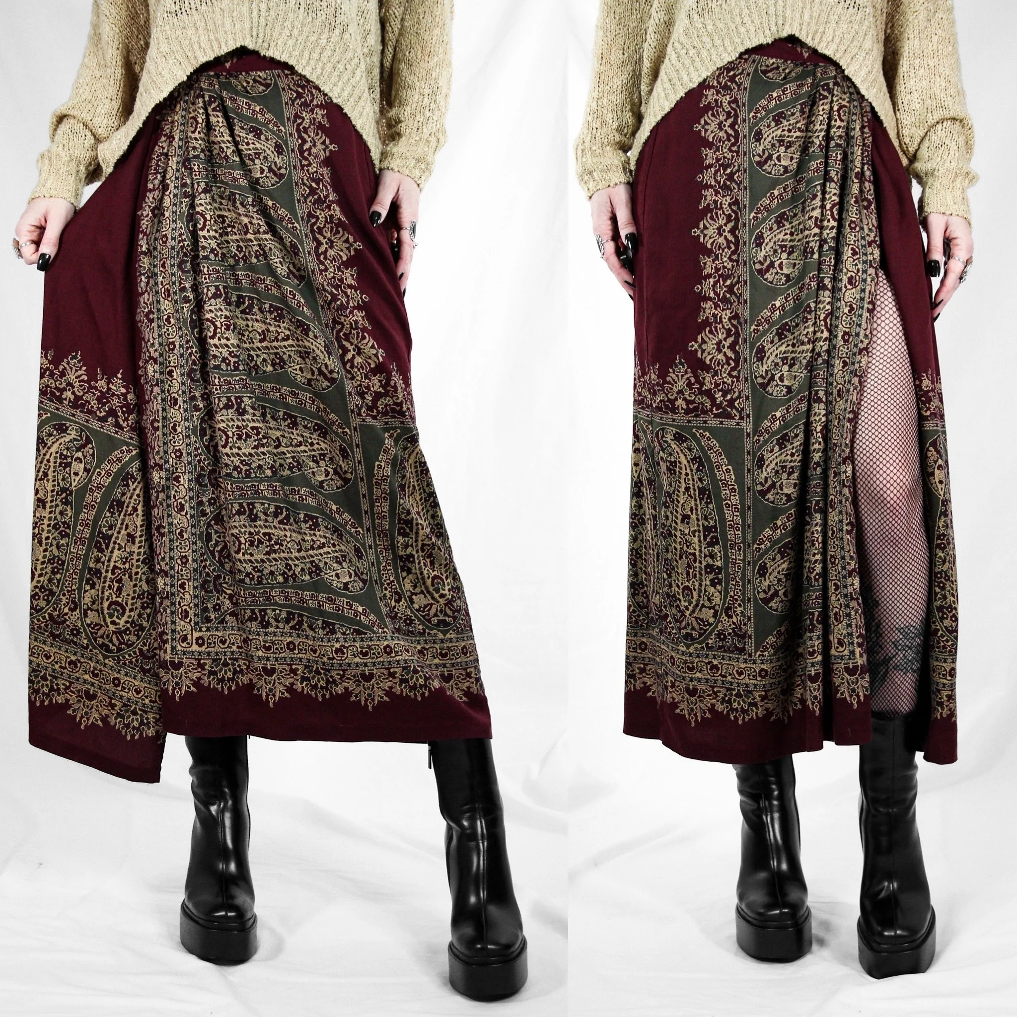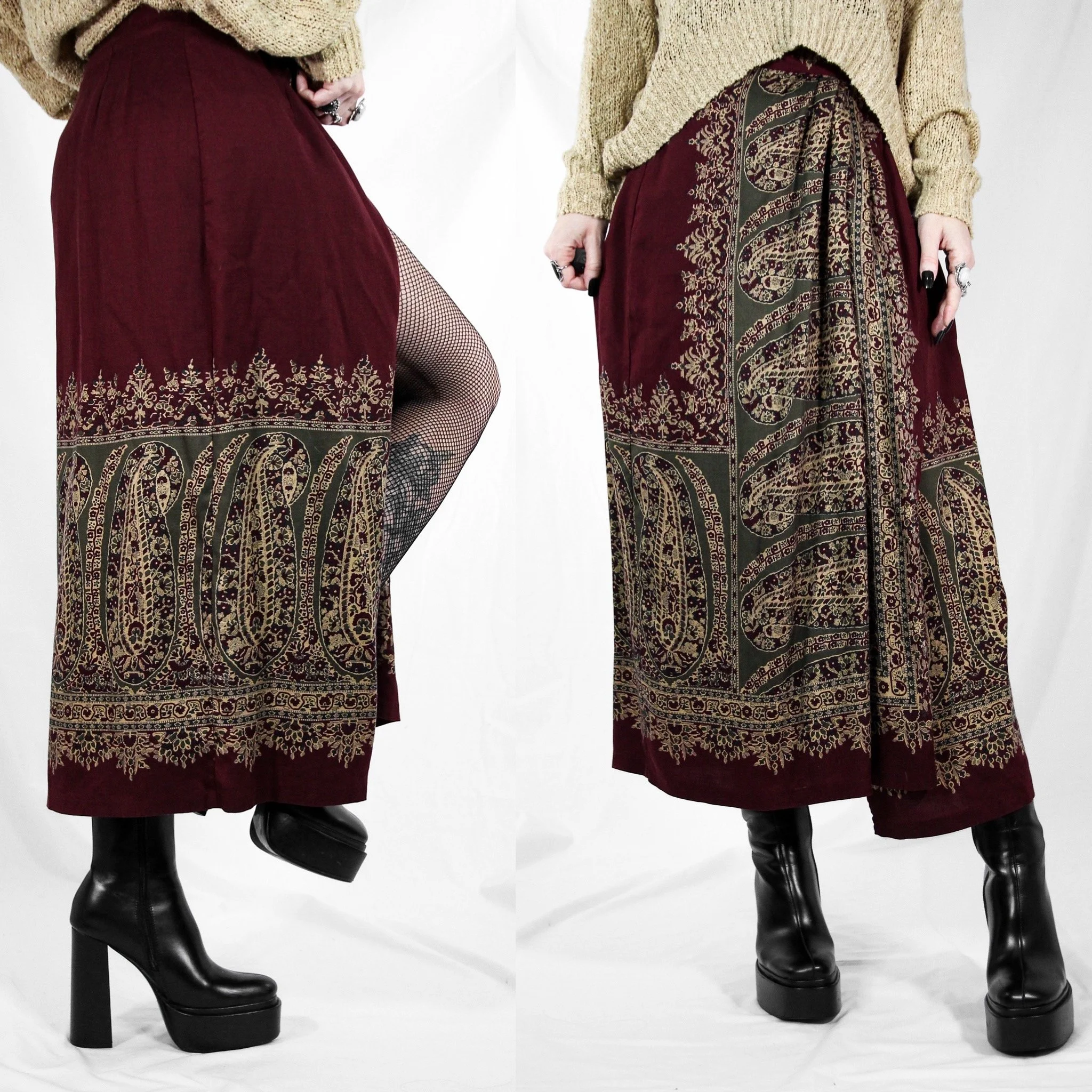 Vintage 90s Banana Republic wrap maxi skirt. Pretty dark academia-style paisley print with burgundy, olive, tan and black. Straight cut with a foldover wrap panel. Double button closure at the waist. Fabric is a midweight, ultra-soft 100% rayon. Unlined, no stretch.