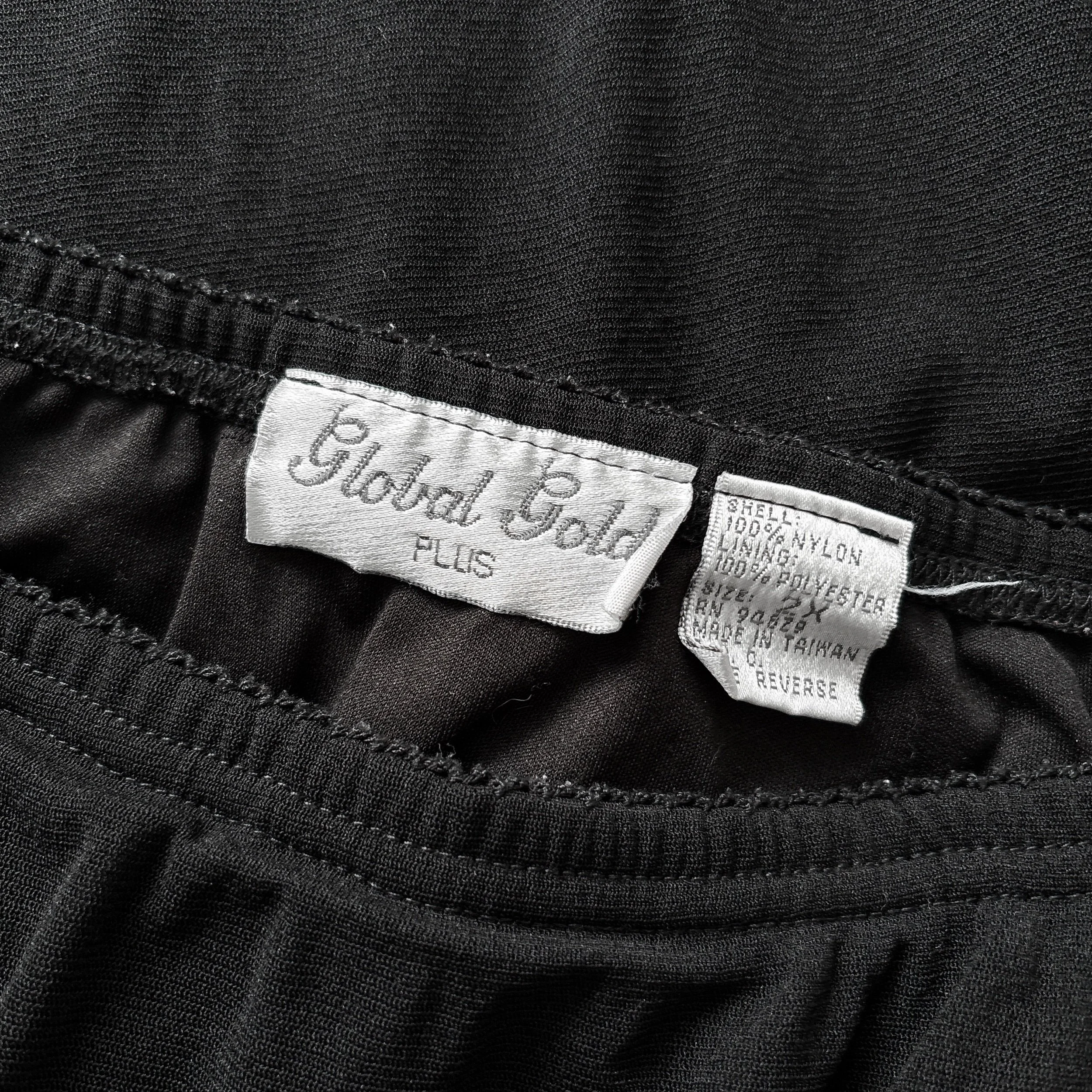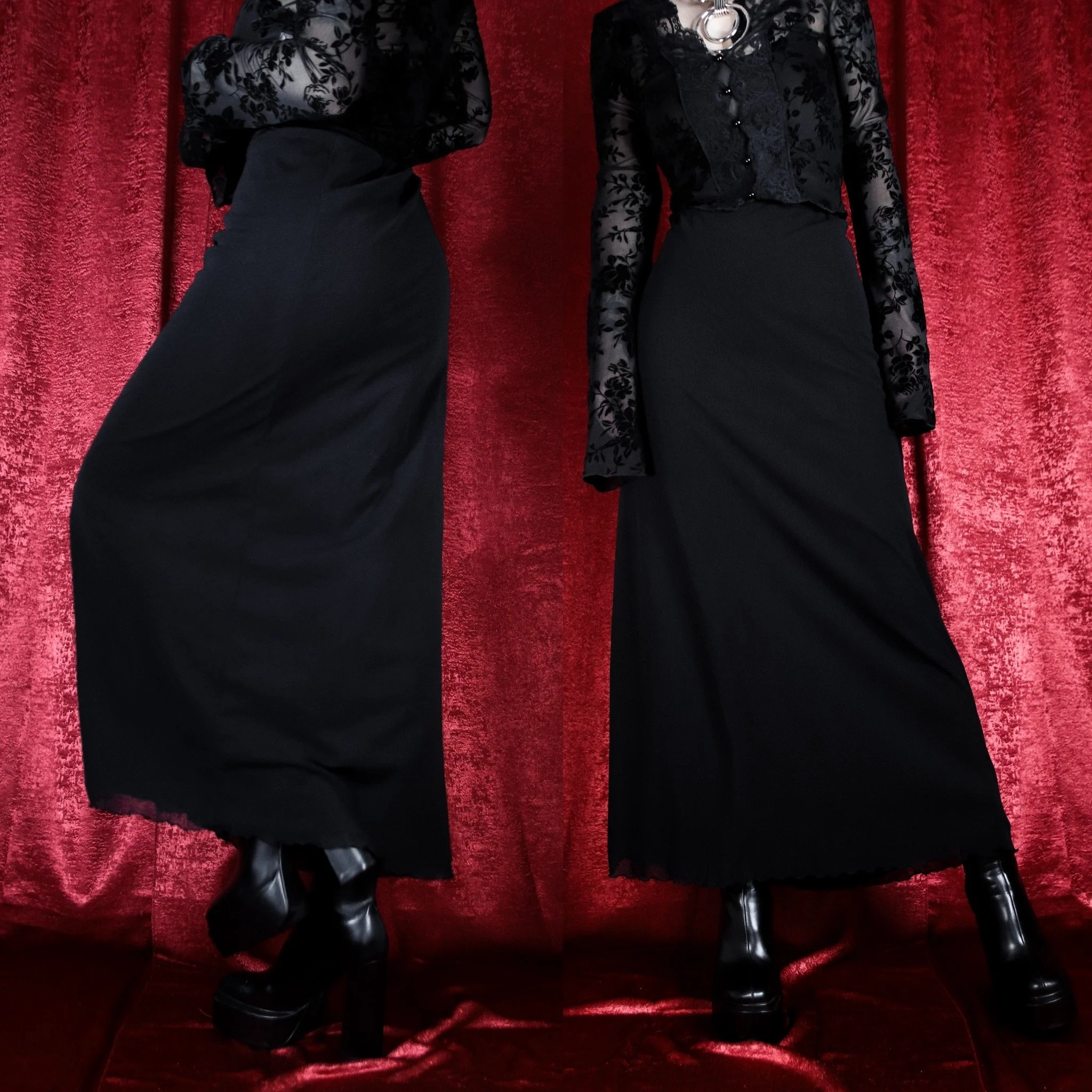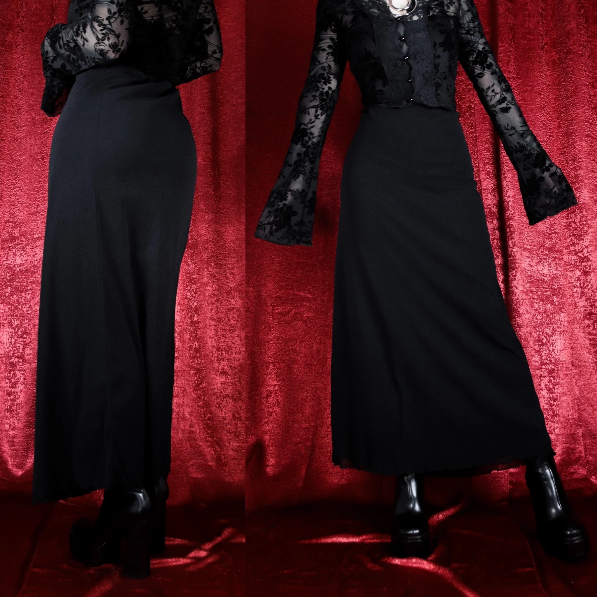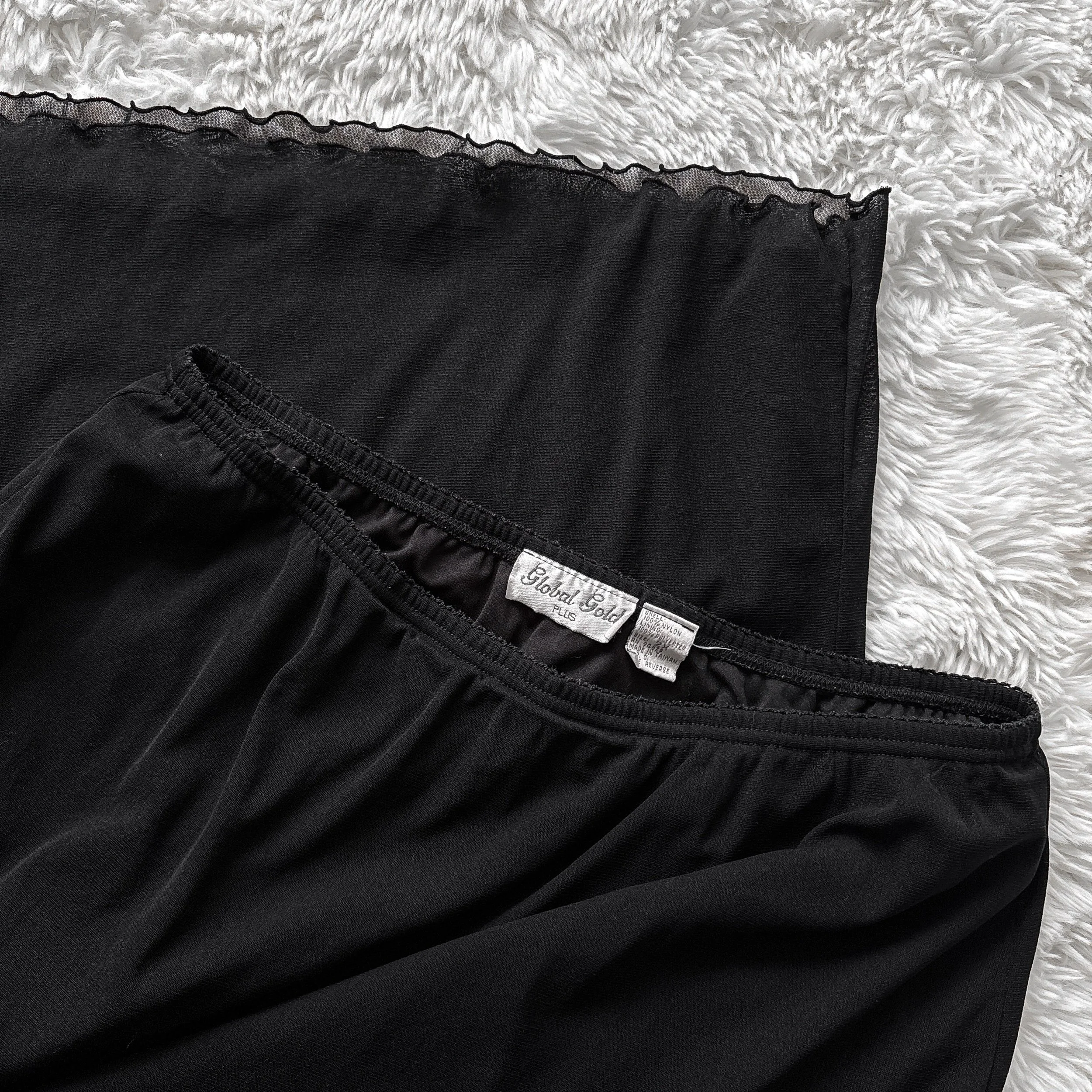 Vintage 90s Global Gold witchy black maxi skirt. This one is so cool, with lots of goth-inspired details! Double-layered, features a sheer mesh overlay with a built-in soft poly liner. Both layers have lettuce edge trim at the hem. Straight cut, slight flare from the waist down. Your new favorite everyday layering skirt and perfect for the office. Pull-on style with an elastic waist.