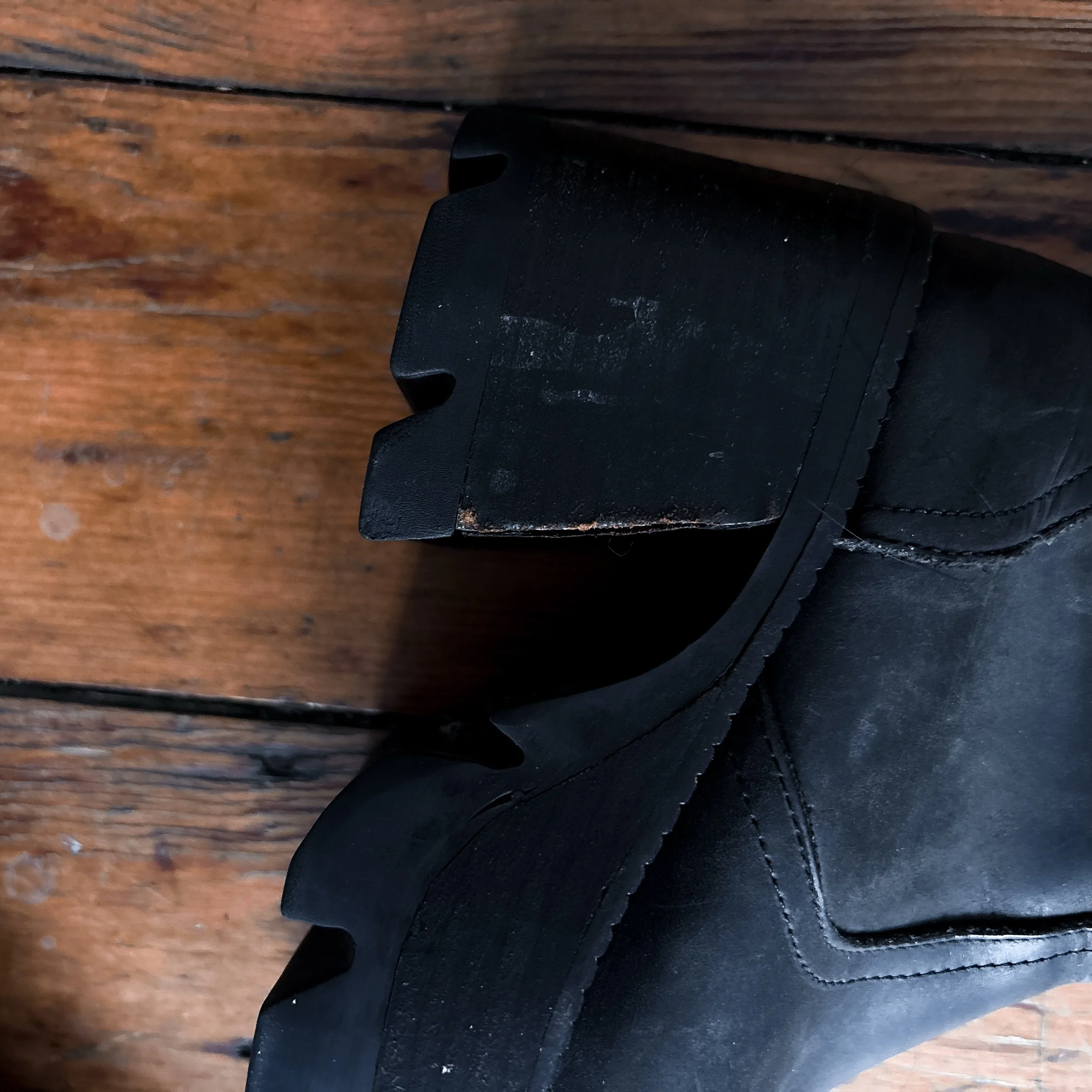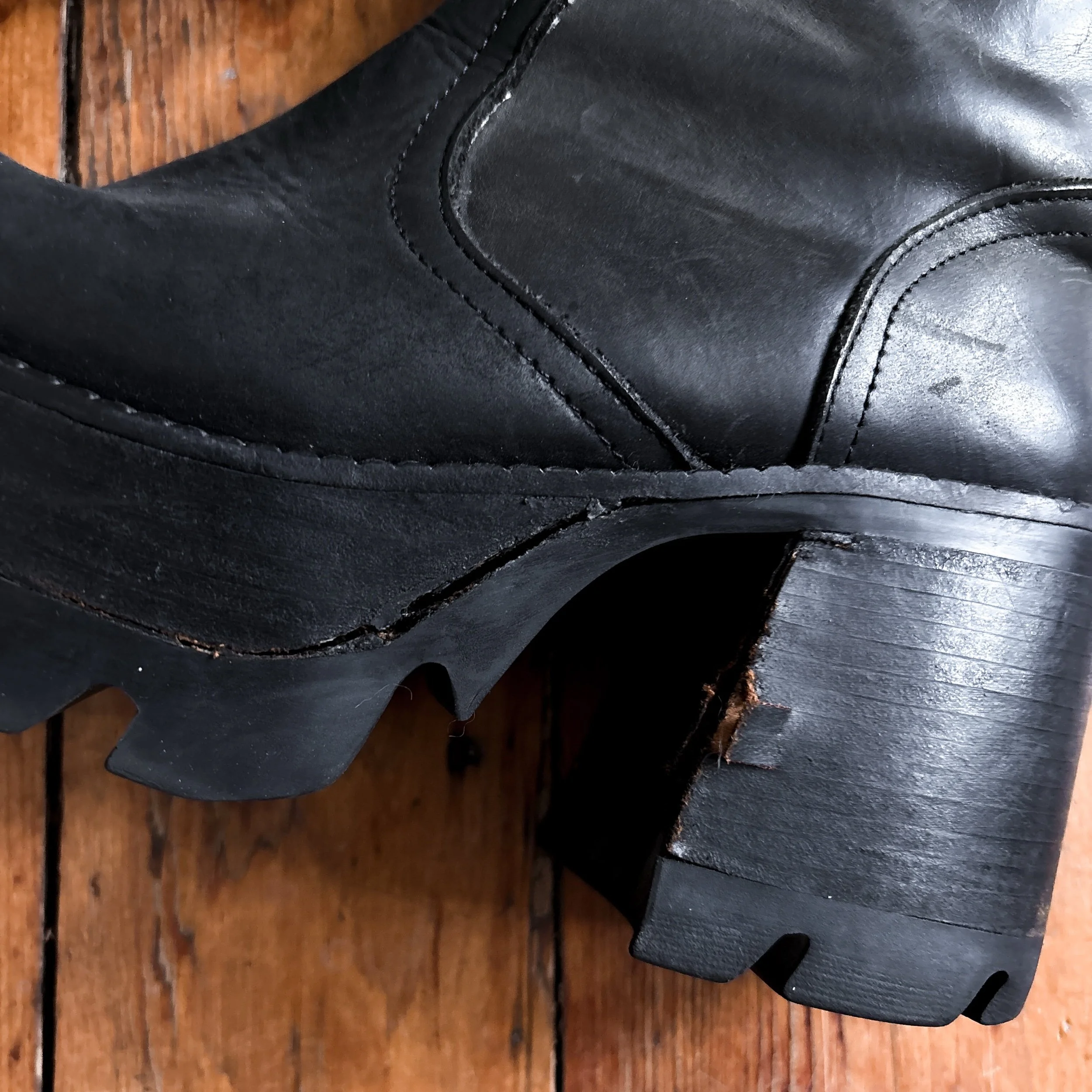 Vintage 90s authentic Destroy brand black platform boots. Real leather with a chunky rubber platform sole and thick wooden platform heels. Inside zippers. This is the original 90s brand that Unif and many other 90s/Y2K reproduction street style brands have modeled their shoe designs off of. Real Destroy boots are incredibly rare and are often resold for $200-$300+. This particular classic goth boot style is insanely hard to find!