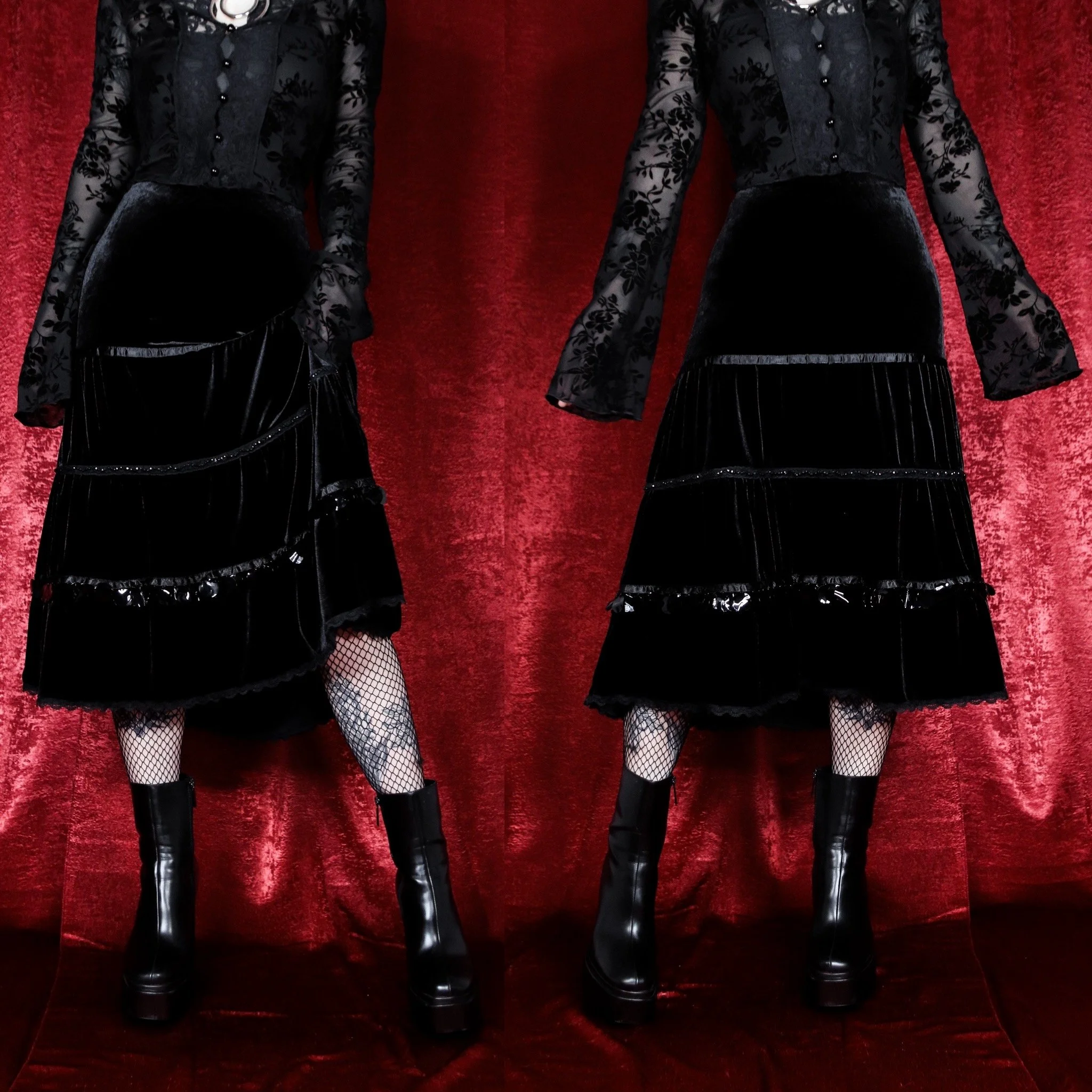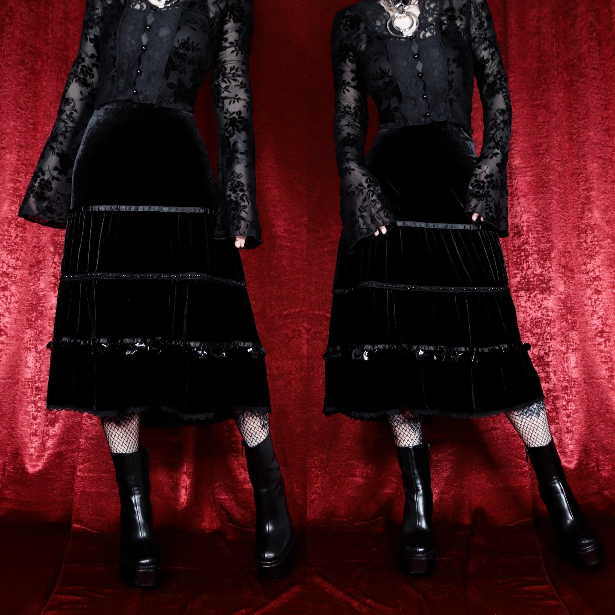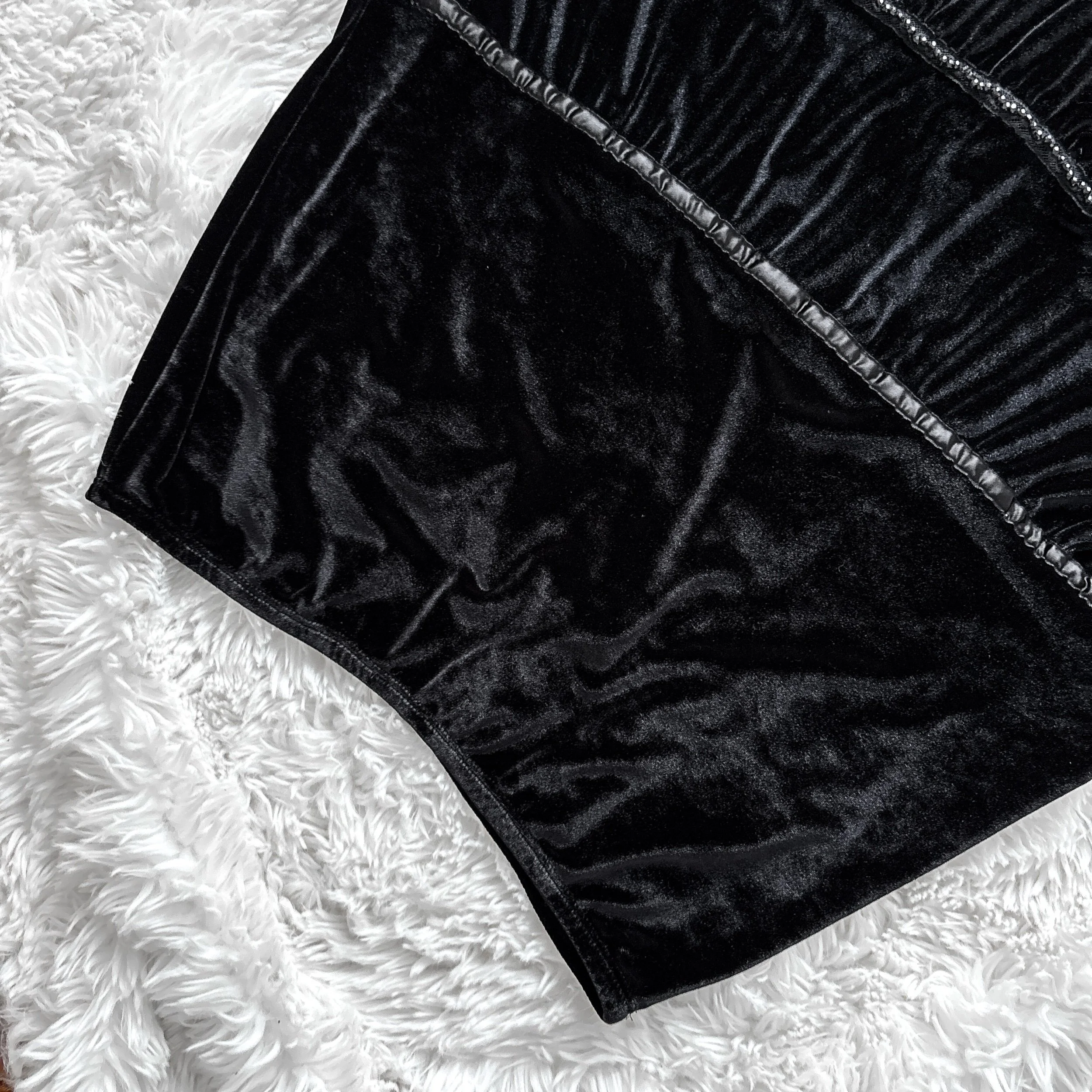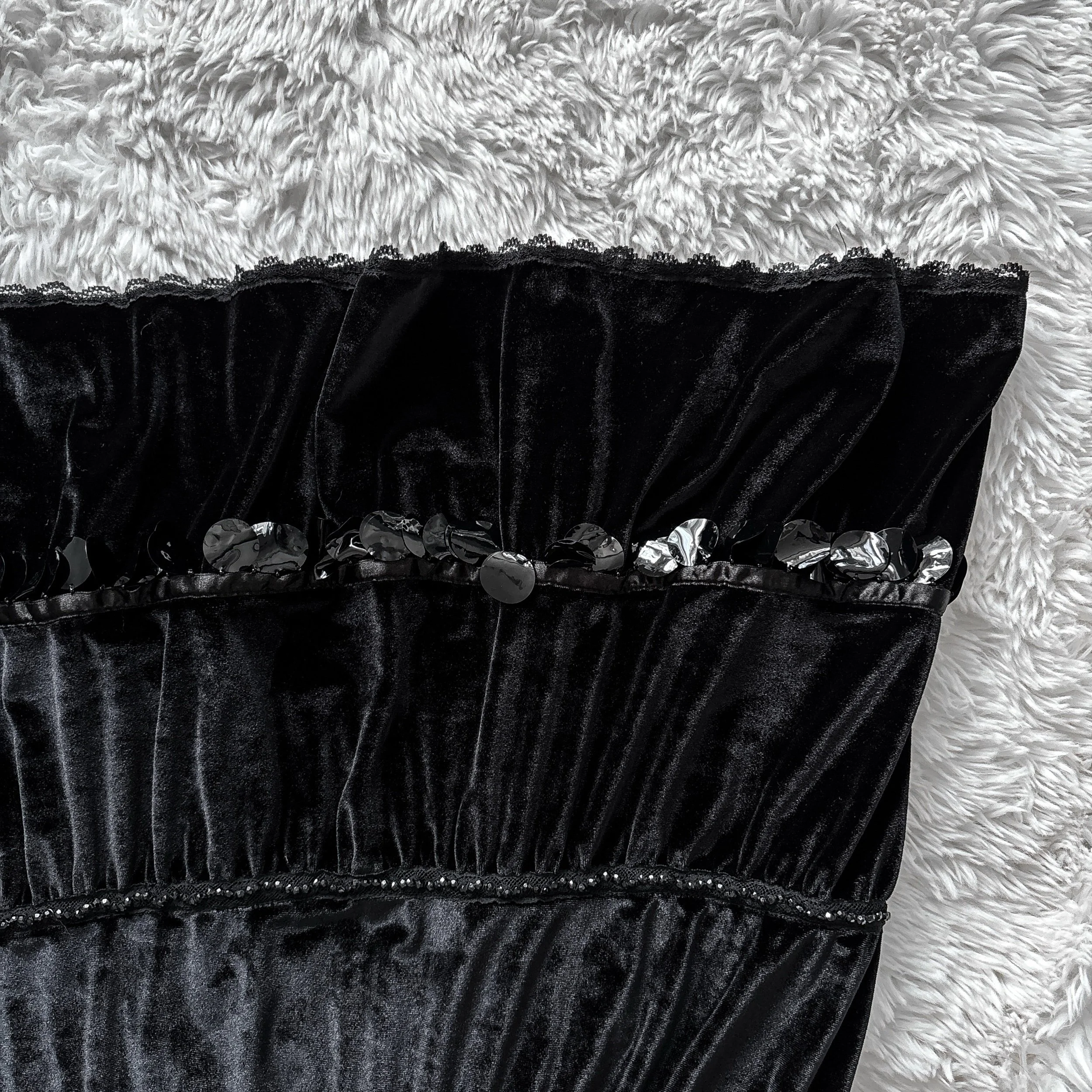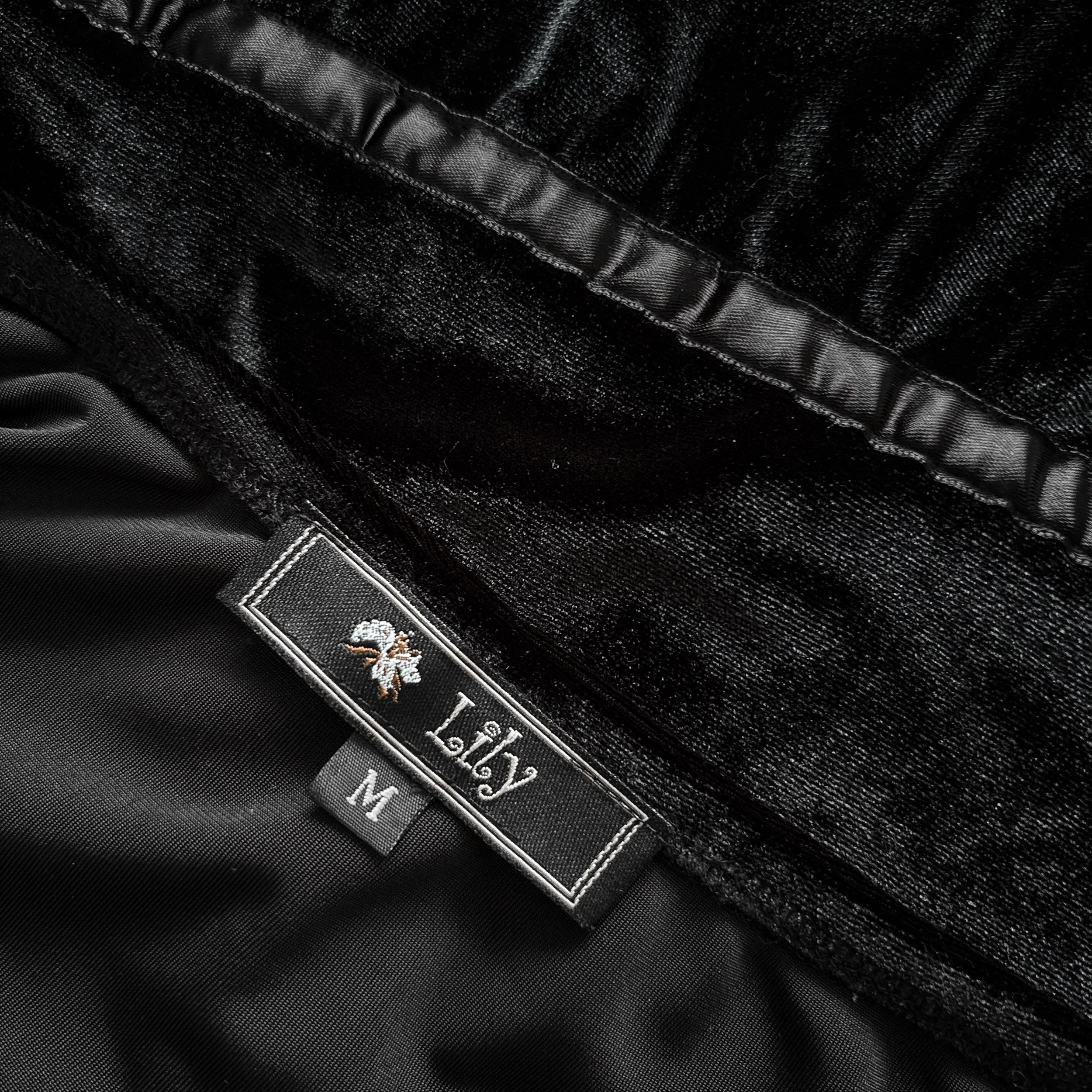 Vintage 90s Lily velvet skirt. Classic whimsigoth-witchy vibes, sure to be a staple in your wardrobe! Tiered A-line flared cut in soft, deep black velour velvet. Satin ribbon trim, lace trim at the hem, and seed bead detailing. Hem features oversized sequin fringe that jingles when you walk. Elastic waist, pull-on style, poly-spandex blend velvet is stretch yall over. Unlined.