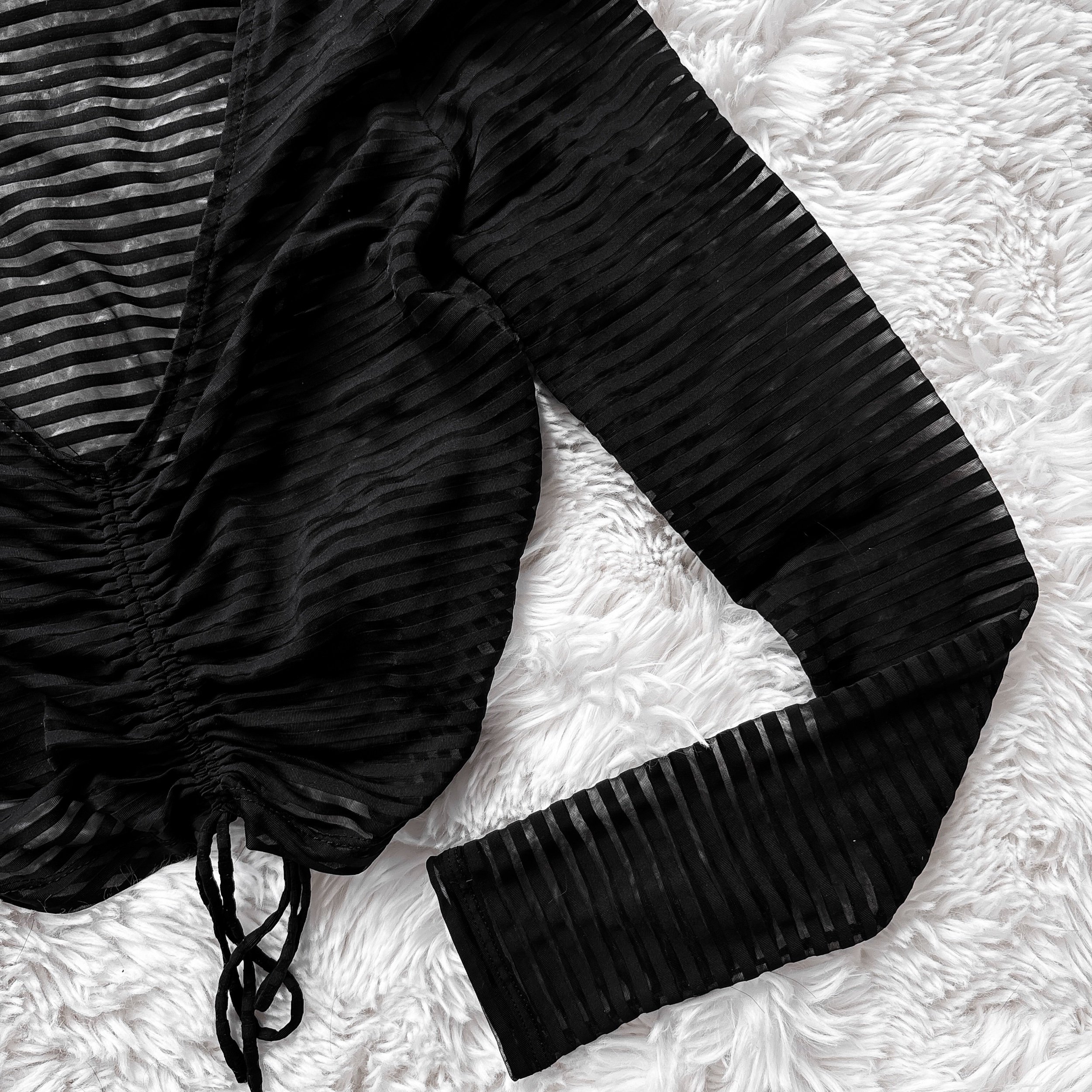 Modern Out From Under sheer stripe crop top. Originally from Urban Outfitters, in like-new condition. Ruched front with adjustable ties at the waist. Long sleeves. Stretchy all over, pull-on style, unlined.
