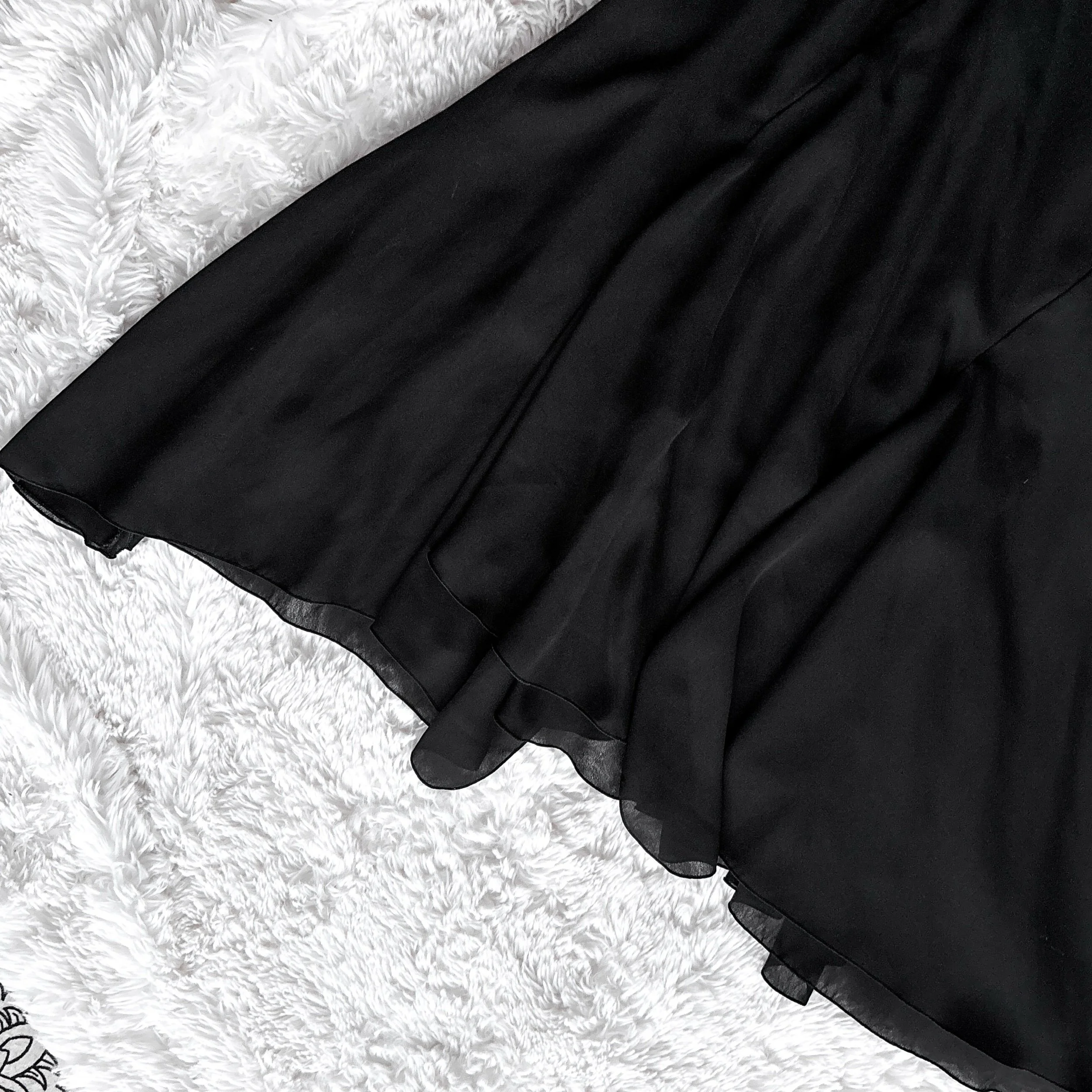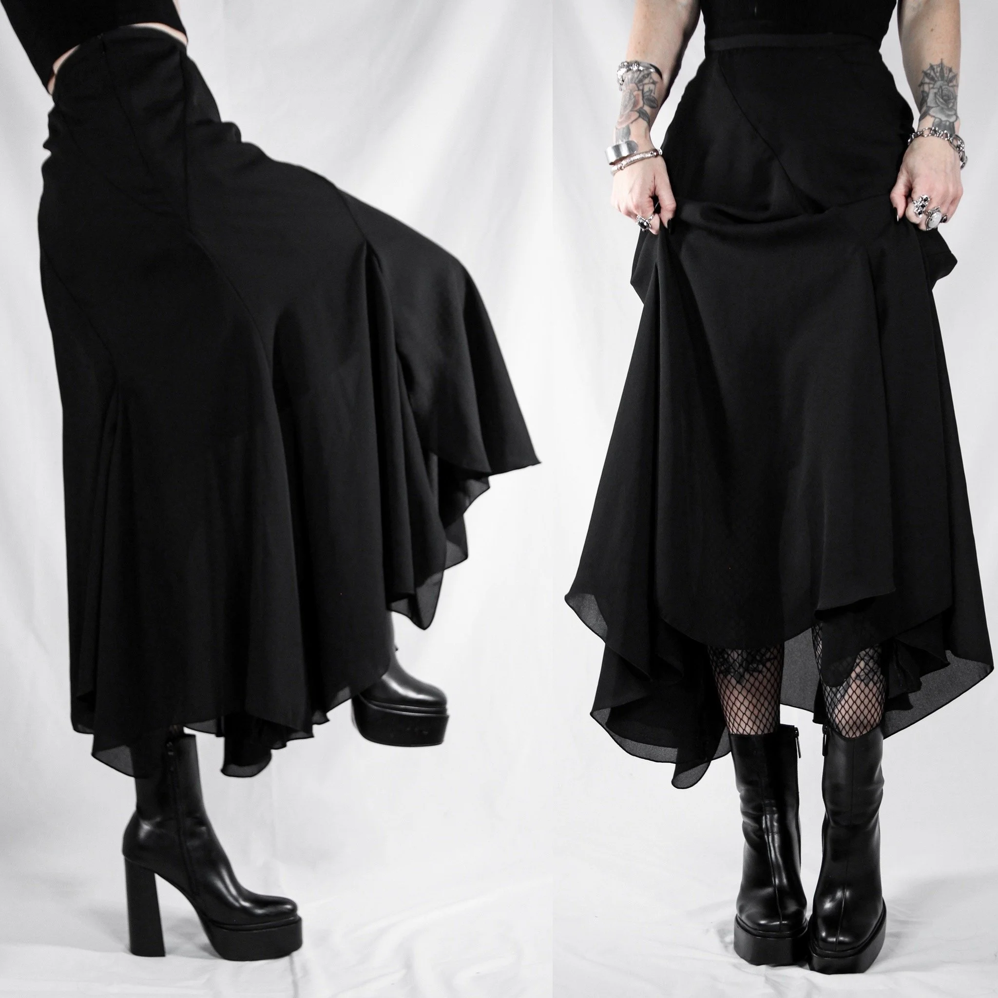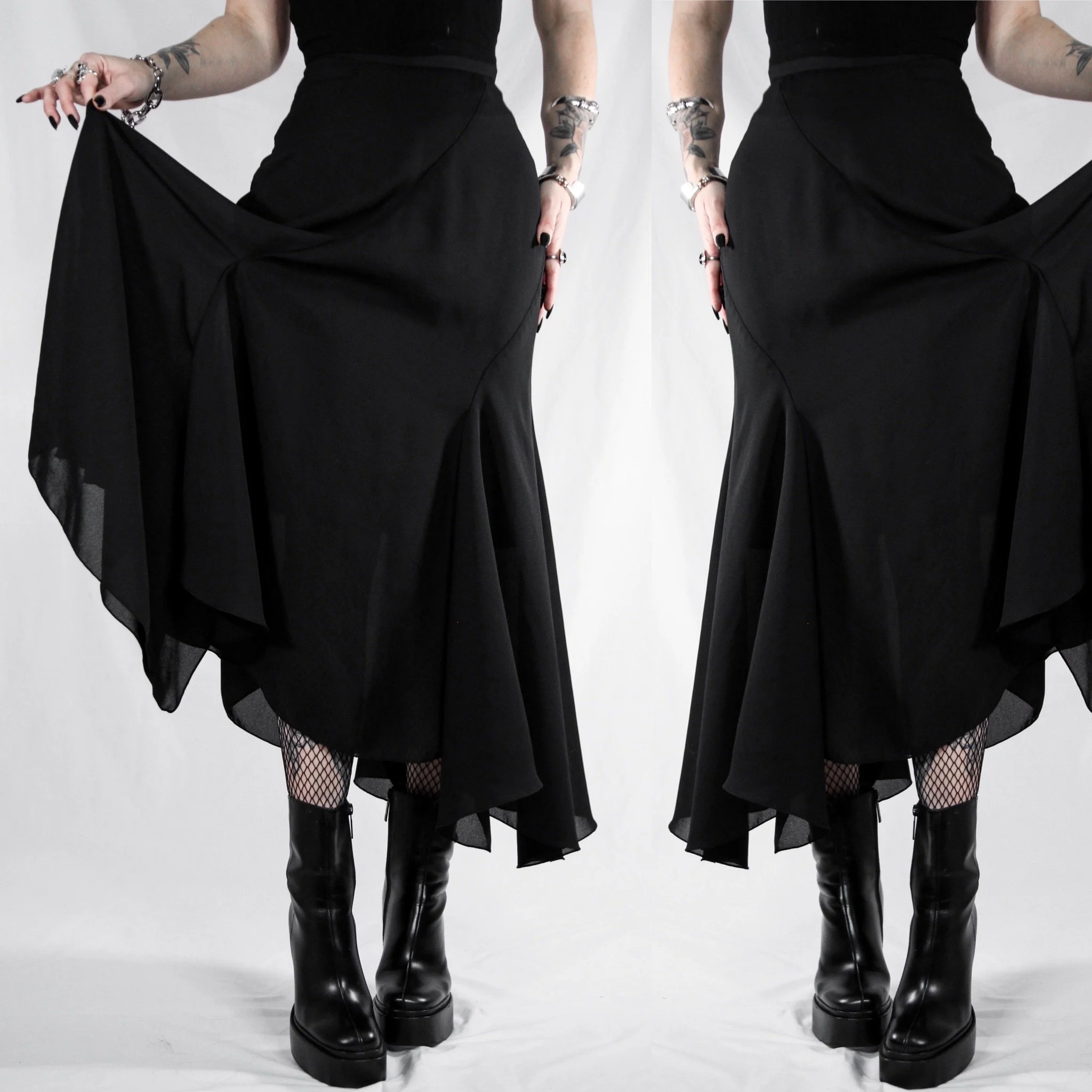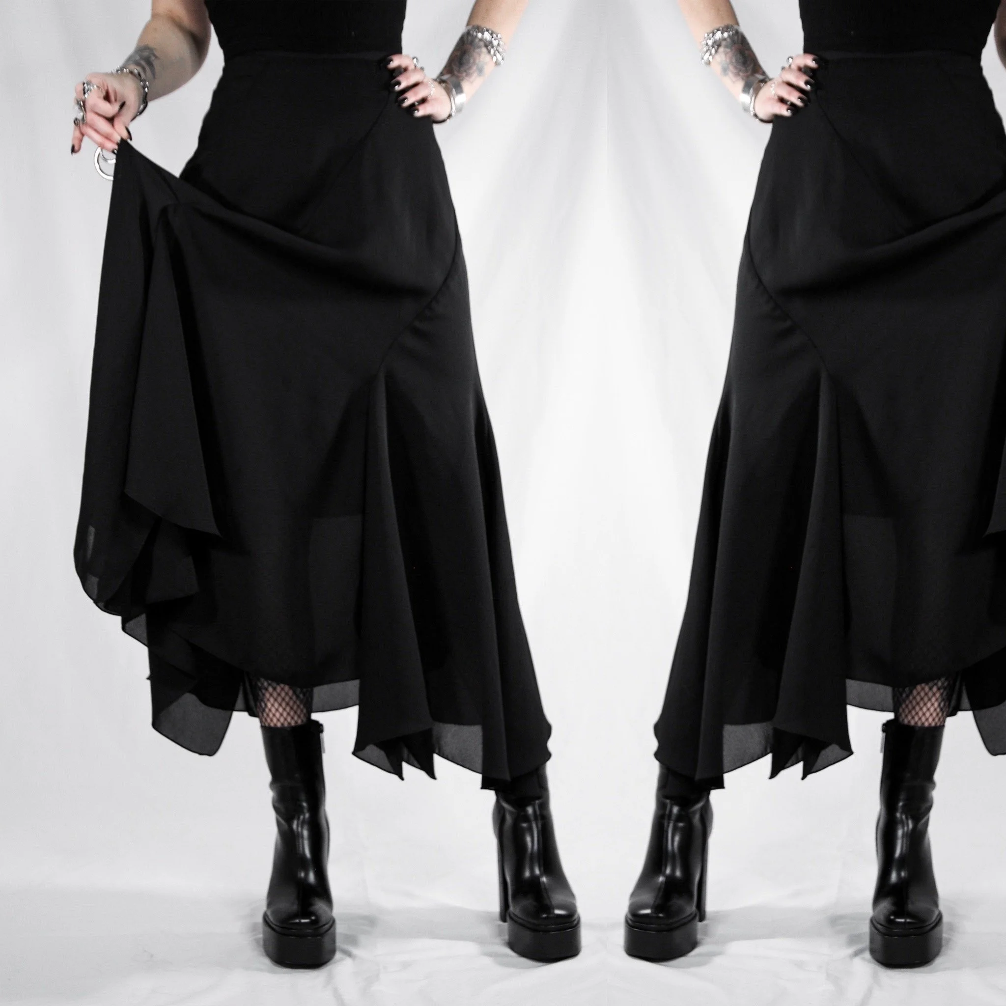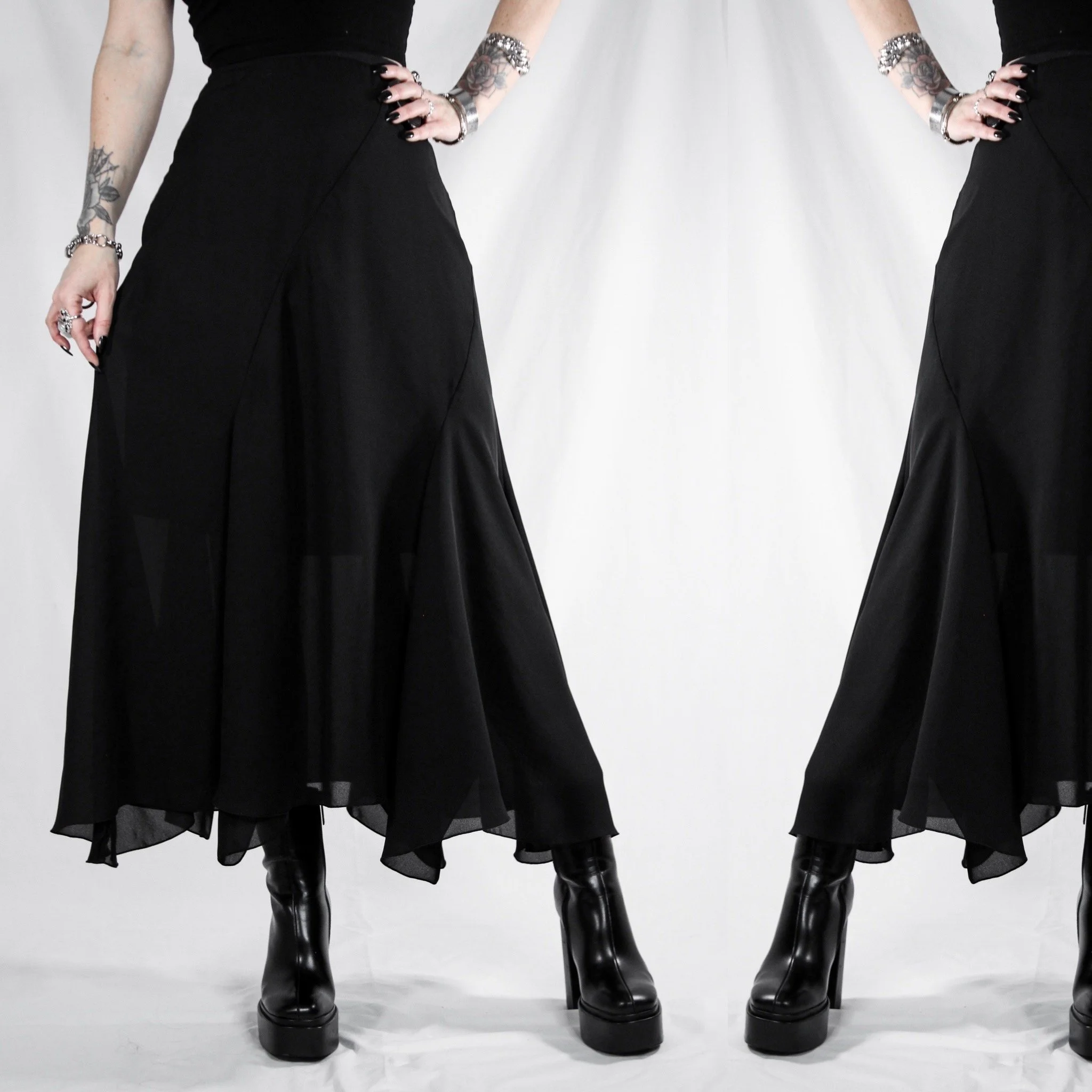Vintage 90s Conrad C. witchy maxi skirt. One of our signature styles, perfectly formal but easy to layer and style for more casual fits. High waist, fitted through the waist and hips with a flowy, flared asymmetrical mermaid hem. Semi-sheer poly chiffon overlay, fully lined in a separate layer of shiny, soft poly. No stretch. Side zip with hook closure at the top.