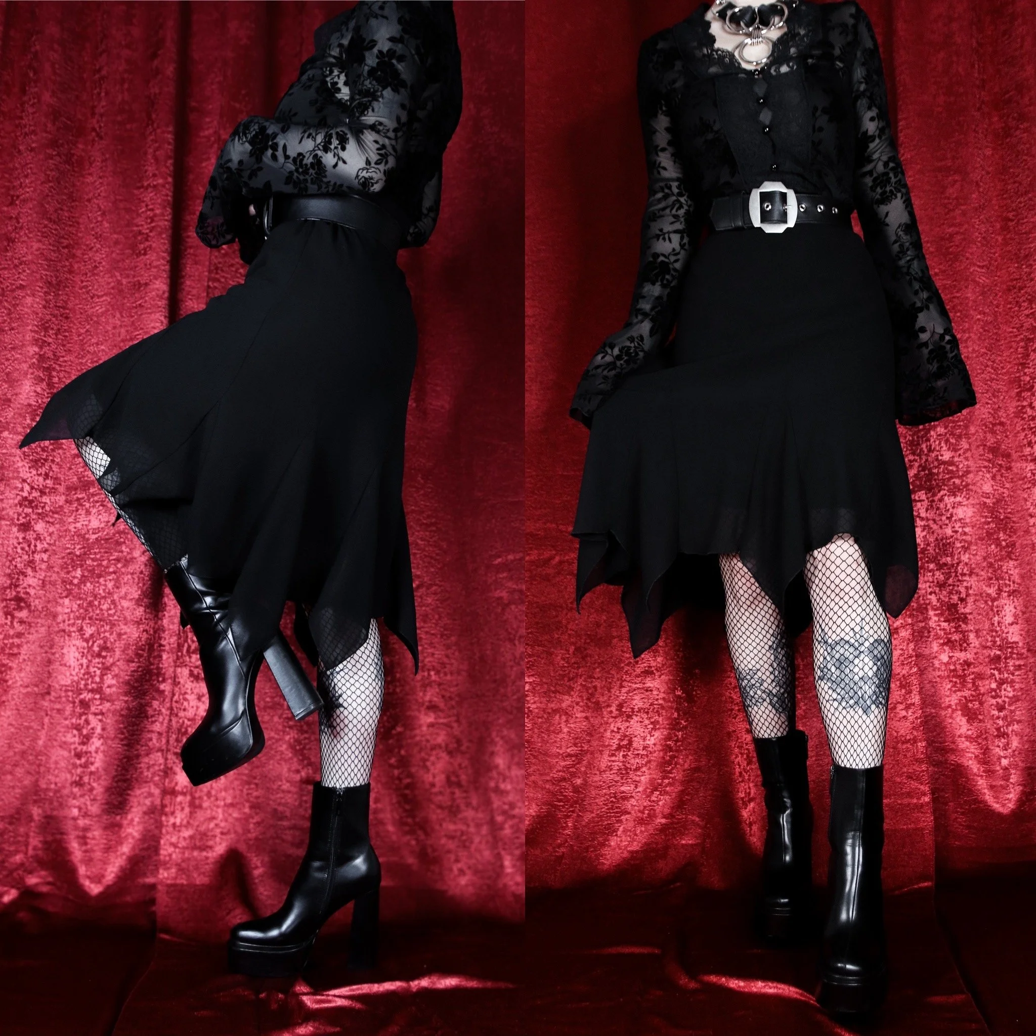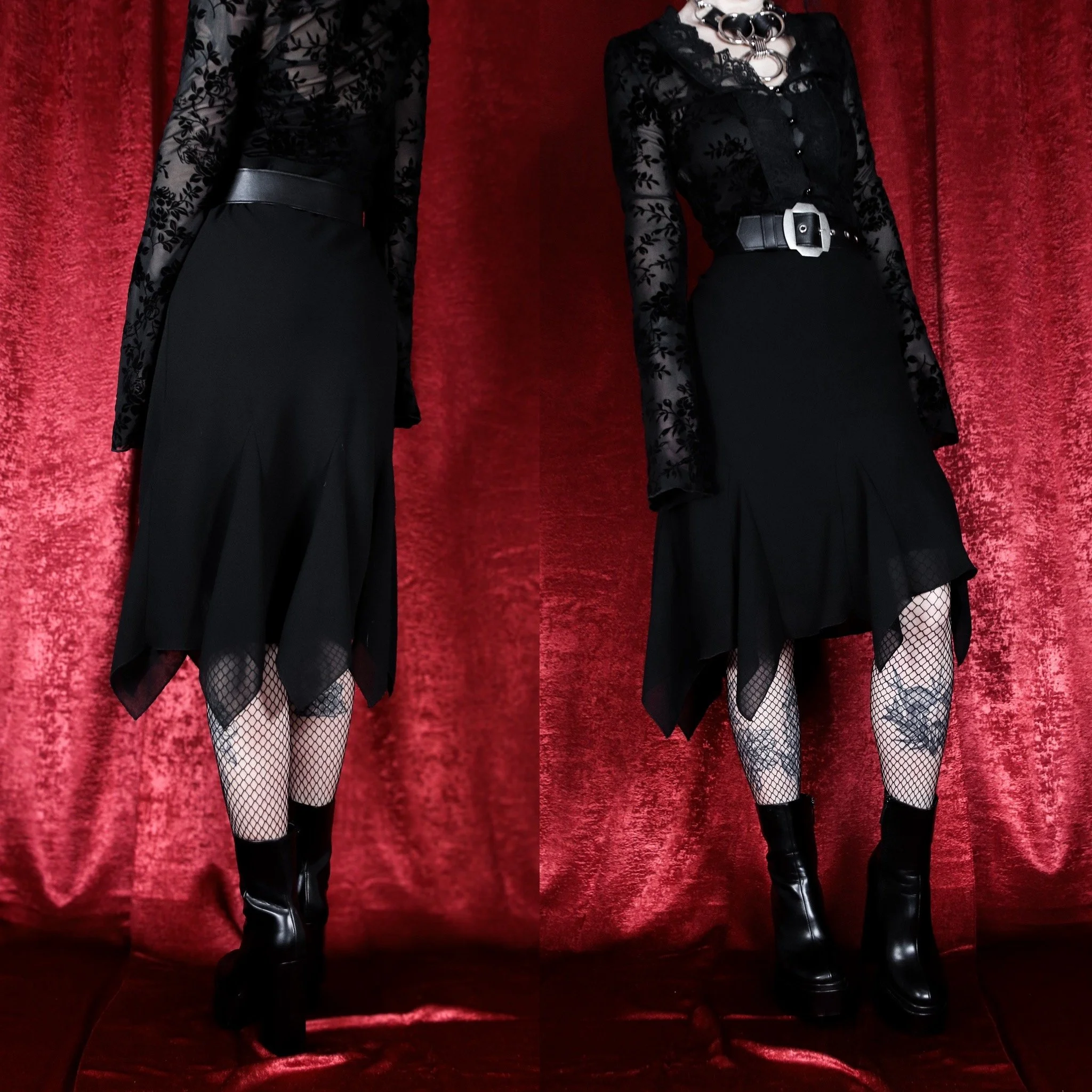 Vintage 90s Studio 1940 bat-hem skirt. 100% semi-sheer poly with a layered, draped batwing-style asymmetrical hemline. The perfect witchy skirt! Partially lined in black poly satin. Pull-on style with an elastic waist. Fully lined in a separate layer of soft black poly nylon. No stretch other than the waist. Classic, comfortable and easy to dress up or down!