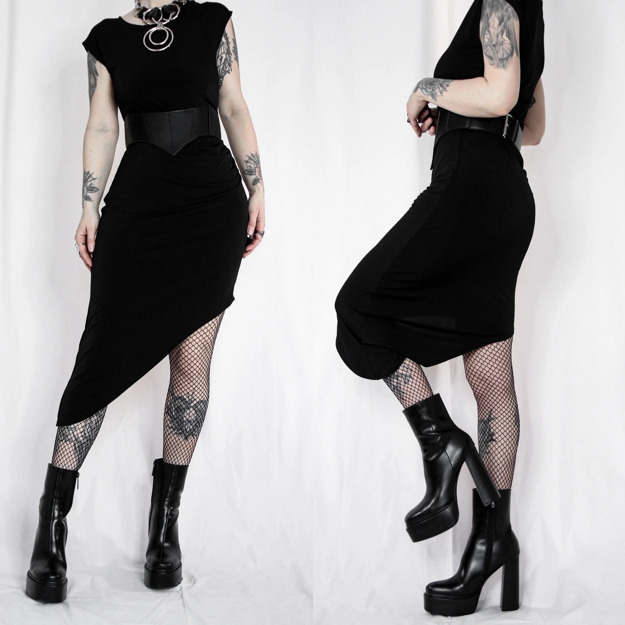 Y2K BCBG asymmetrical shift dress. Such a fun staple piece and can easily be styled for the office! Flowy asymmetrical hemline, longer on one side. Side ruching with the bodycon fit is VERY flattering and helps snatch your waist. Lightweight and breathable, 96-4 poly-spandex fabric is smooth, soft, and stretchy all over. Pull-on style, unlined. Style with your favorite statement belts and harnesses for some extra edge.