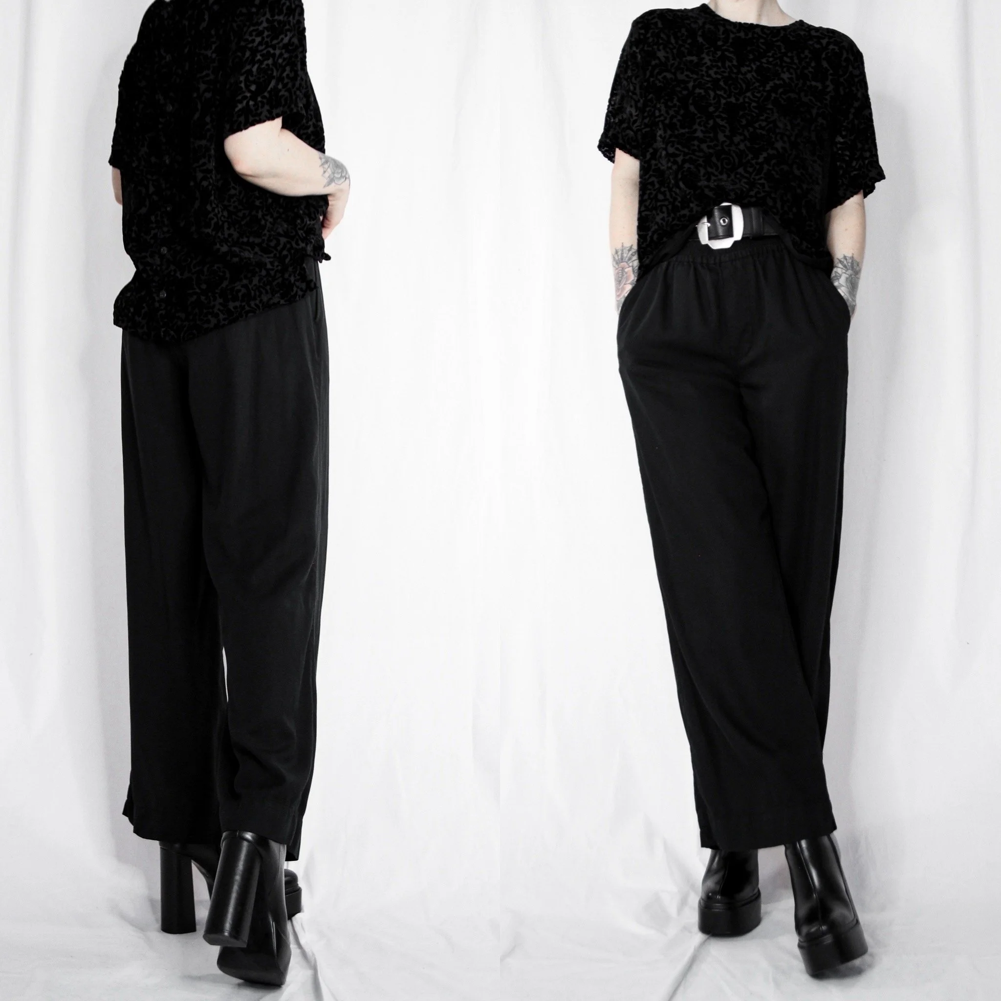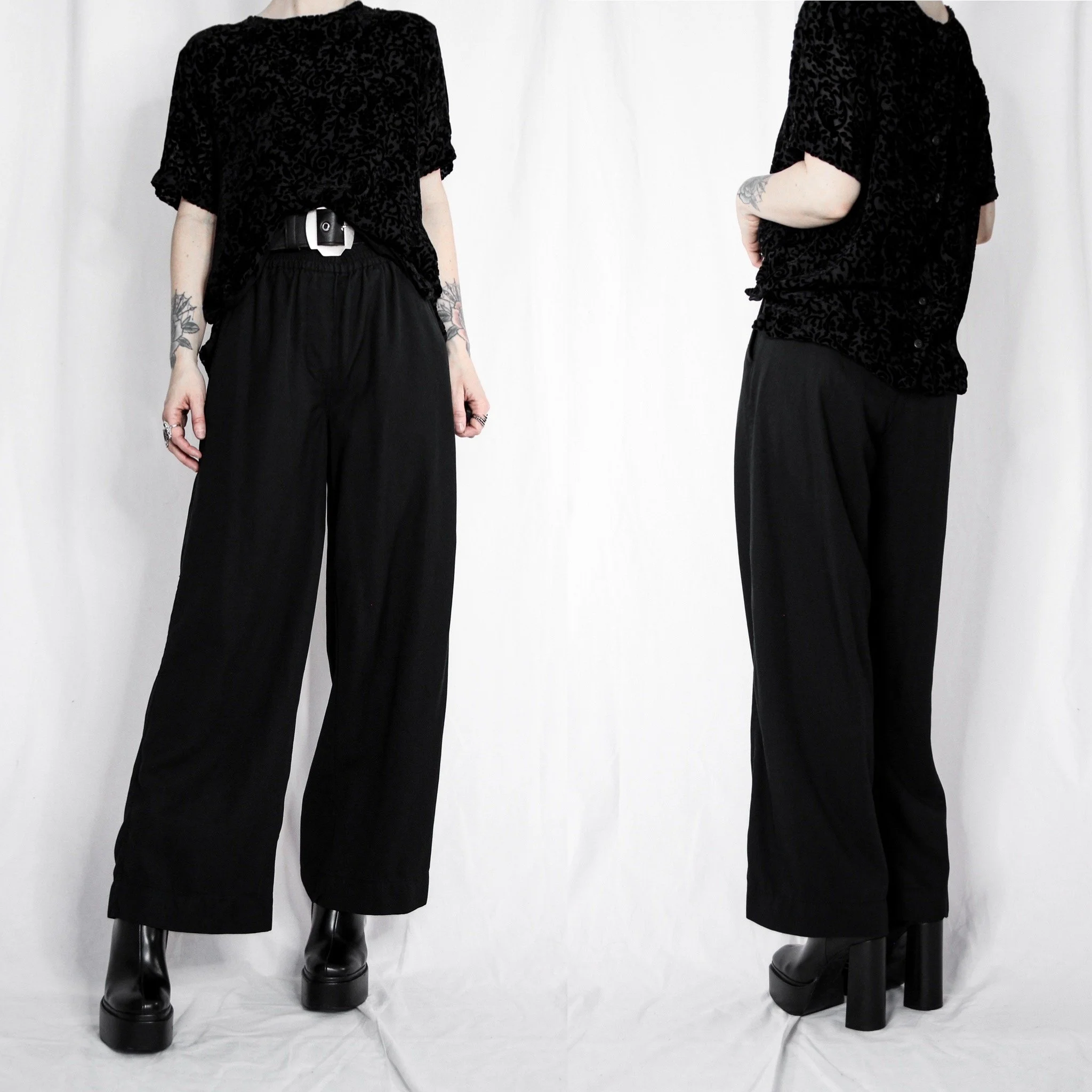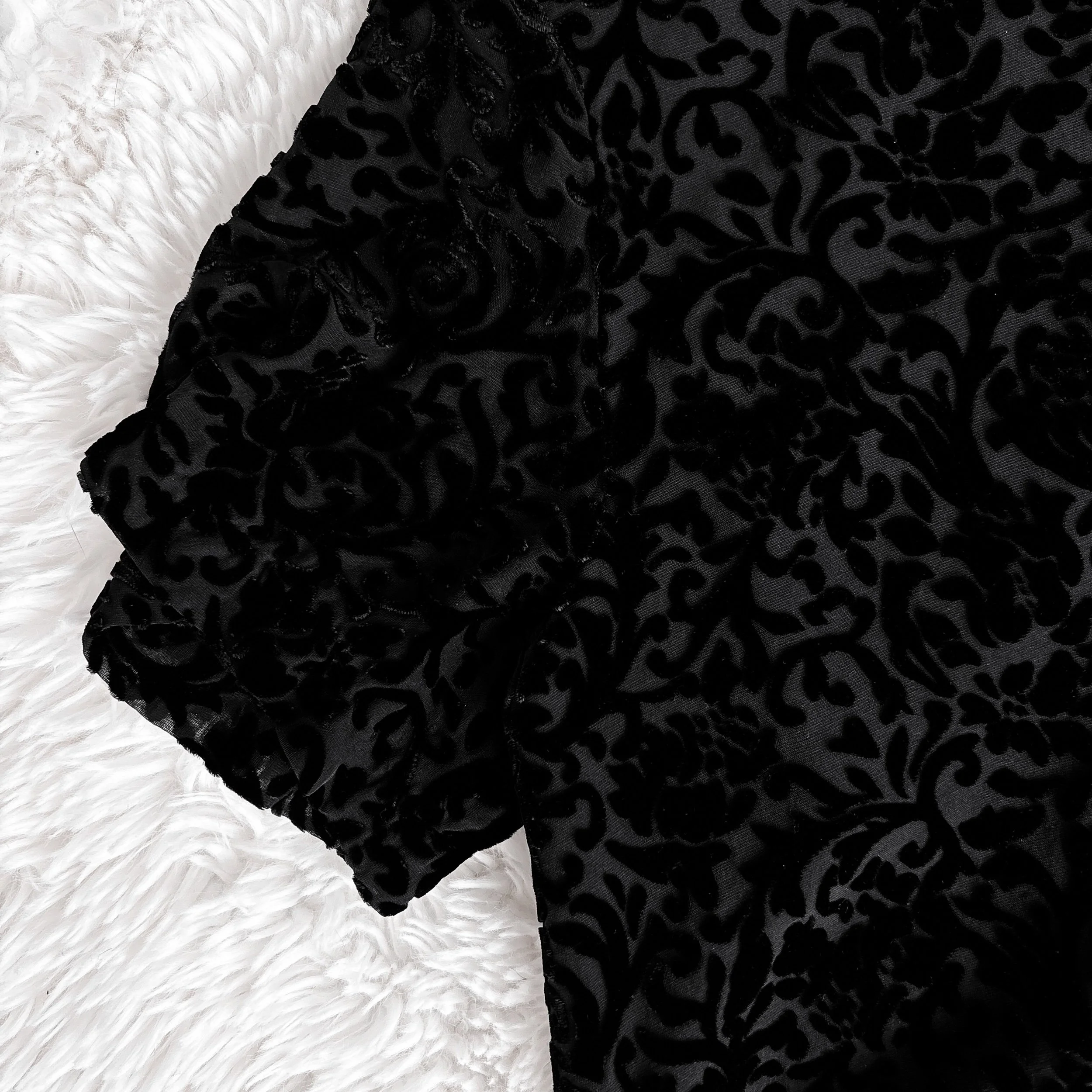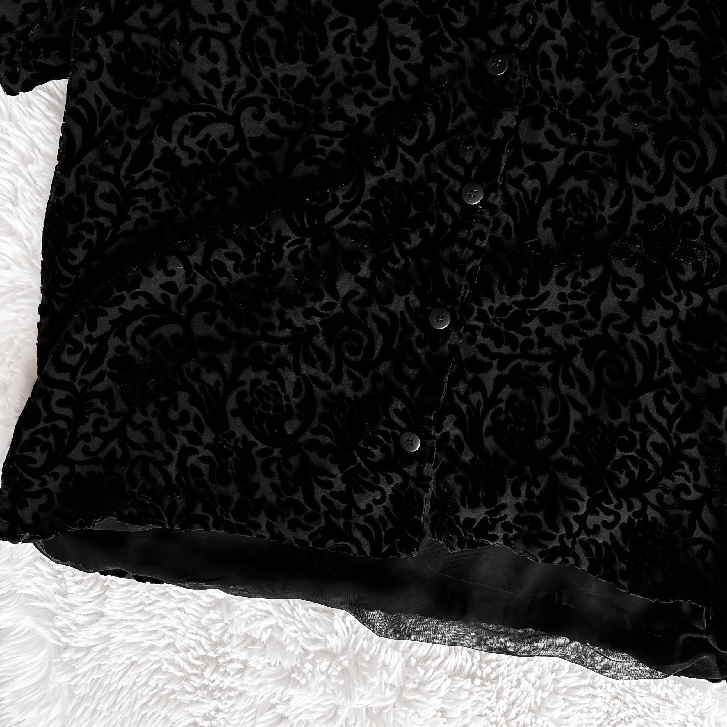 Vintage 90s velvet top. Perfect for the office goths! Lightweight black-on-black floral devoré velvet burnout. Fully lined in a separate layer of black mesh. Roomy short sleeves with functional buttons up the front and a round neckline. Boxy cut. Unlined, no stretch. Can be worn reversible with the buttons in the front of back!