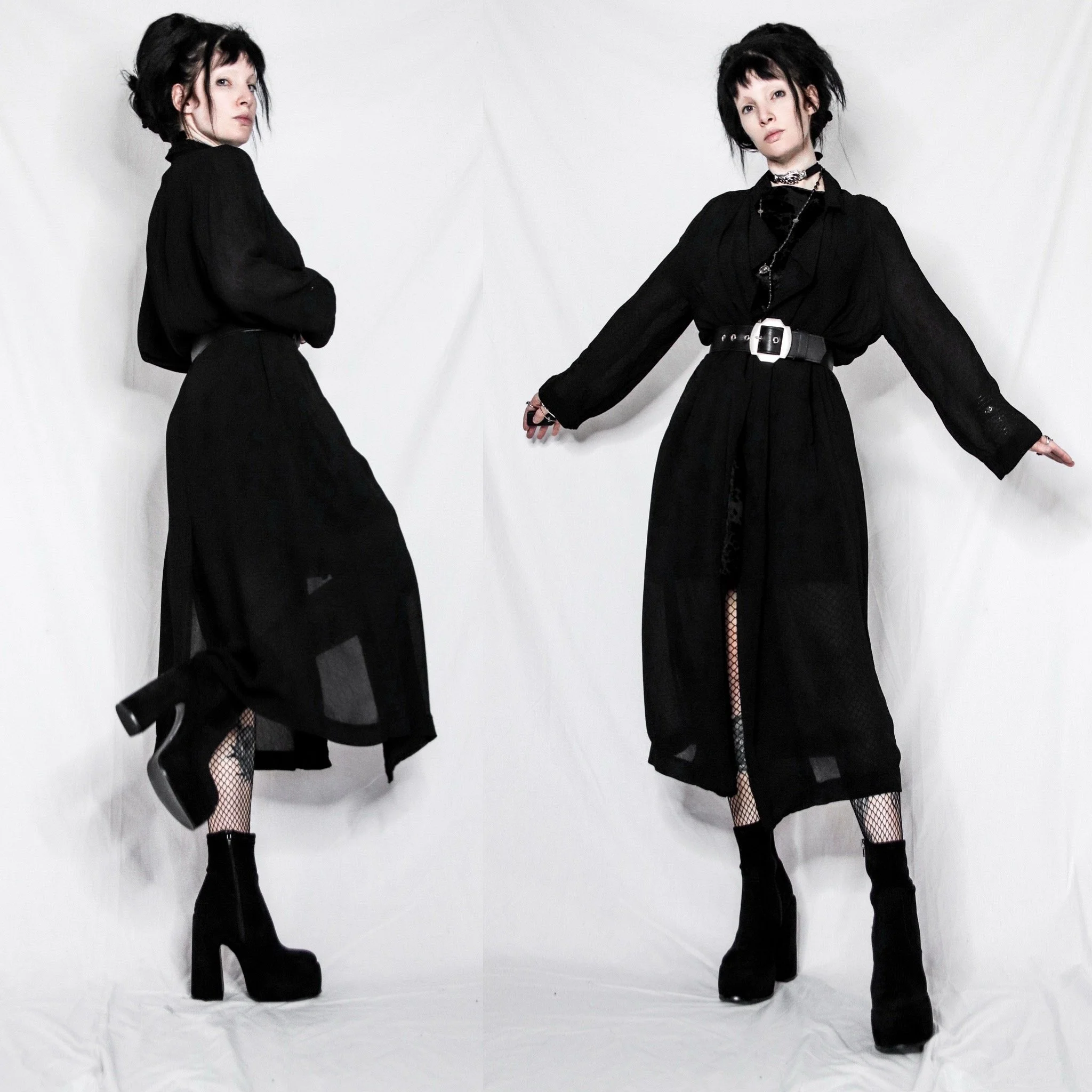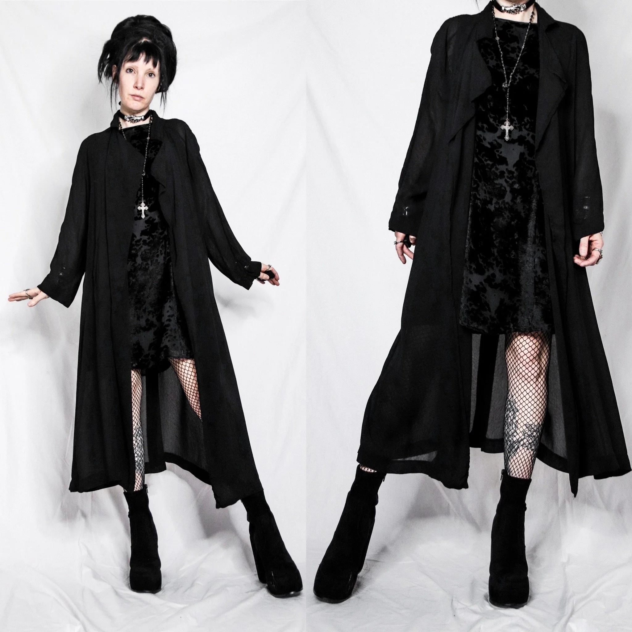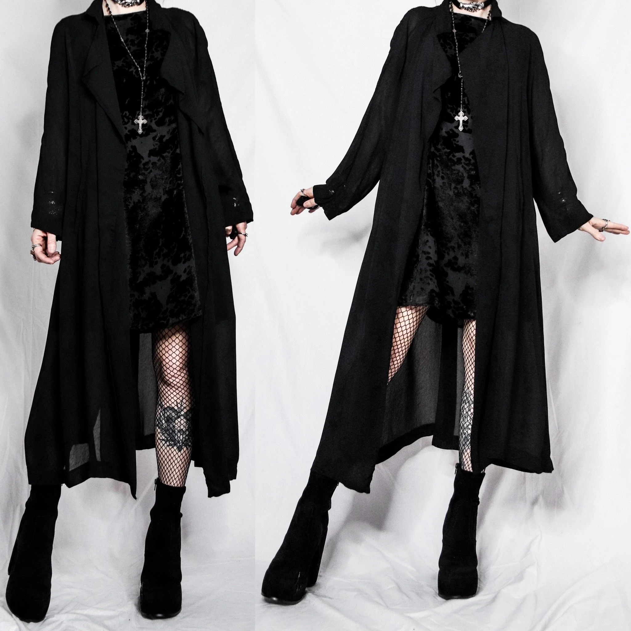 Vintage 90s Jessica Howard sheer black full-length duster robe. Can be styled as a cardigan or overdress, depending how you layer and belt it! Sheer poly-viscose with gorgeous draping. Flowy, boxy cut, open front style with loose sleeves. Foldover collar with waterfall lapels. Unlined, no stretch. Deep side pockets (this item appears never worn, the pockets are still shown shut.) Belt loops on either side of the waist and around the back. Back slit at the hem.
