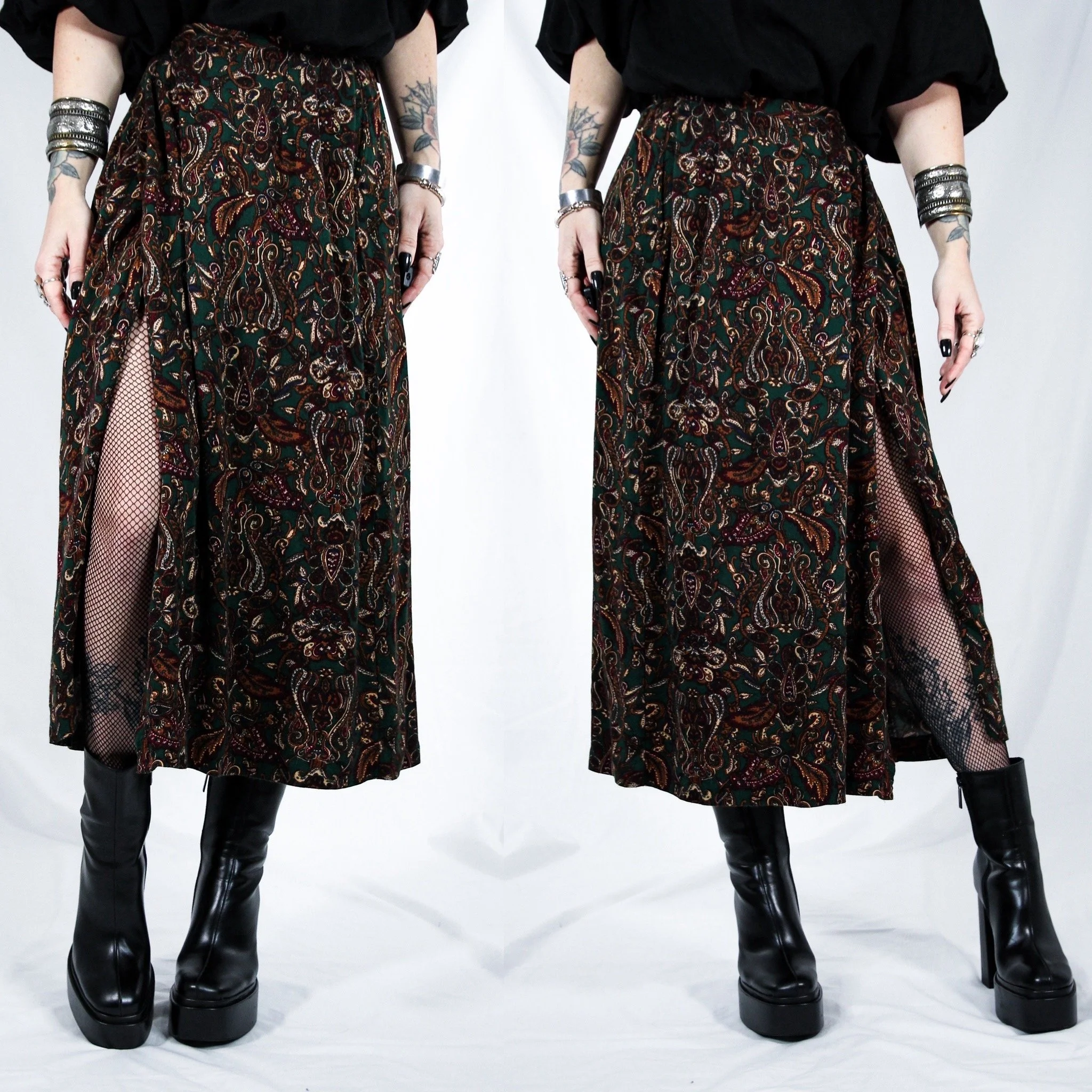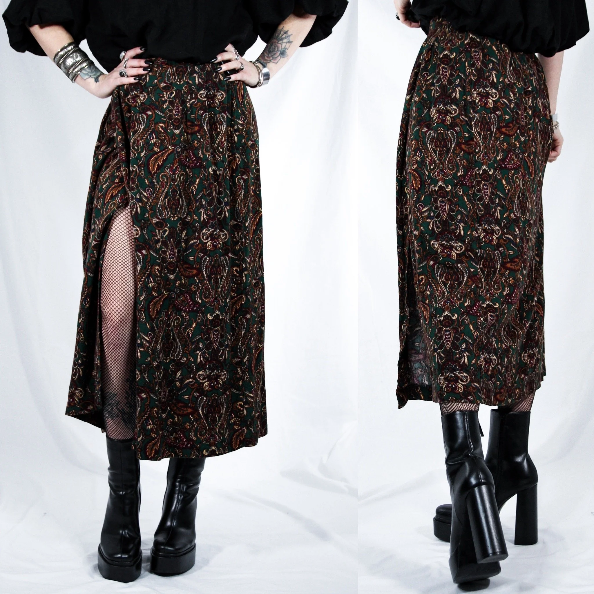 Vintage 80s Worthington paisley maxi wrap skirt. Such a perfect staple skirt for fall, winter and the holidays. Features a full-length faux-wrap front panel that goes all the way up to the waist, so you can show some leg depending on how you drape it! Dark paisley pattern in burgundy, brown, black and dark jade green. Midweight 100% rayon - super soft with lots of flowy movement. Straight cut. Unlined, no stretch. Back zip with button closure at the top.